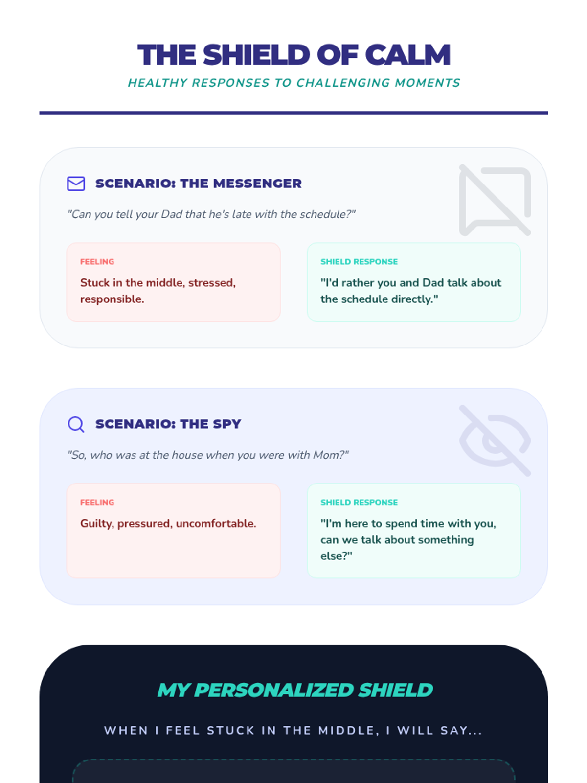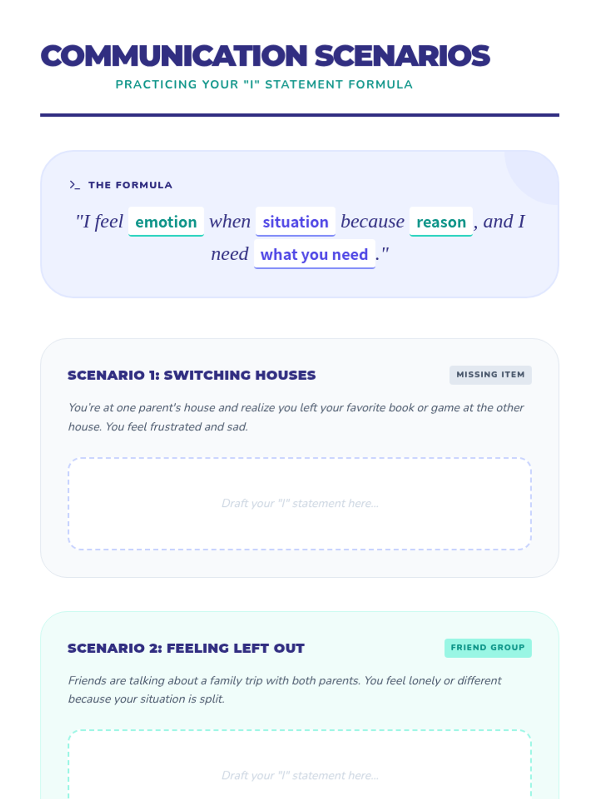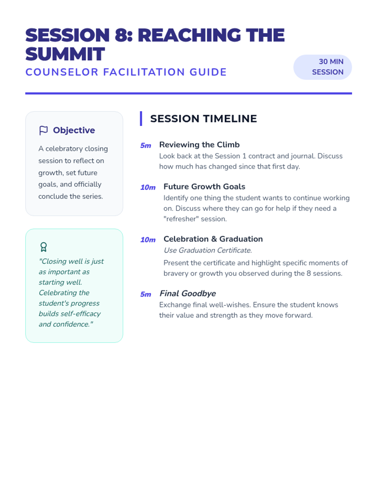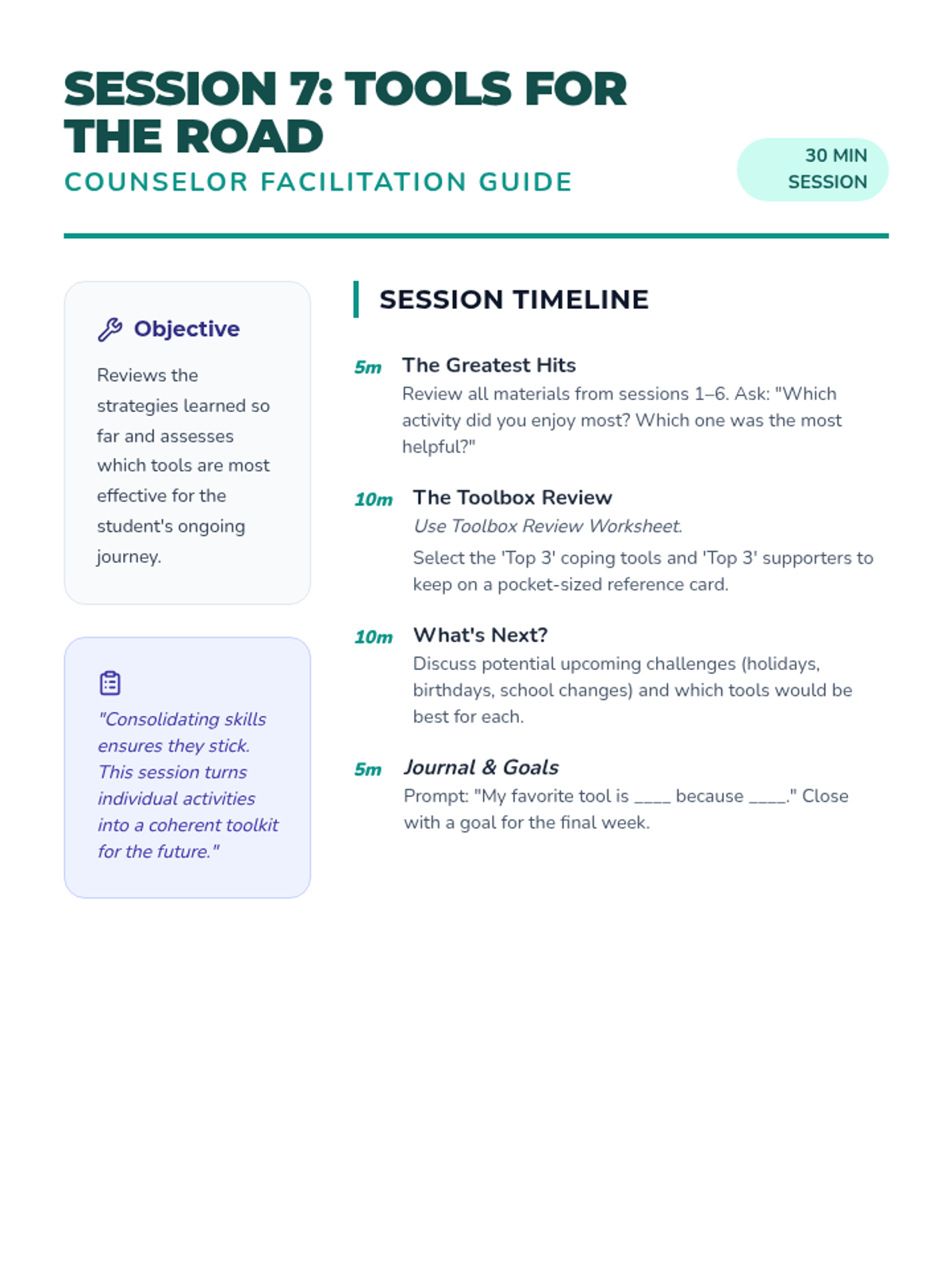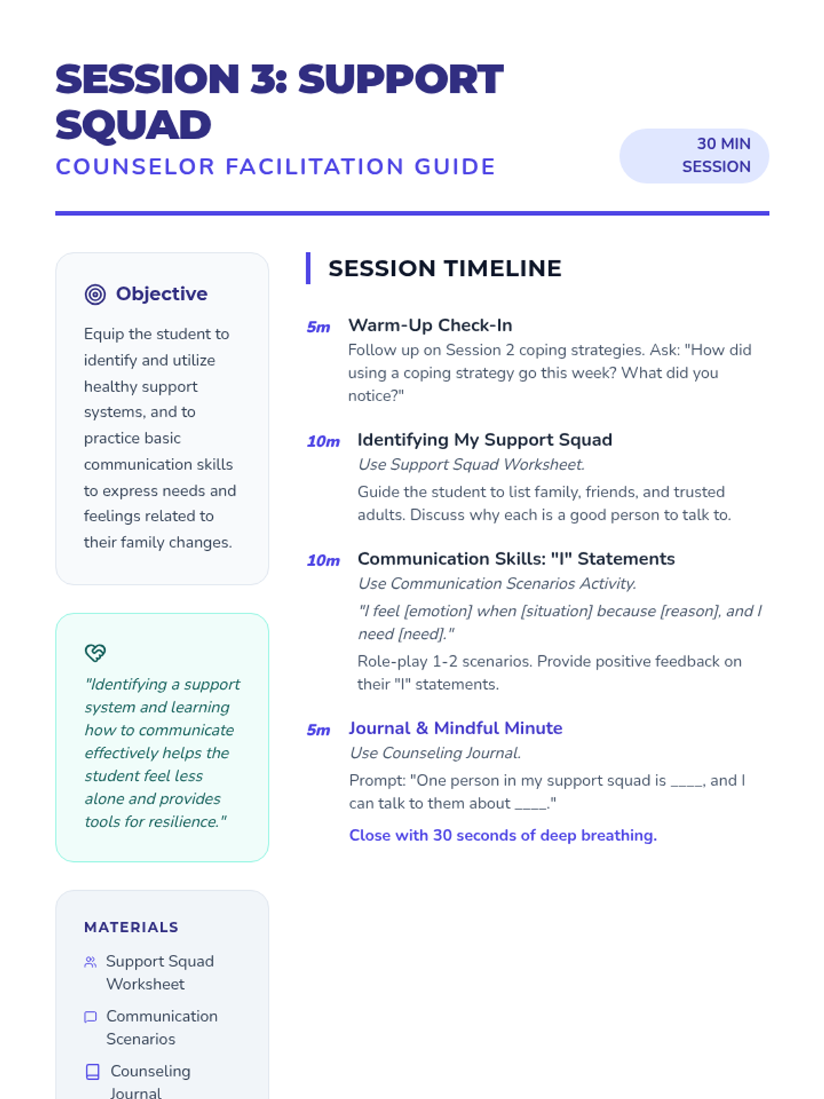 An 8-session individual counseling series for a 6th-grade student navigating their parents' divorce. This sequence focuses on building trust, emotional regulation, coping strategies, communication skills, and resilience across two households.