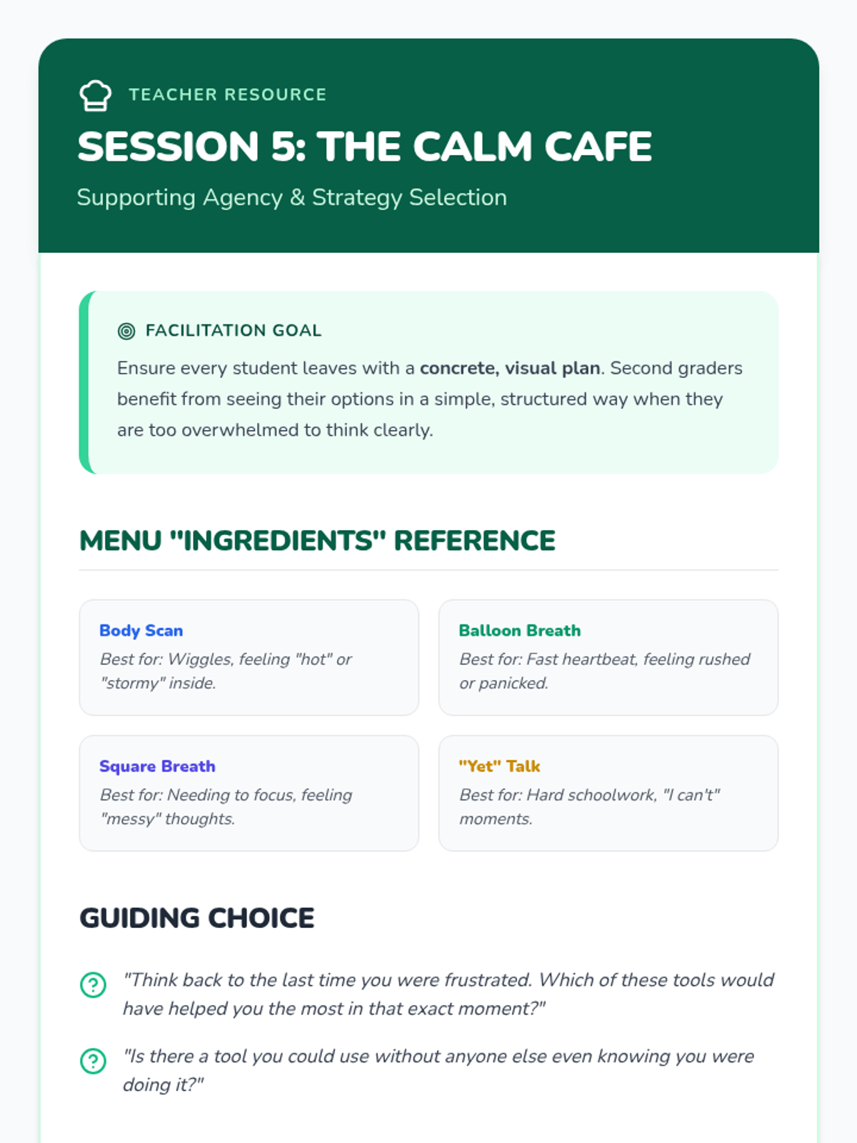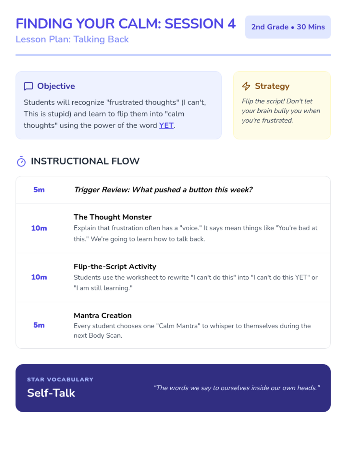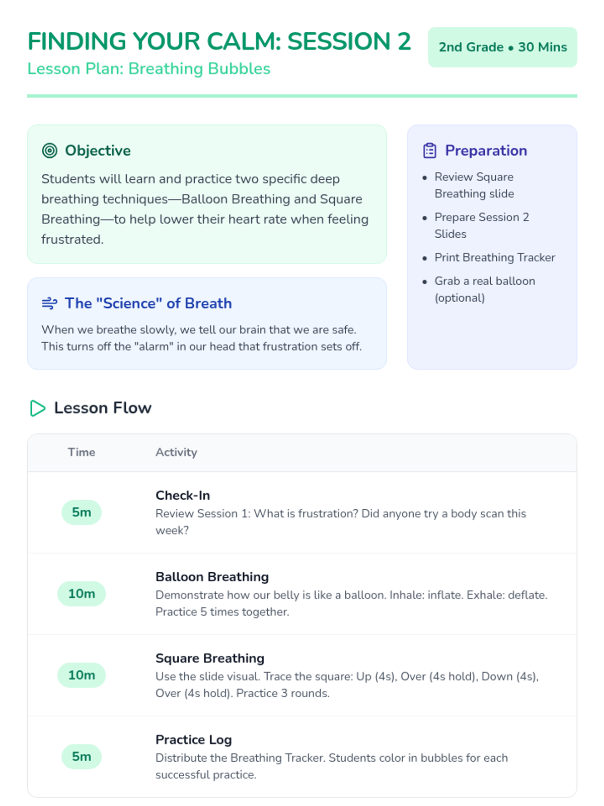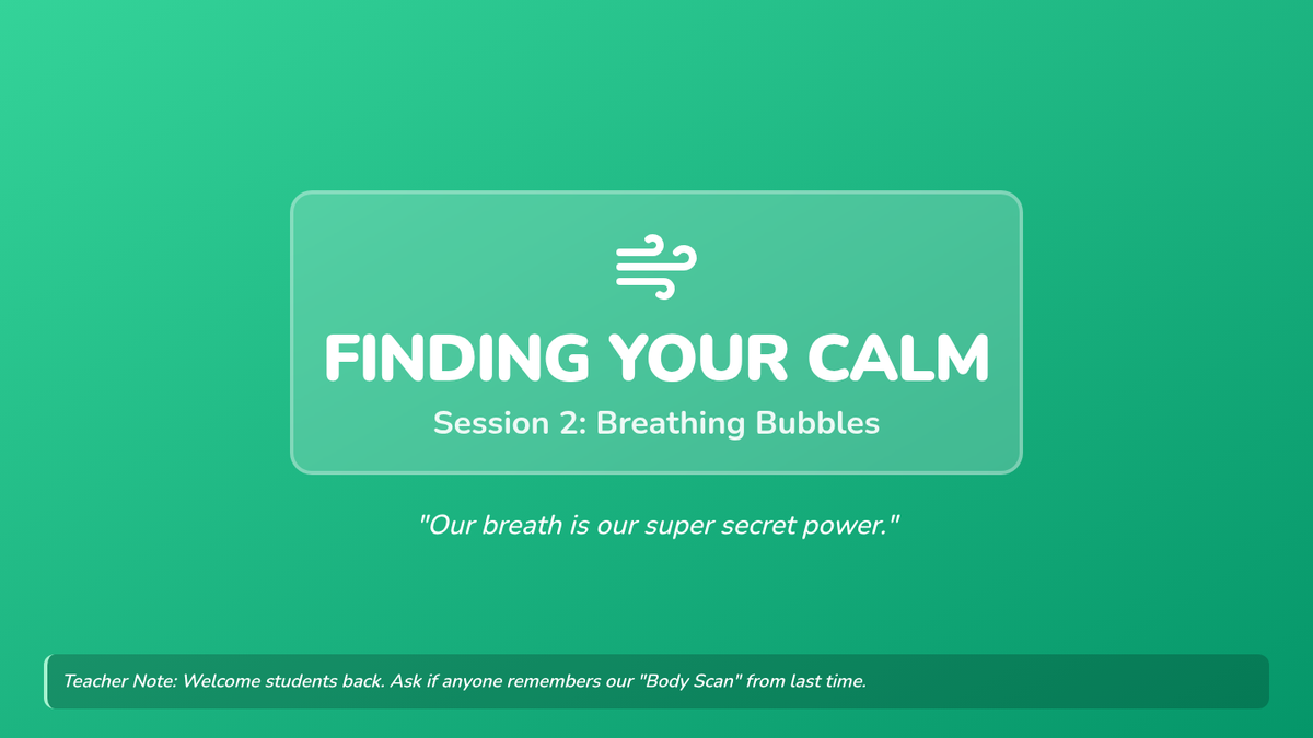 A 6-session social-emotional learning series for 2nd graders to help them identify frustration and build a toolkit of calming strategies including grounding, breathing, and positive self-talk.