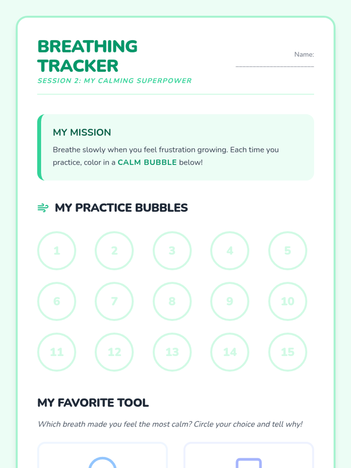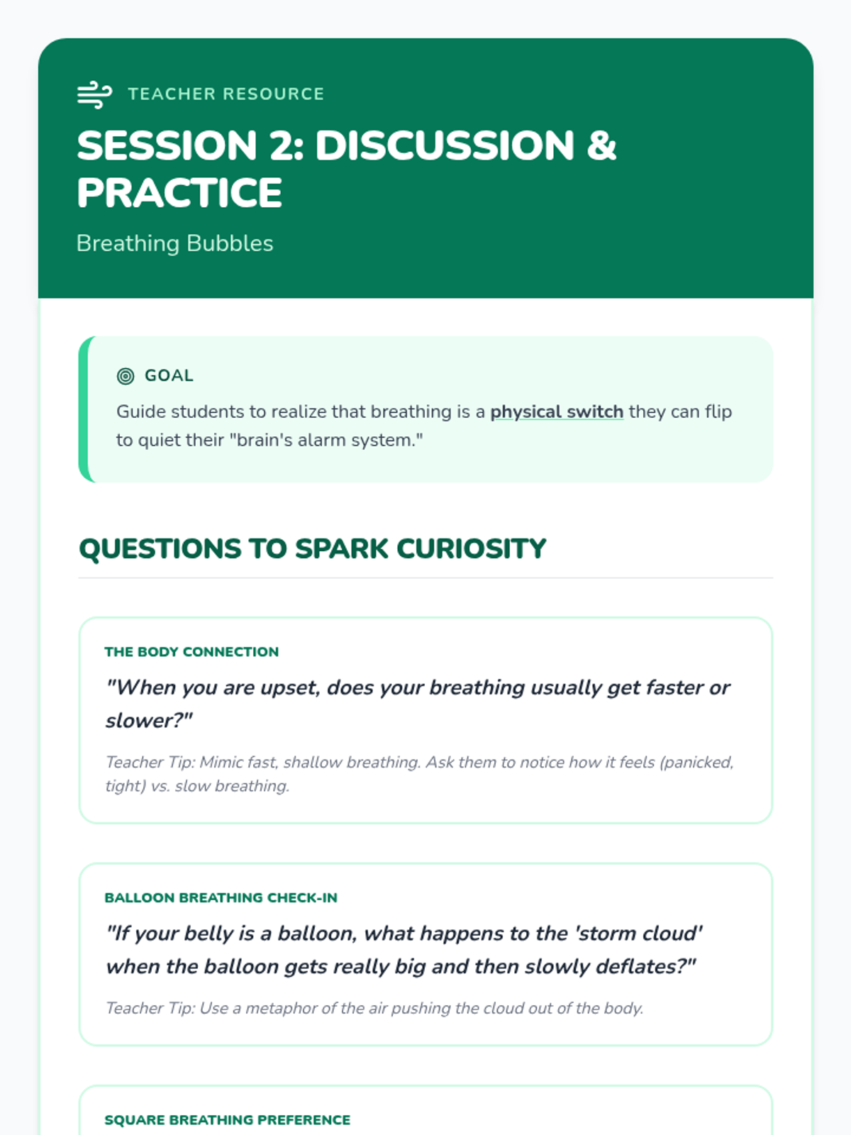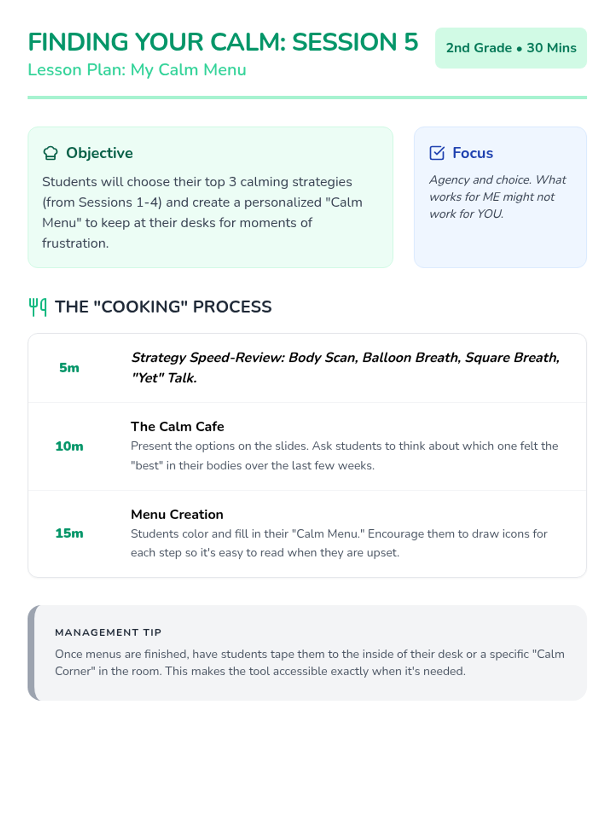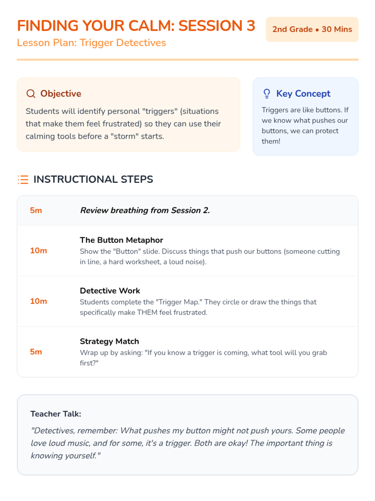 A 6-session social-emotional learning series for 2nd graders to help them identify frustration and build a toolkit of calming strategies including grounding, breathing, and positive self-talk.