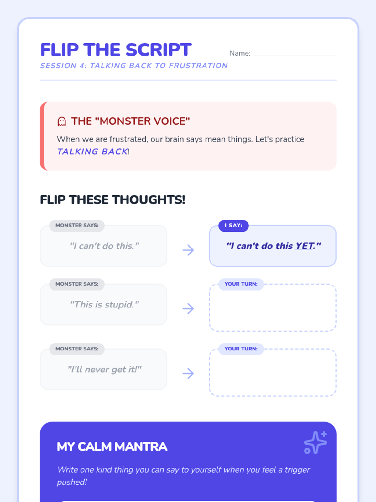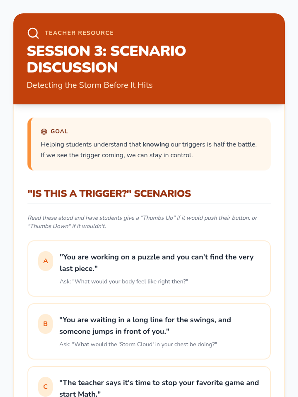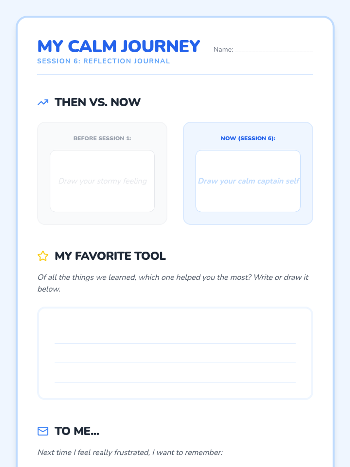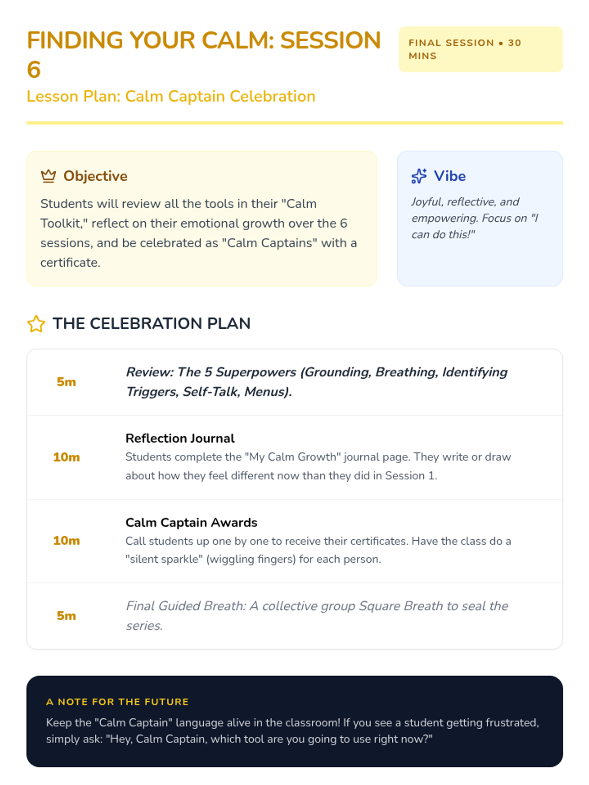 A 6-session social-emotional learning series for 2nd graders to help them identify frustration and build a toolkit of calming strategies including grounding, breathing, and positive self-talk.