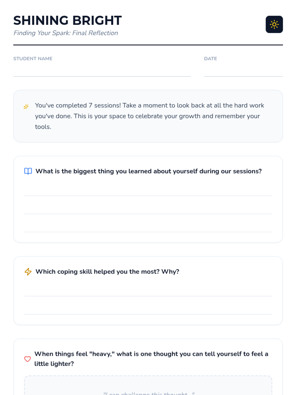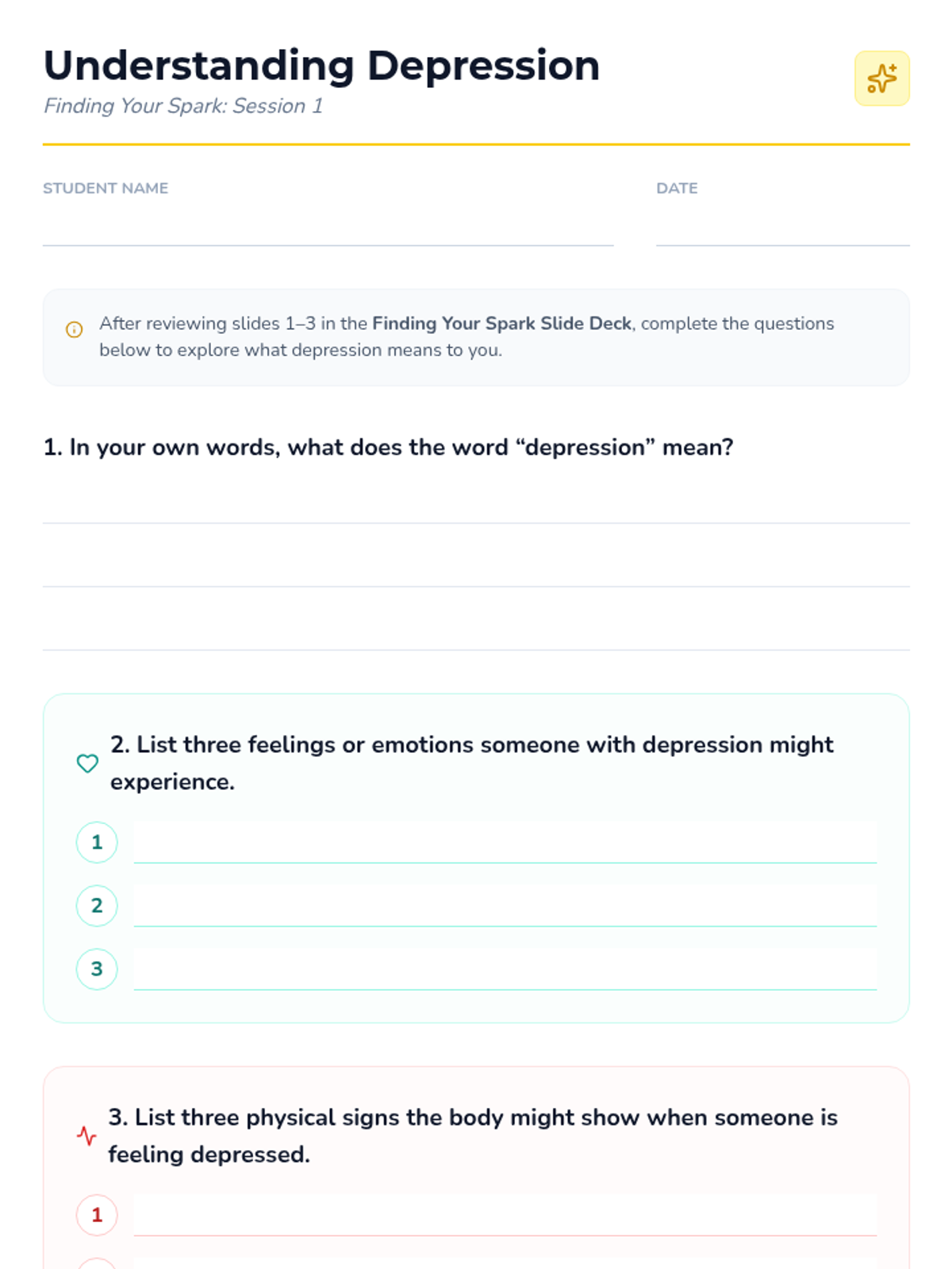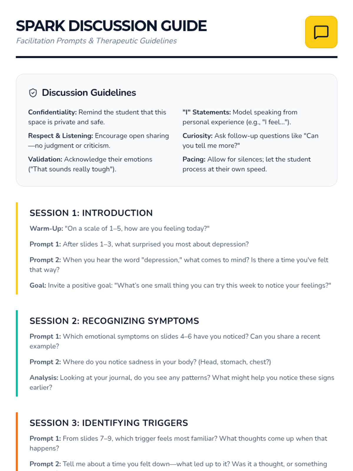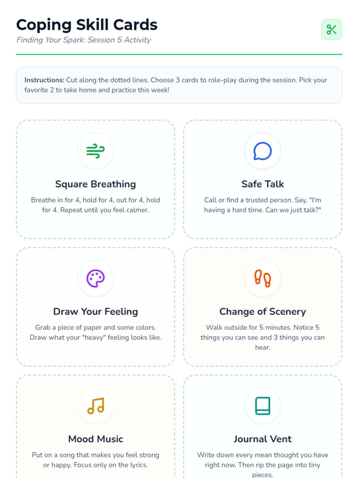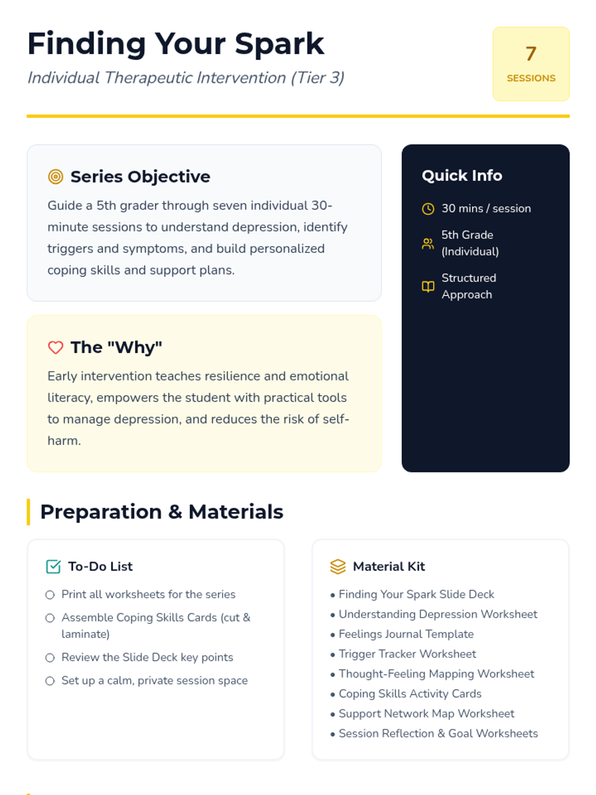 A seven-session individual therapeutic series for 5th graders to understand depression, identify triggers, and build resilience through coping skills and support networks.