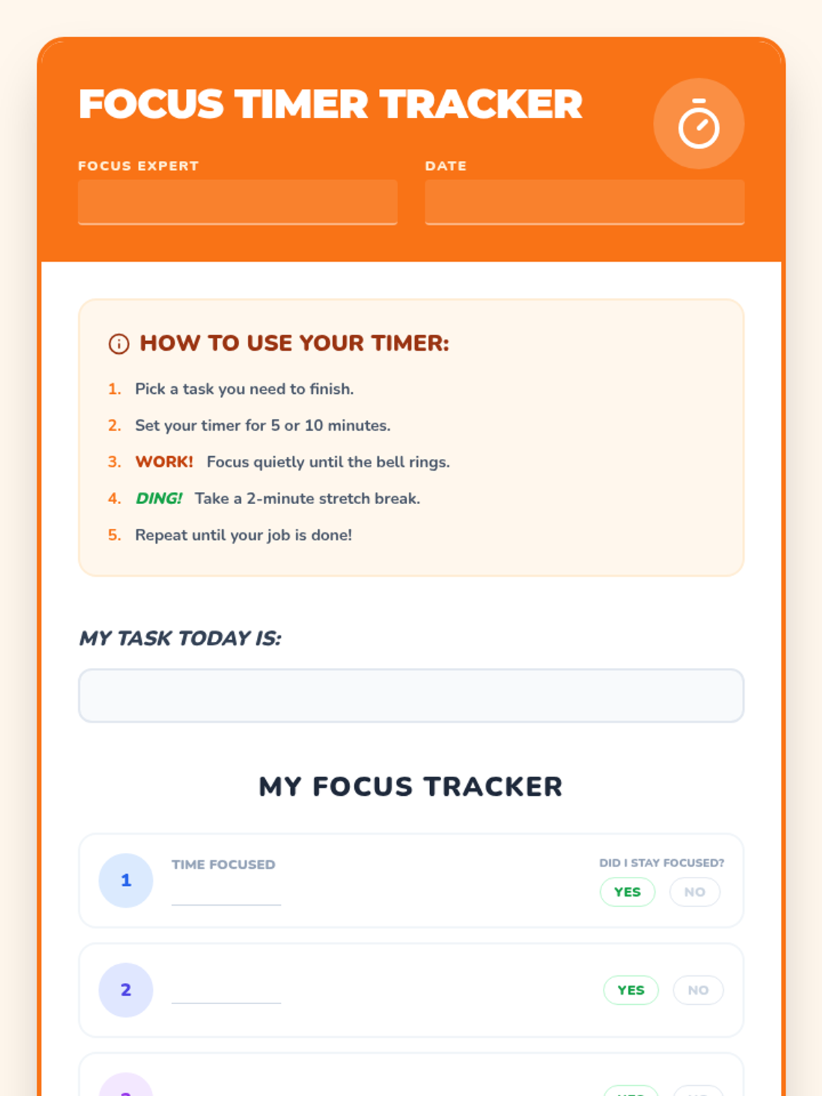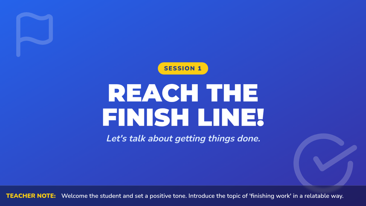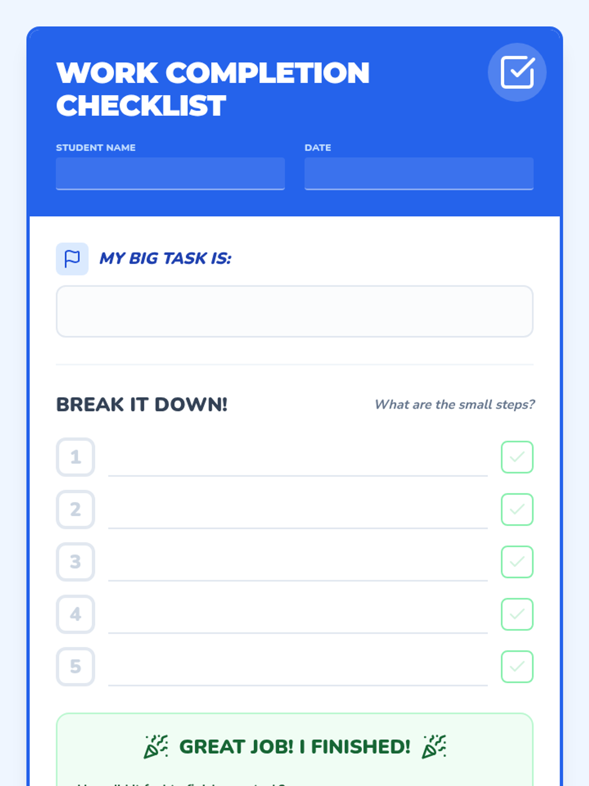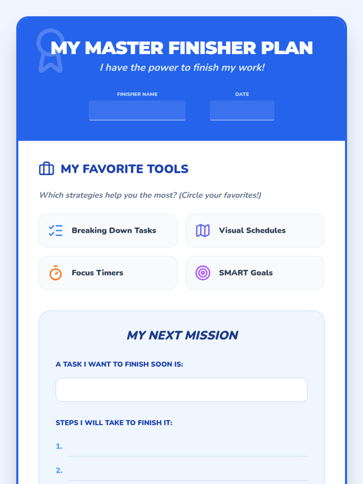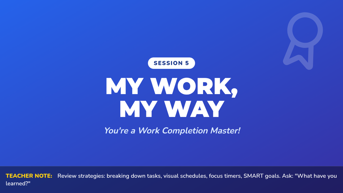 A 5-session intensive program for individual special education students to develop work completion habits through task decomposition, visual scheduling, focus techniques, and goal setting.