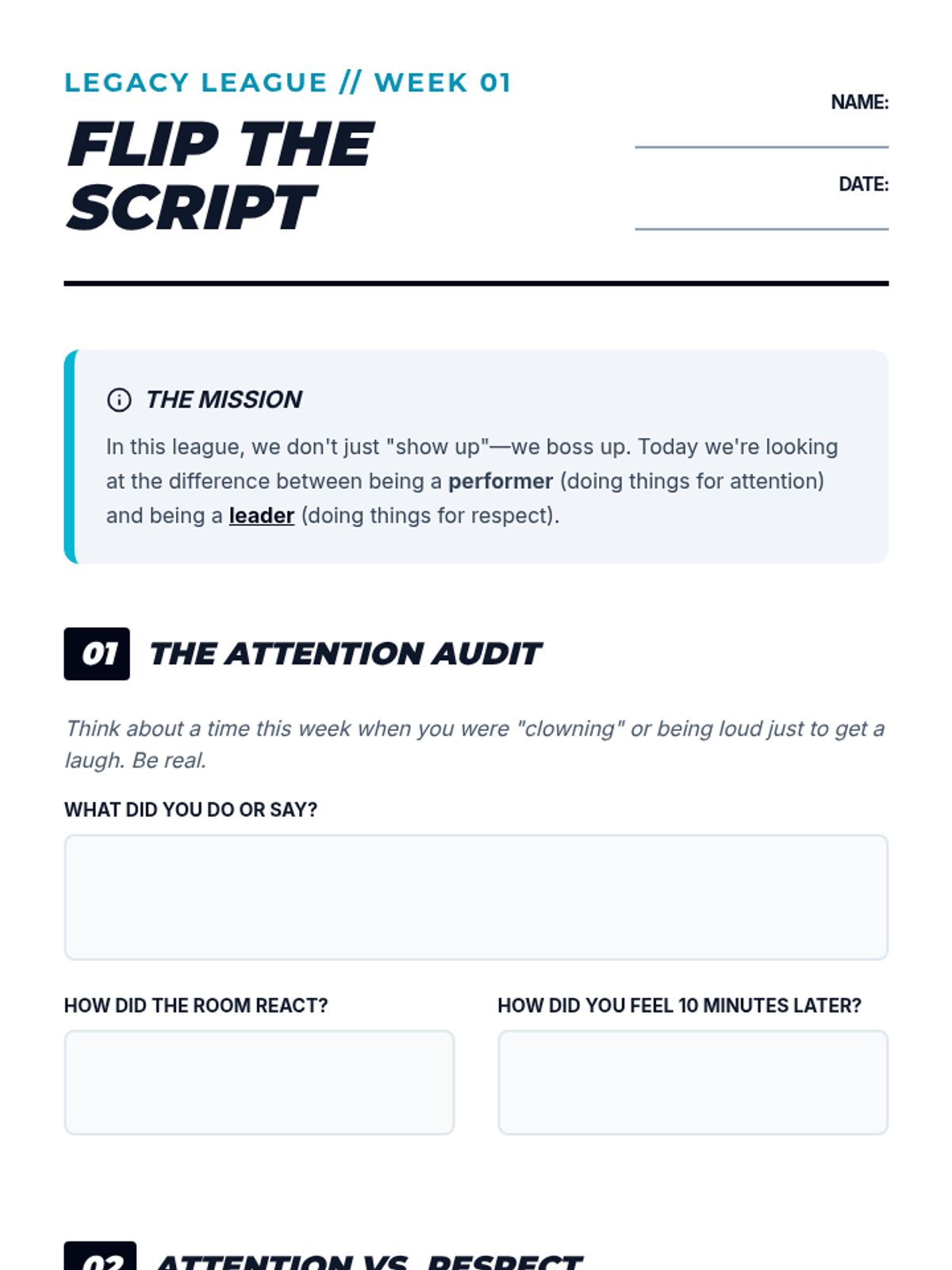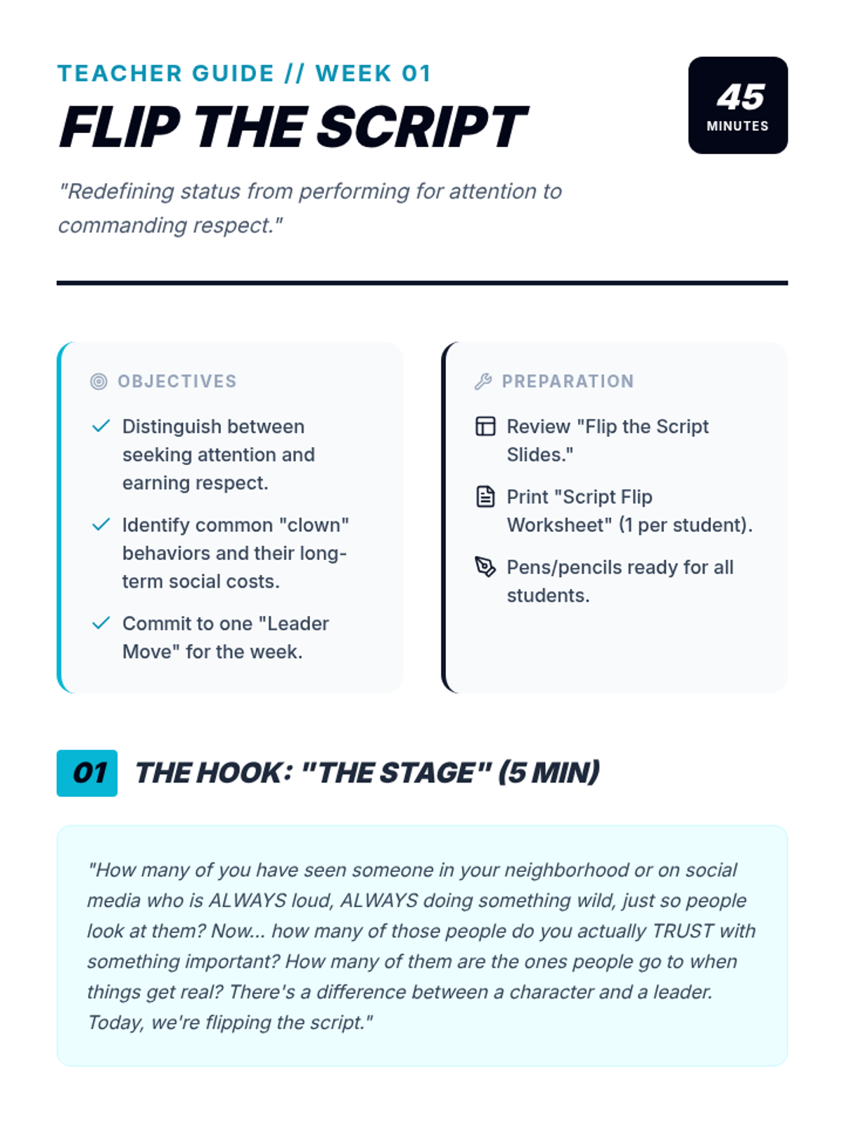 A 5-week social skills and leadership curriculum designed for 7th-grade boys in urban environments. The program transforms 'class clown' energy into positive peer leadership by focusing on respect, social awareness, and personal branding.