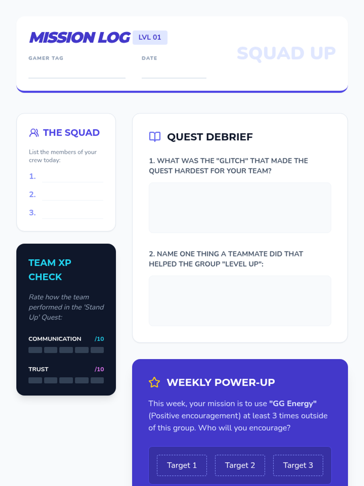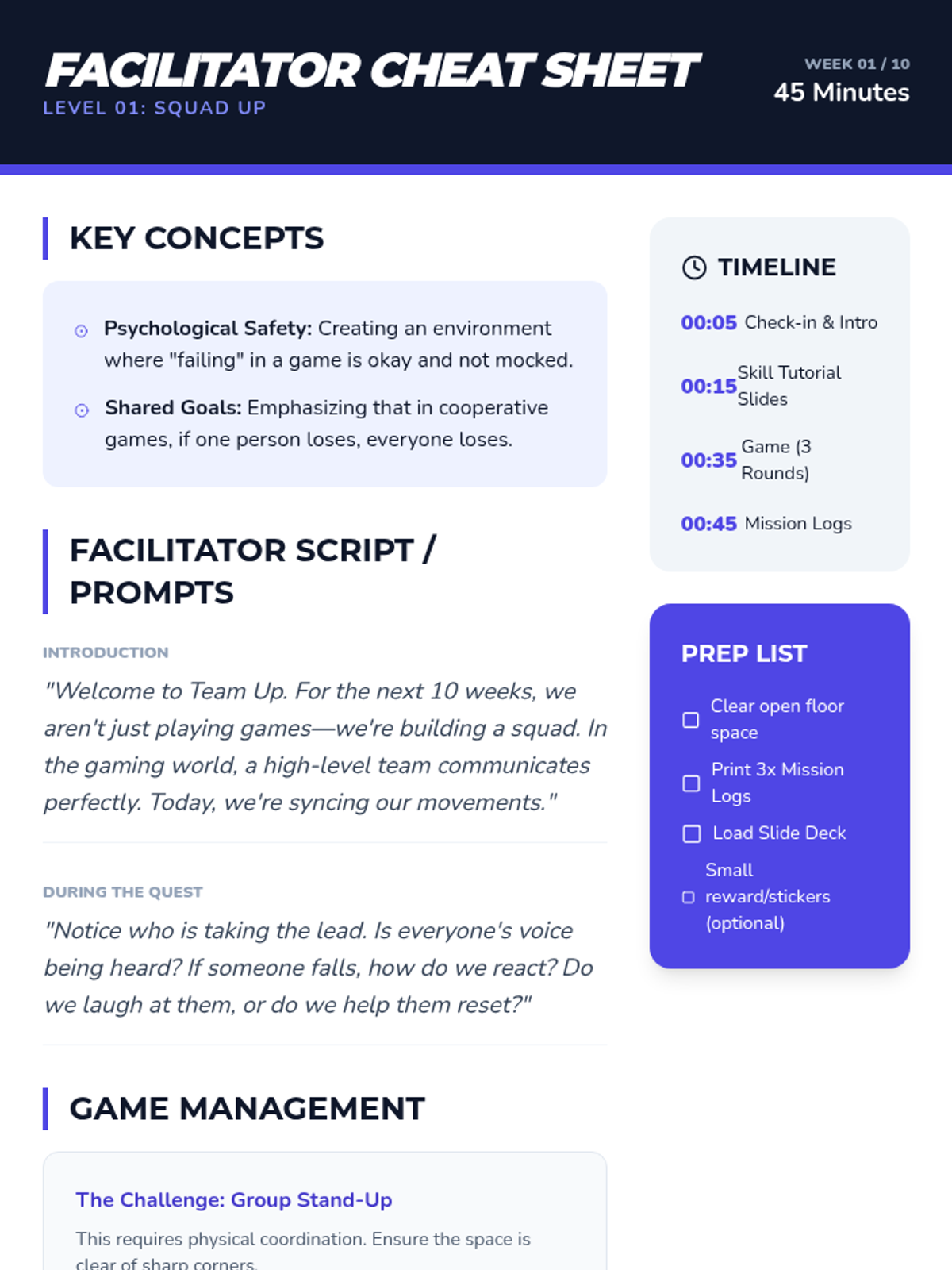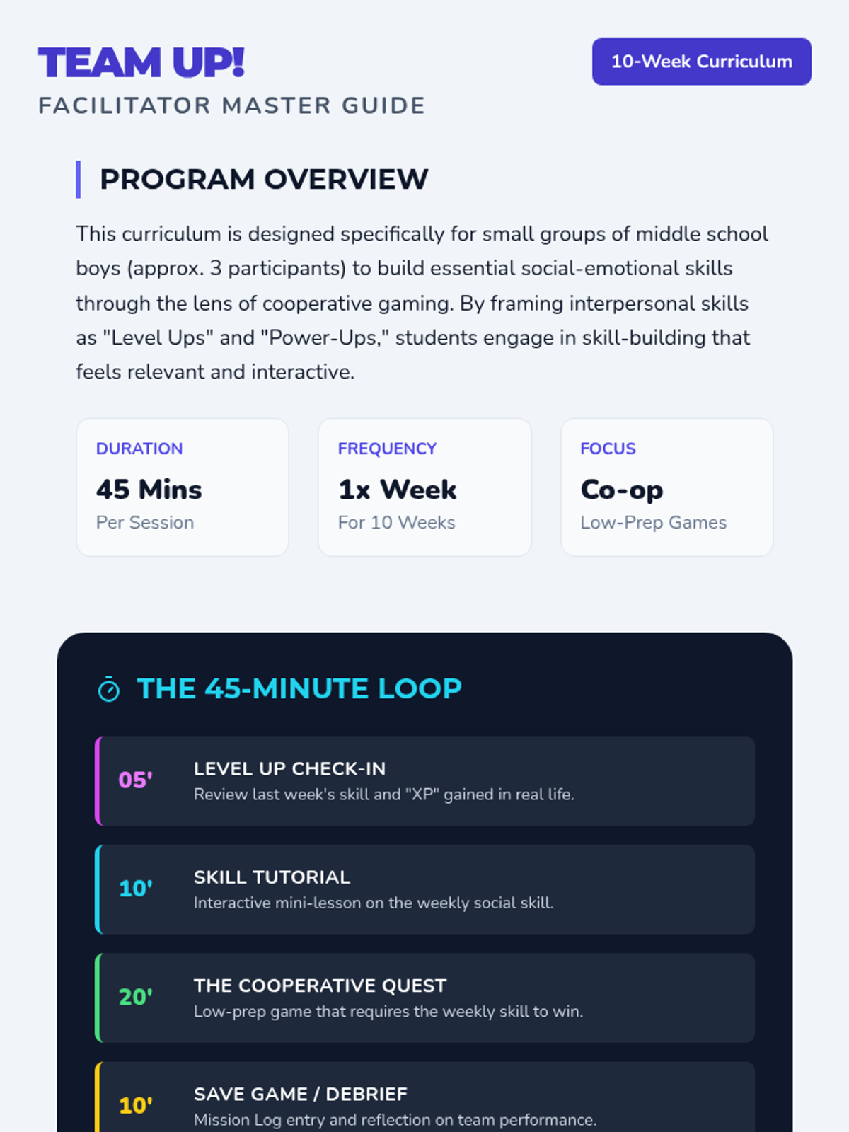 A 10-week social-emotional learning curriculum designed for 7th-grade boys, focusing on conflict resolution, communication, and teamwork through a cooperative gaming lens. Each session uses an 'arcade' theme to engage students in 'leveling up' their interpersonal skills.
