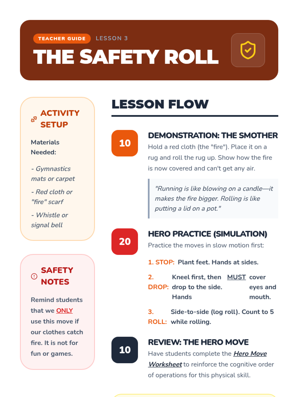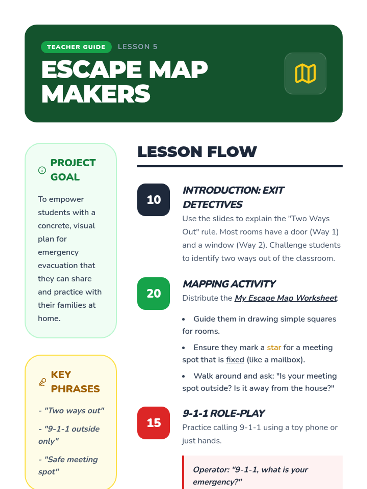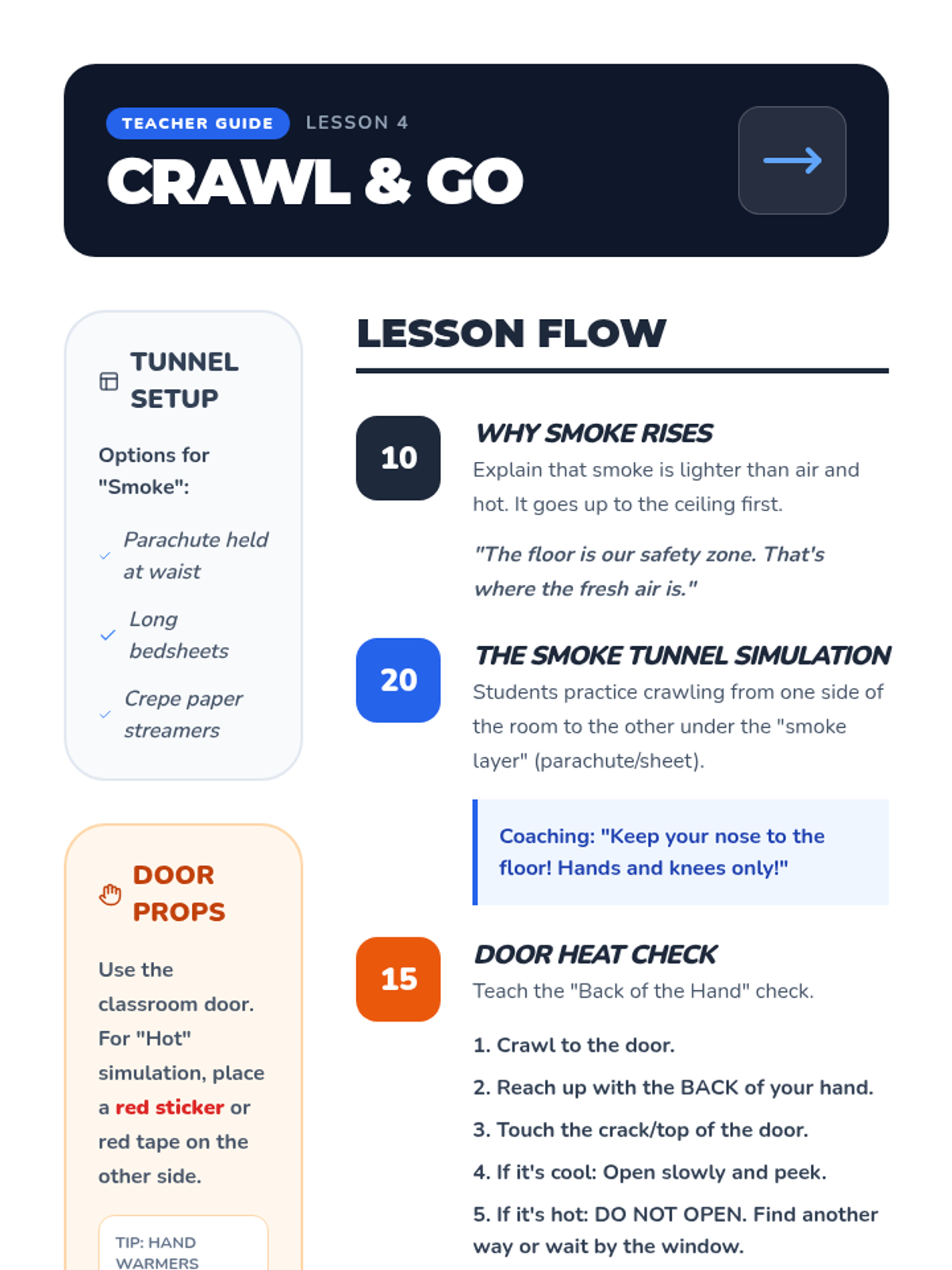 This sequence teaches 1st-grade students essential fire safety skills, from hazard identification to emergency evacuation techniques and home escape planning, through interactive simulations and physical practice.