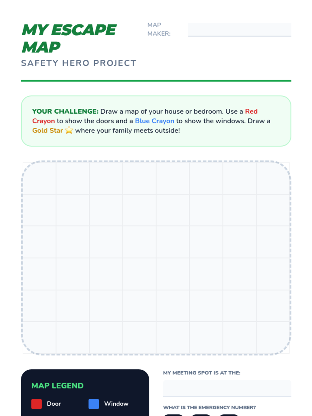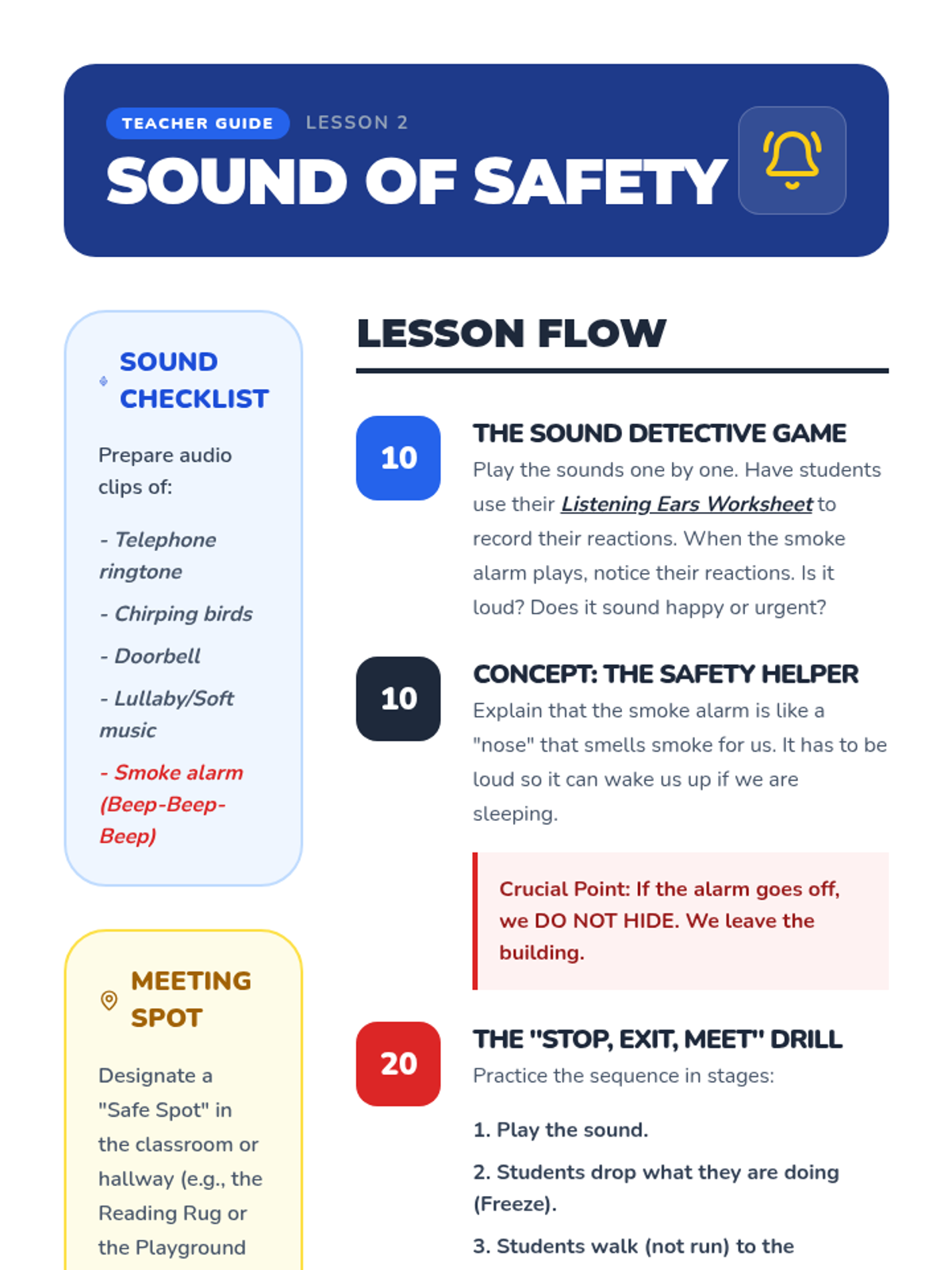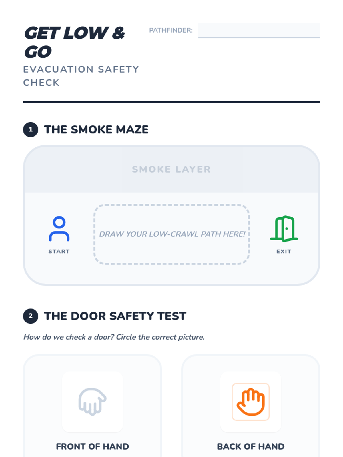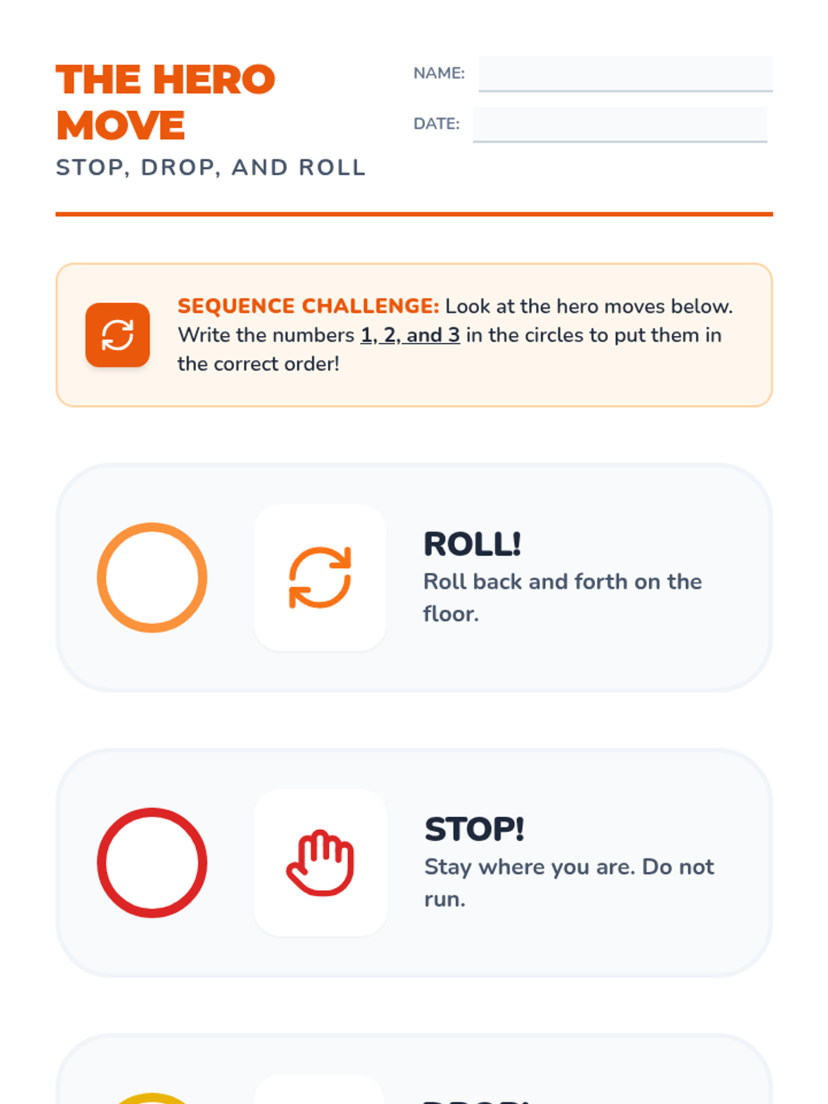 This sequence teaches 1st-grade students essential fire safety skills, from hazard identification to emergency evacuation techniques and home escape planning, through interactive simulations and physical practice.