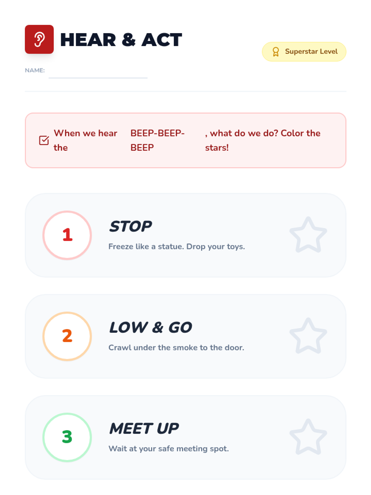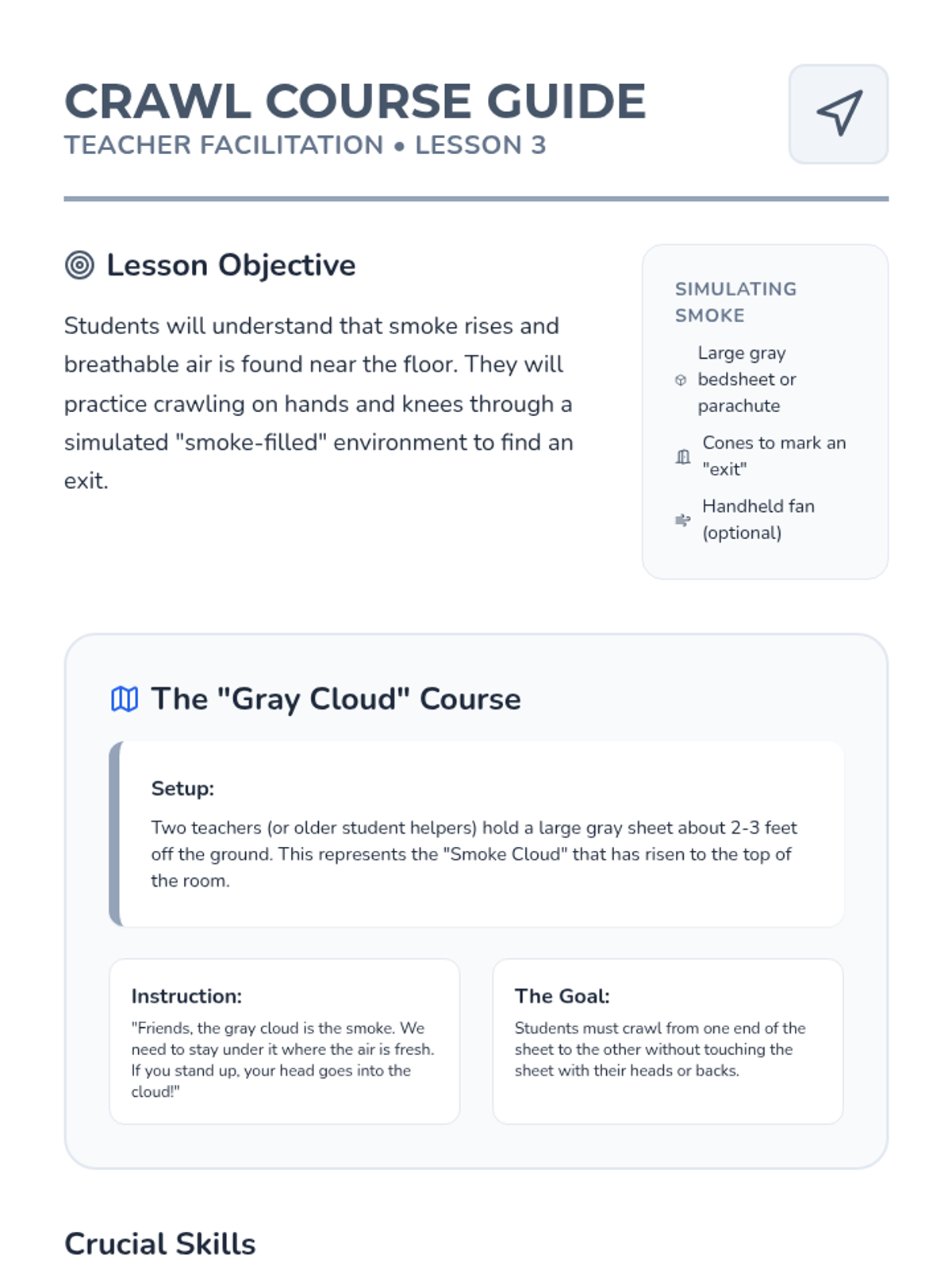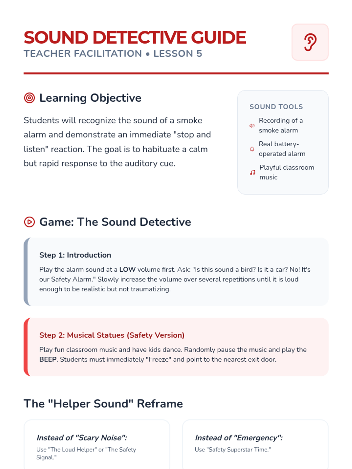 A comprehensive fire safety sequence for Pre-K students focusing on movement-based reactions, overcoming fear of emergency gear, and mastering evacuation procedures through play and simulation.