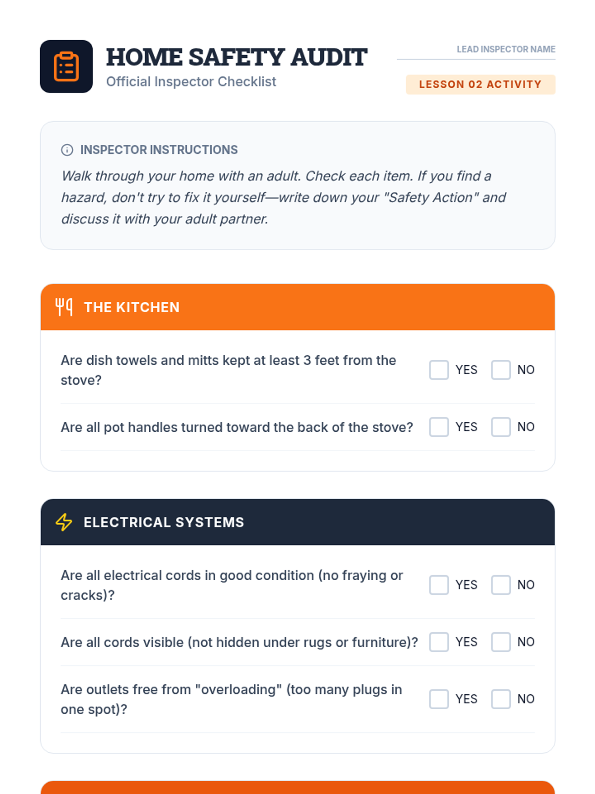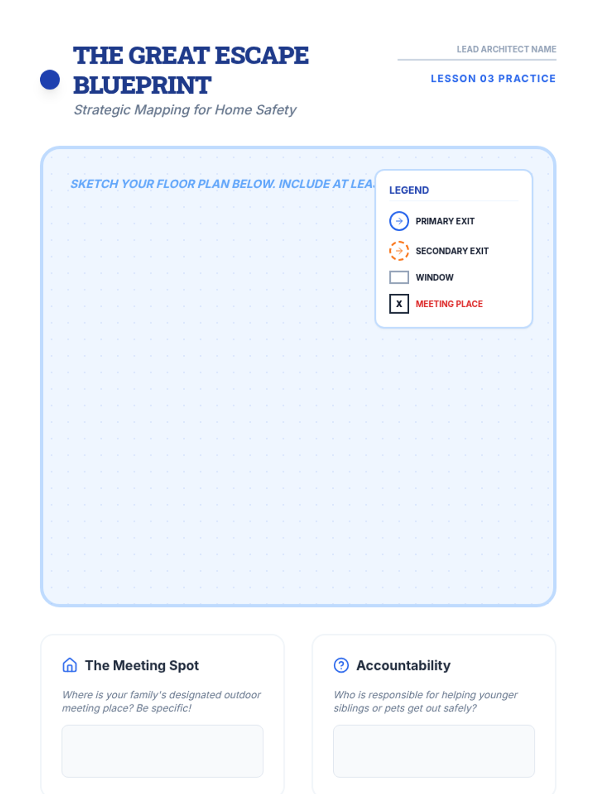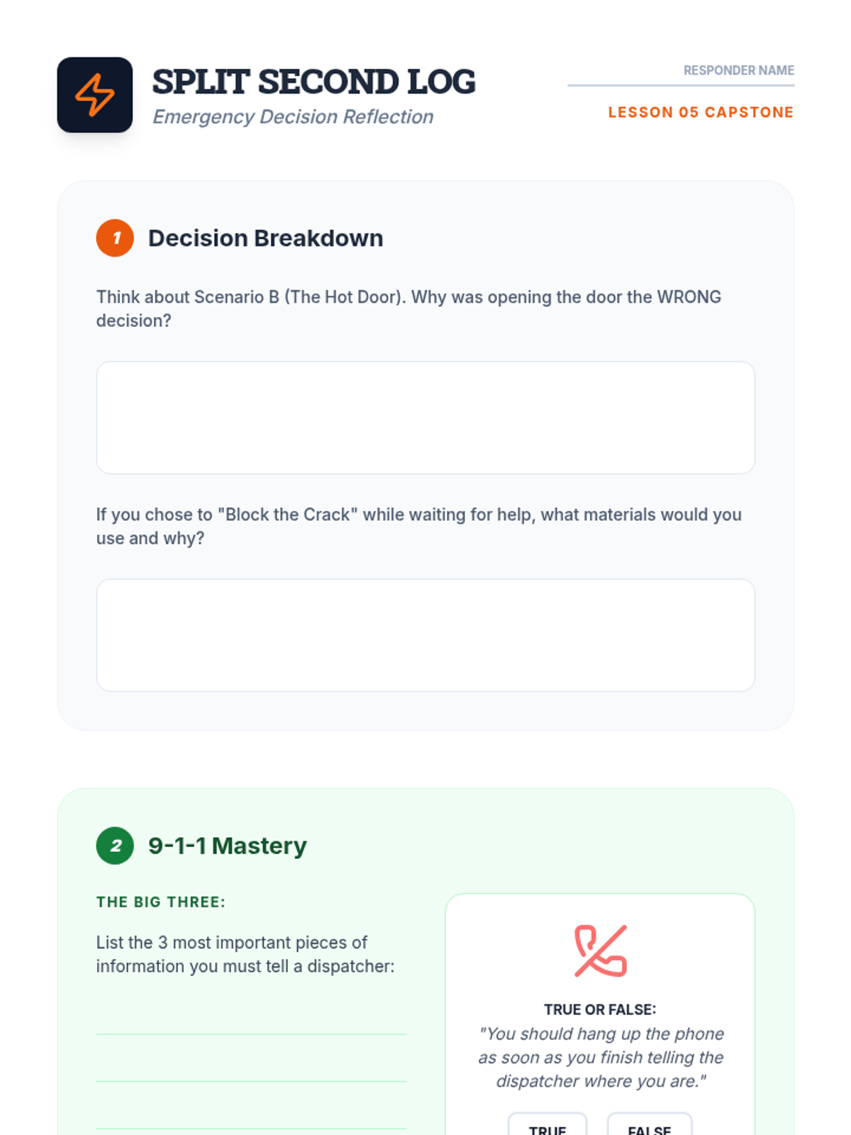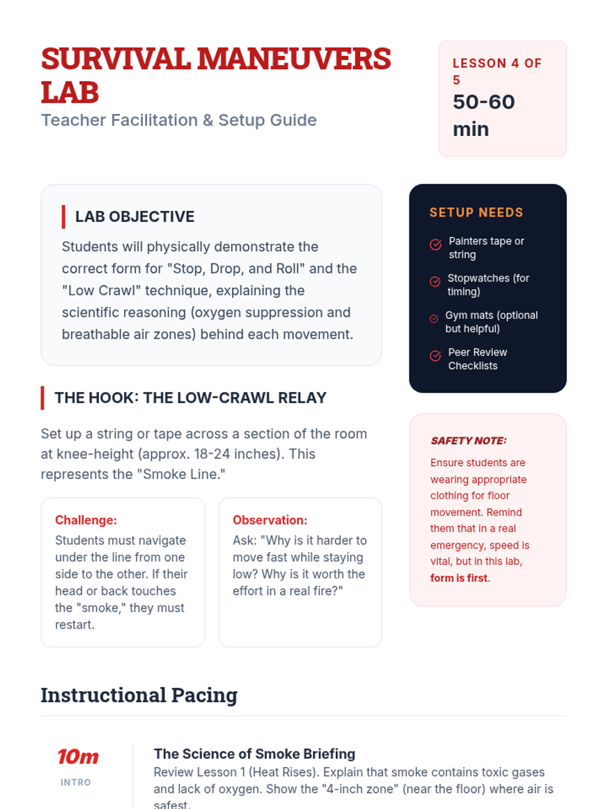 This sequence focuses on the critical cognitive and physical skills required for fire safety. Students move from understanding the science of fire to designing strategic escape plans and practicing survival maneuvers, empowering them to act as safety leaders in their homes and communities.