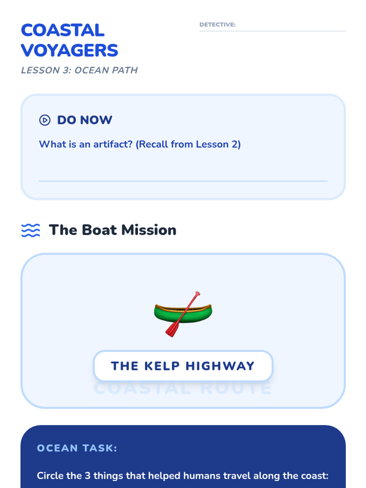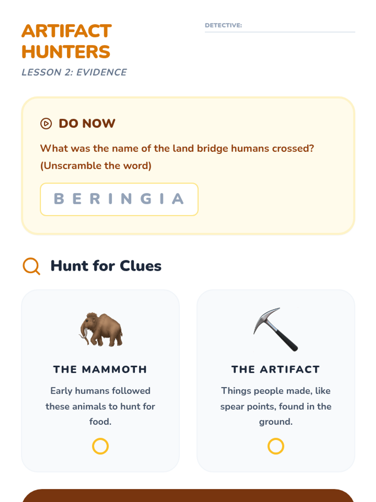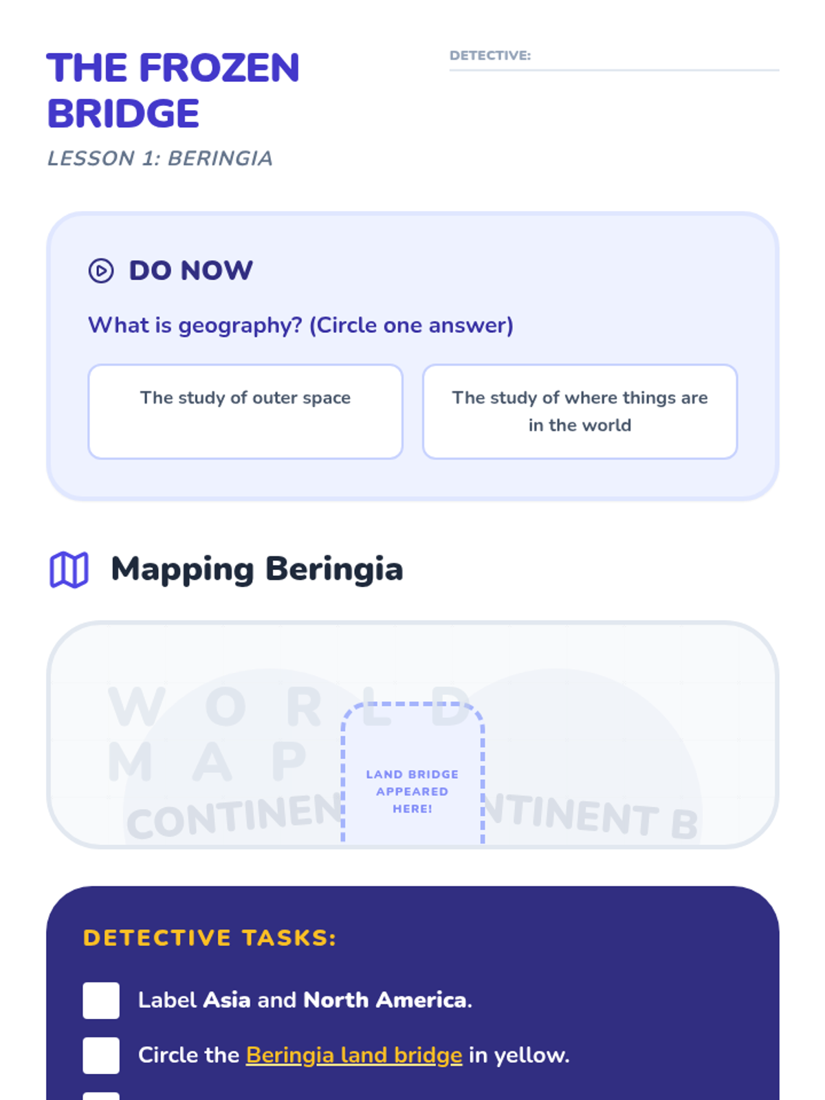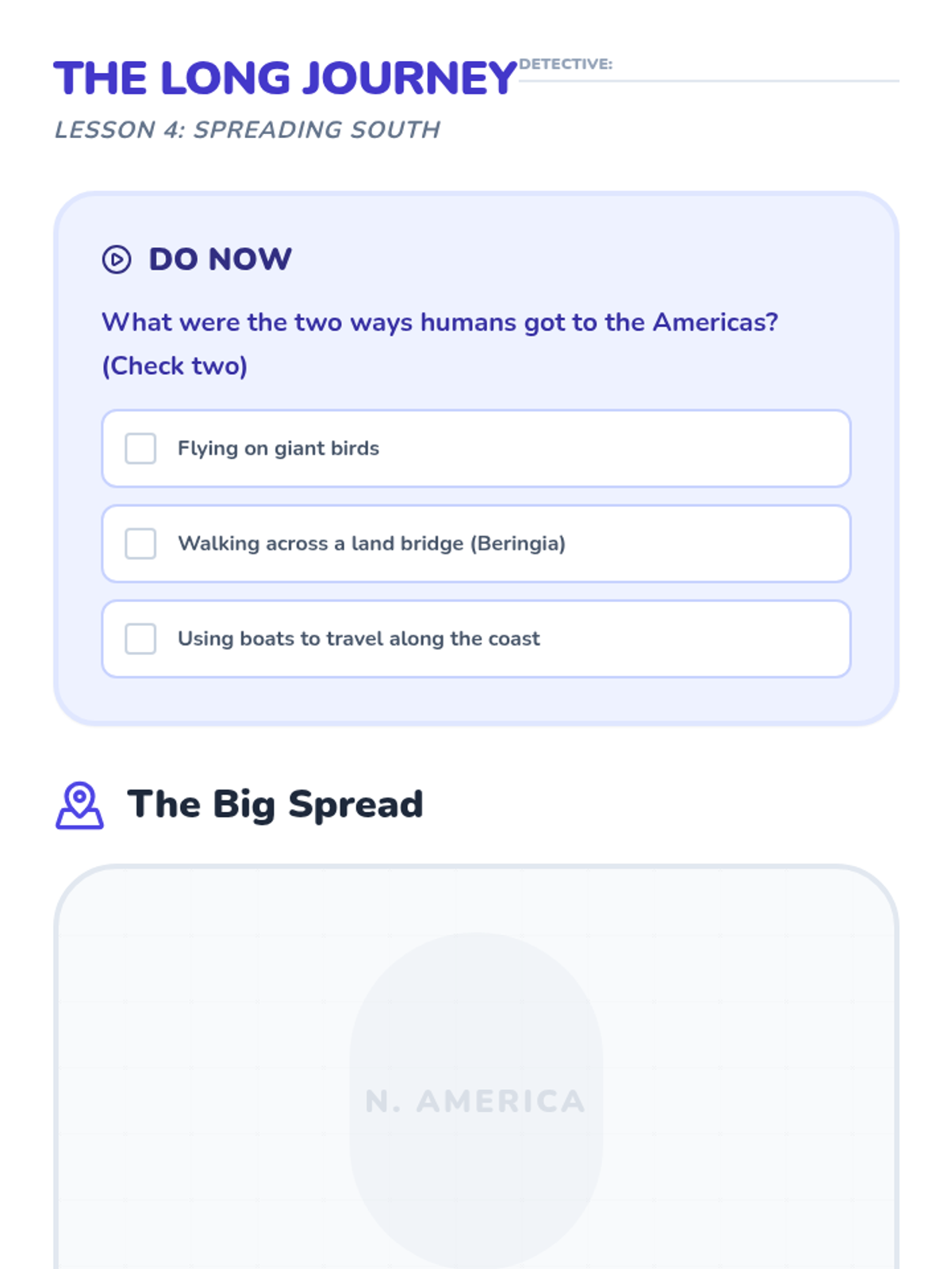 A 4-lesson unit exploring the first human migrations to the Americas. Students investigate the Bering Land Bridge and Coastal Route theories using maps and archaeological evidence, tracing the journey from Asia down to South America between 25,000 and 14,000 years ago.