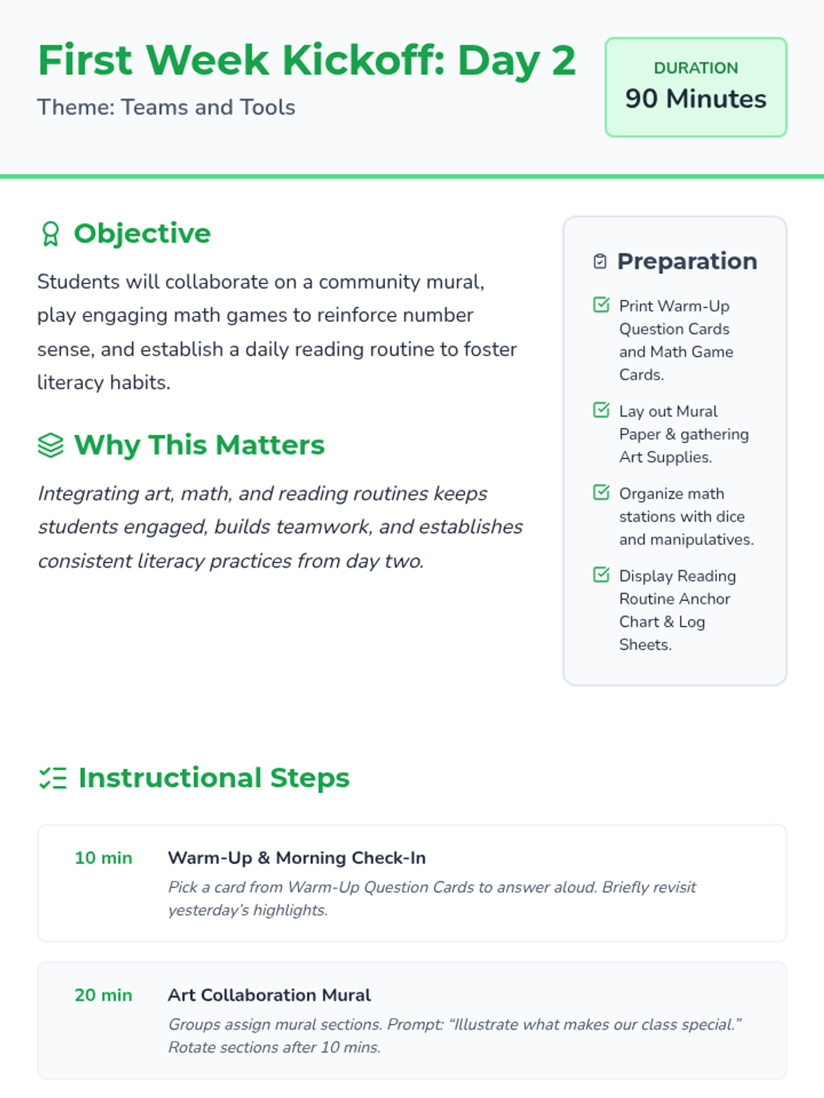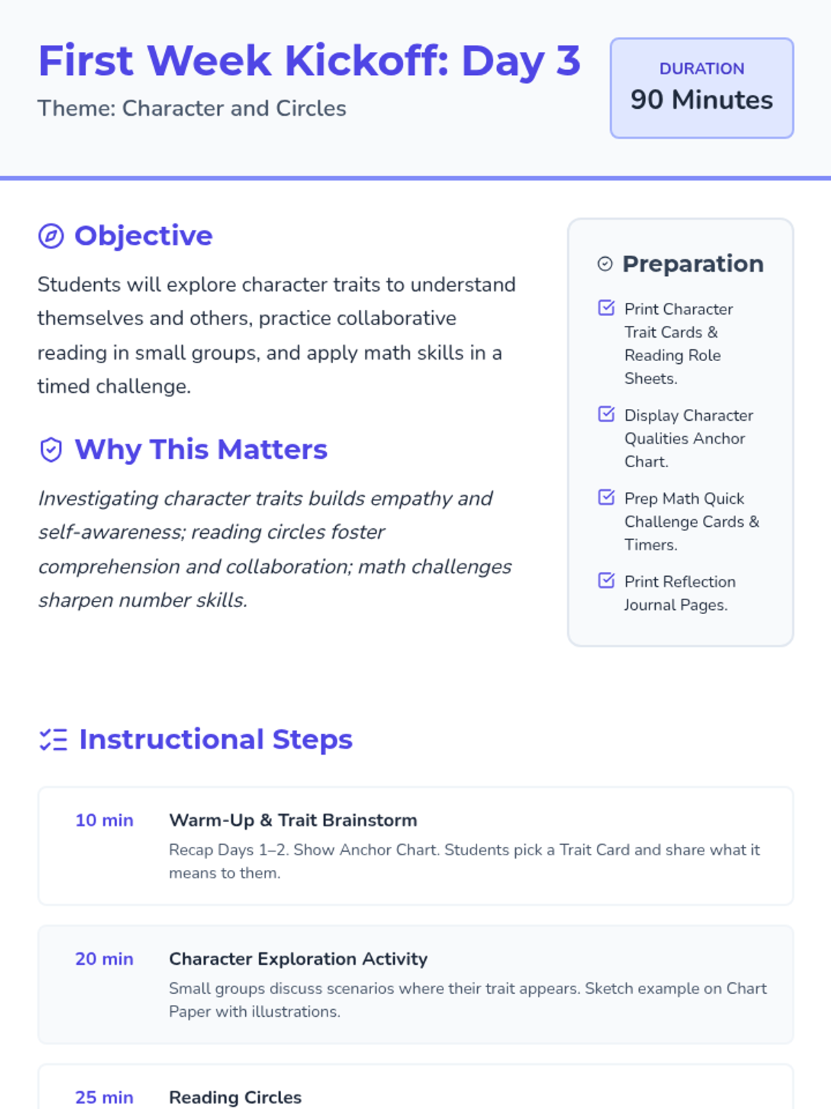 A three-day introductory unit for 3rd graders that builds community, sets expectations, and engages students in art, math, and reading activities. This sequence ensures a warm welcome and establishes key classroom routines.