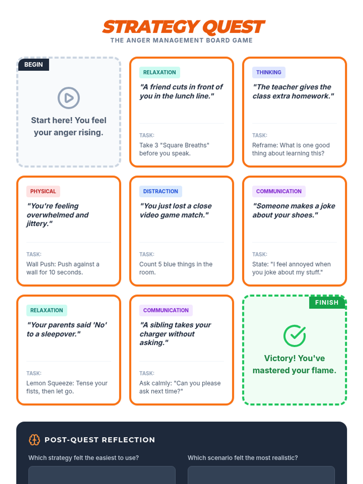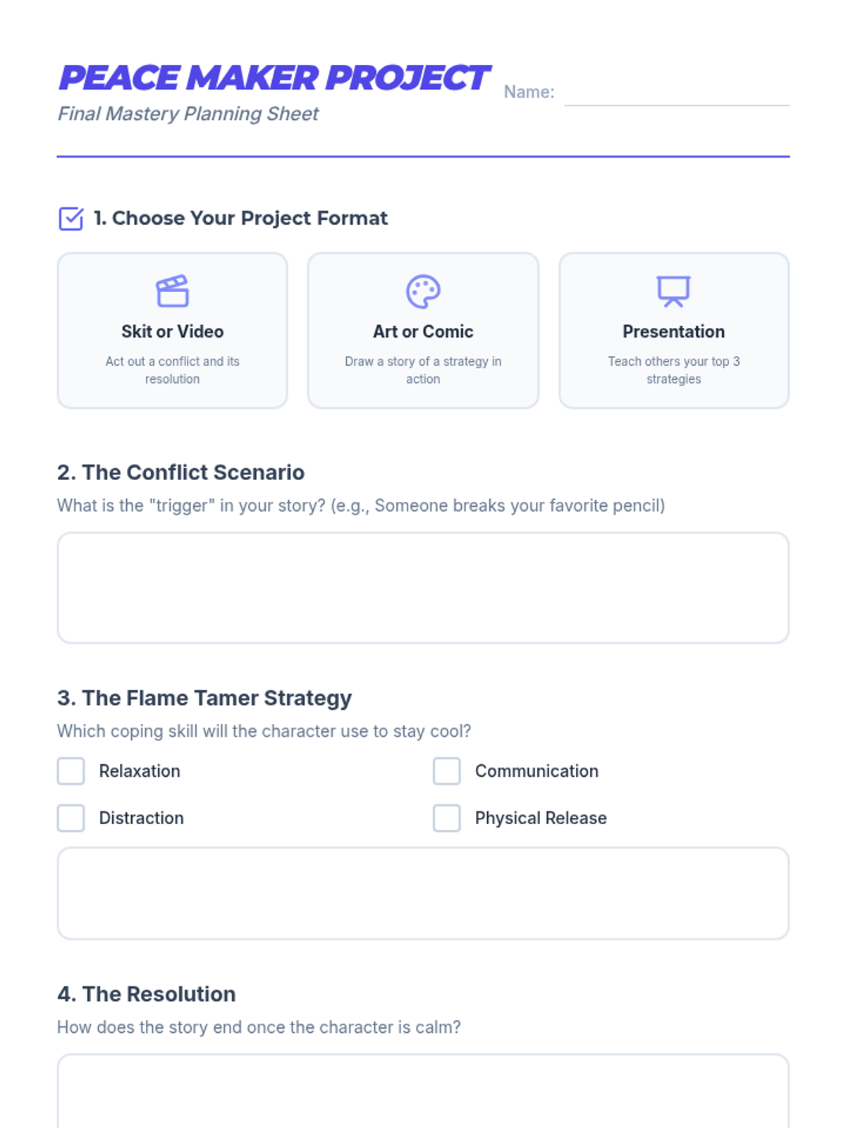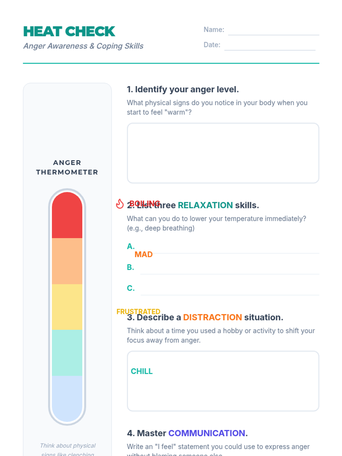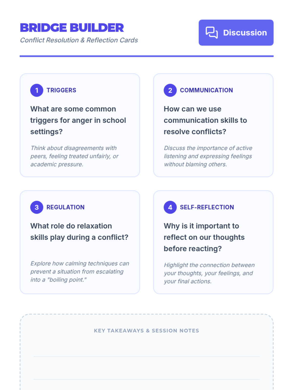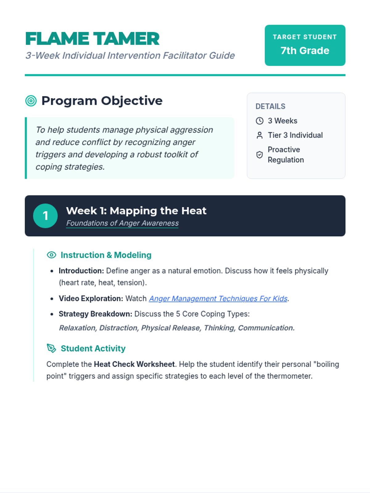 A 3-week individual intervention program designed to help middle school students manage physical aggression, identify emotional triggers, and develop a toolkit of relaxation, distraction, and communication strategies.
