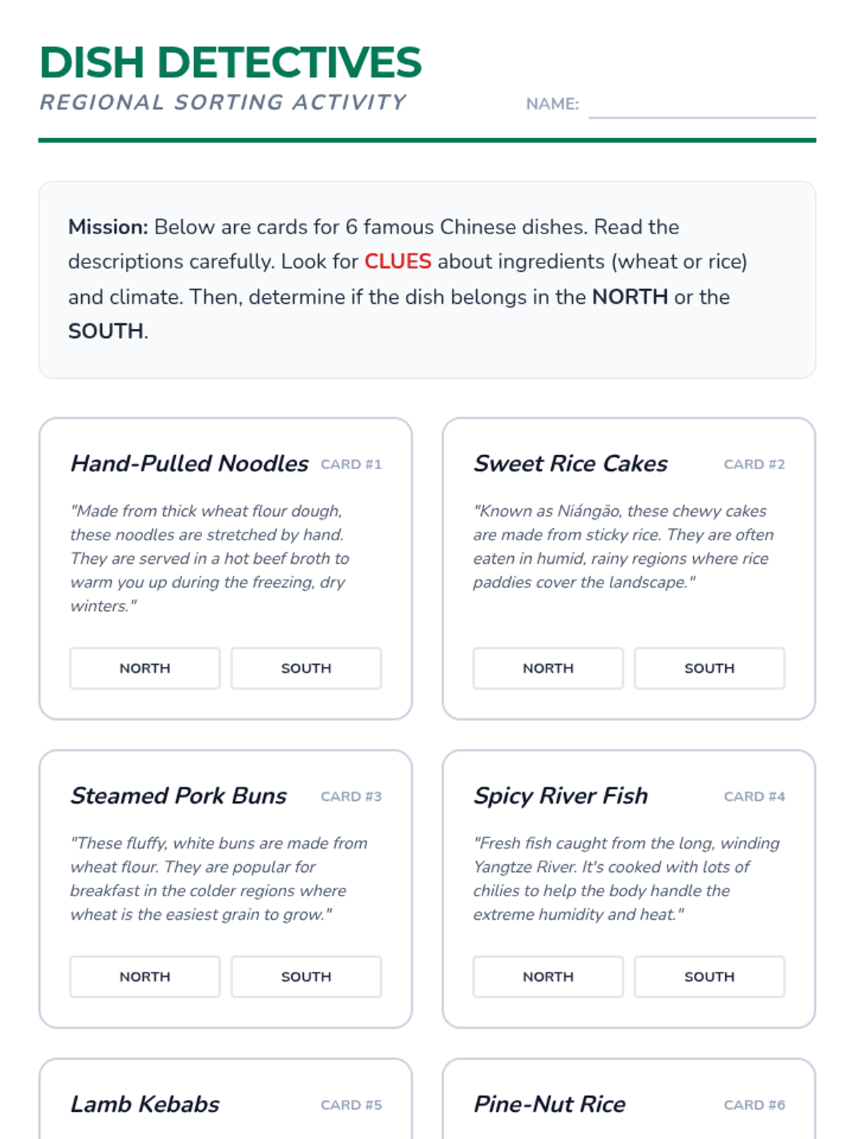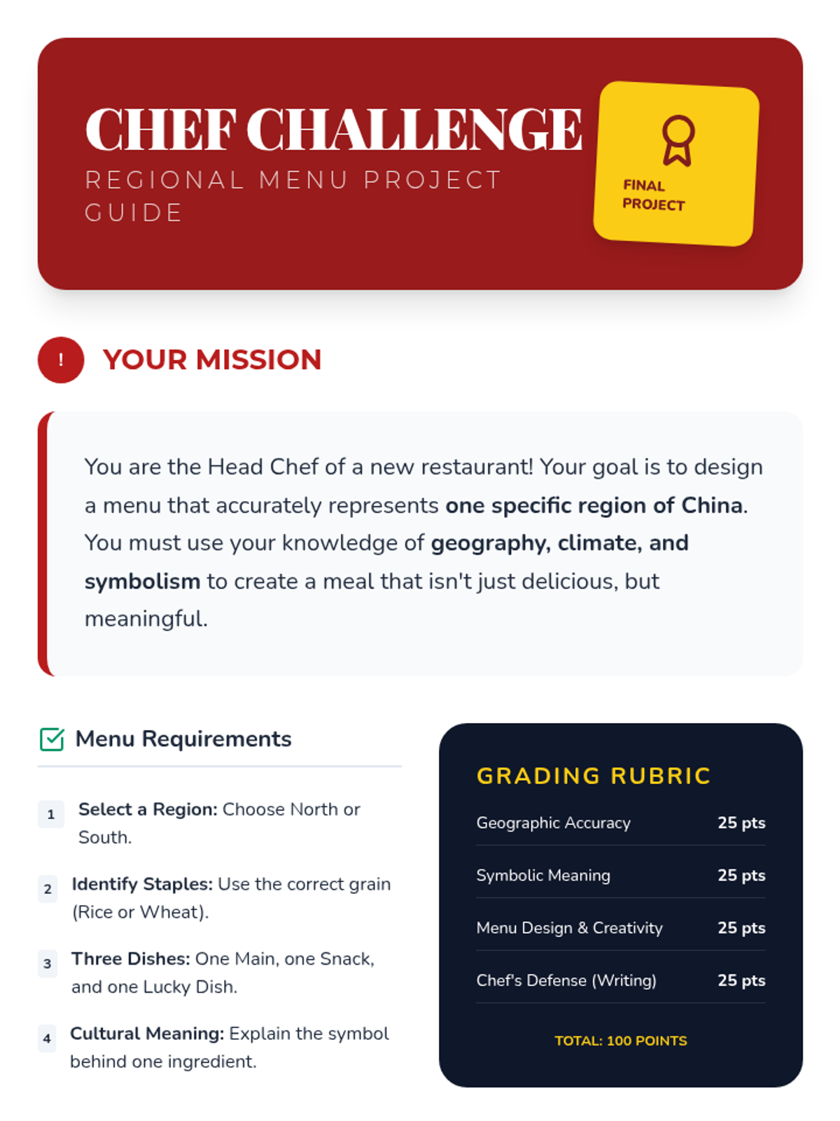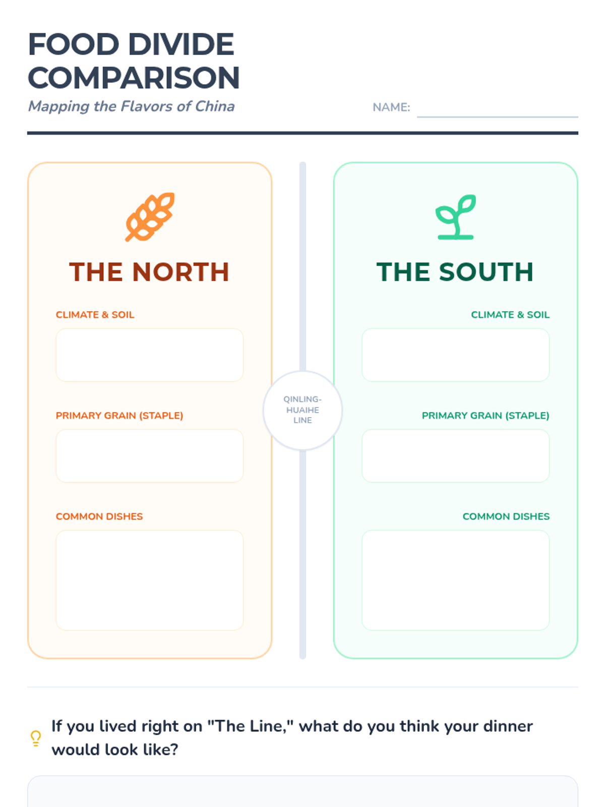 This 4th-grade sequence explores the intersection of China's physical geography and its diverse culinary traditions. Students investigate how climate and terrain dictate agriculture (the 'Rice vs. Wheat' divide) and how language and culture infuse specific ingredients with symbolic meaning, culminating in a regional menu design project.