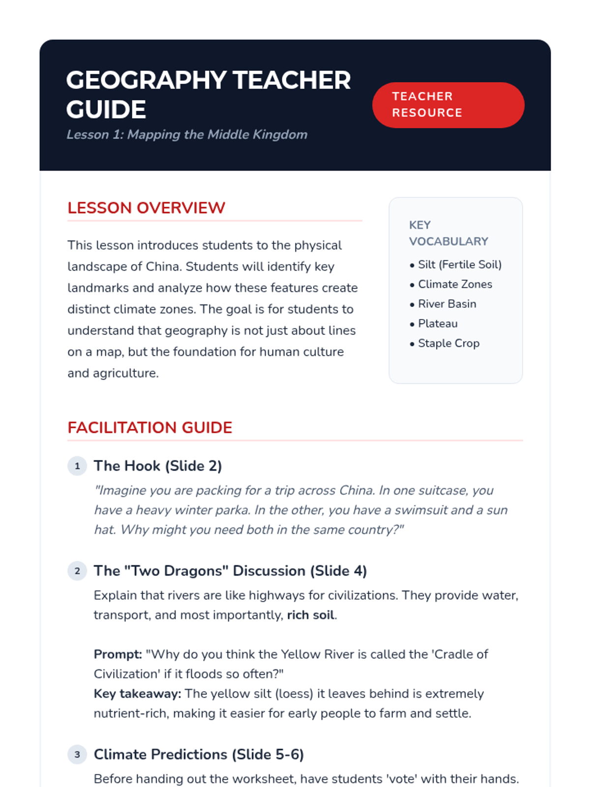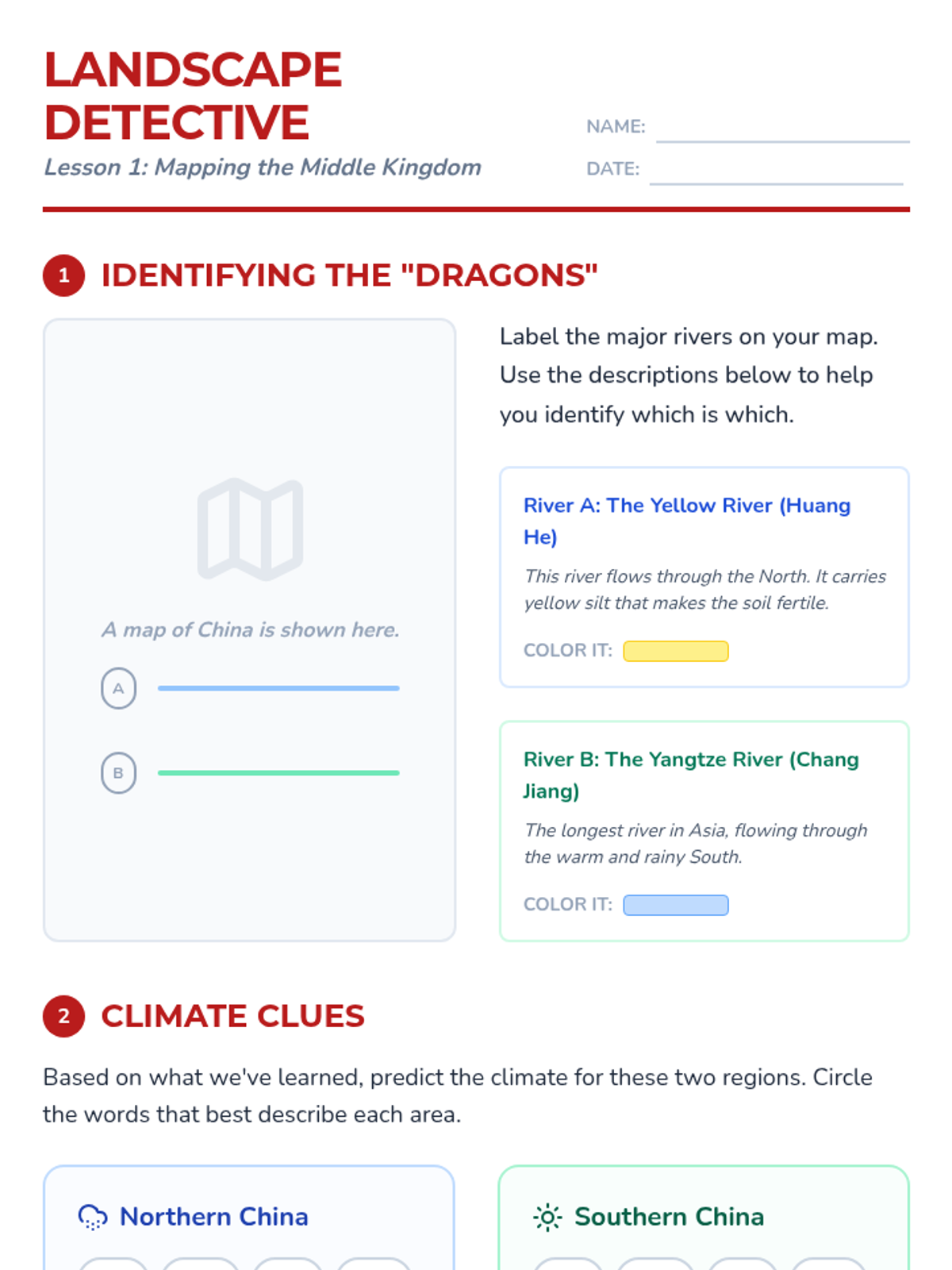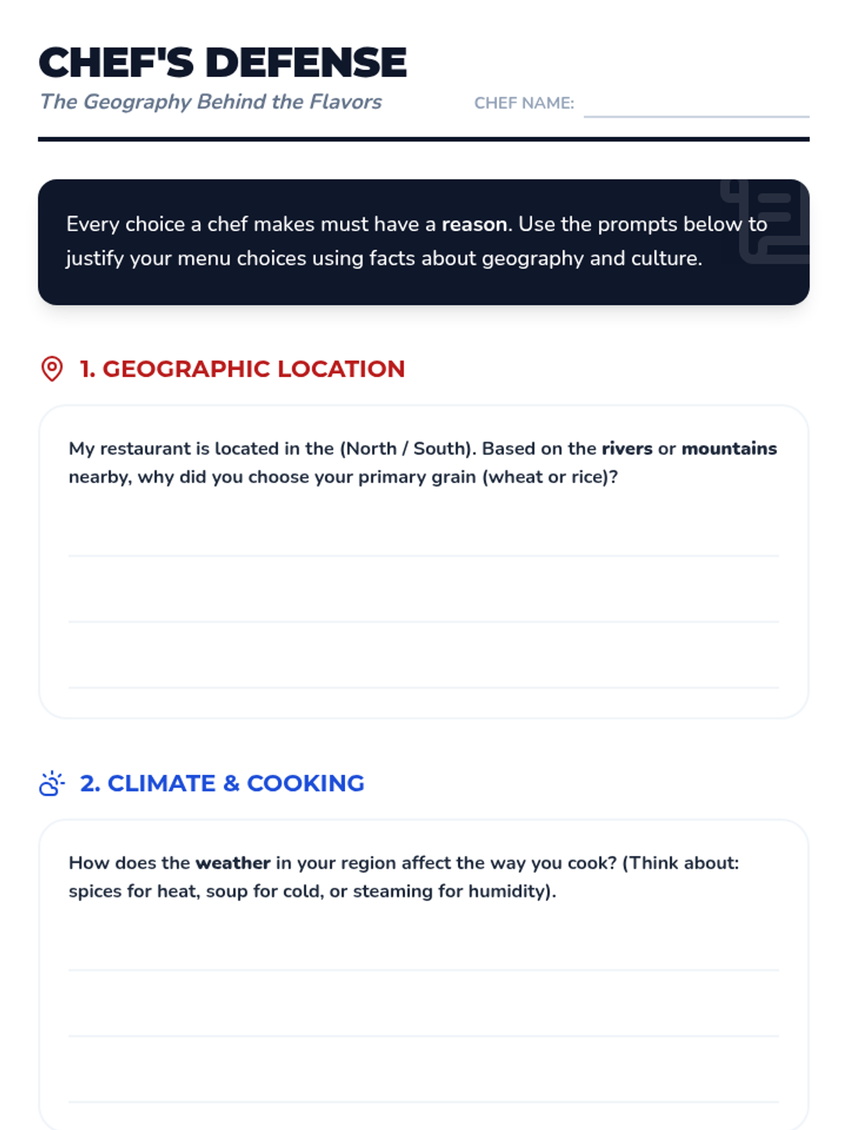 This 4th-grade sequence explores the intersection of China's physical geography and its diverse culinary traditions. Students investigate how climate and terrain dictate agriculture (the 'Rice vs. Wheat' divide) and how language and culture infuse specific ingredients with symbolic meaning, culminating in a regional menu design project.