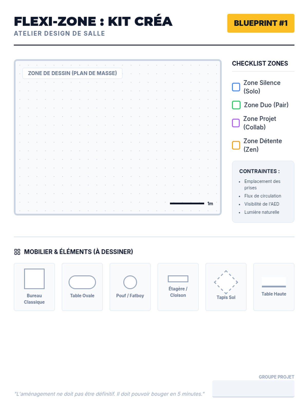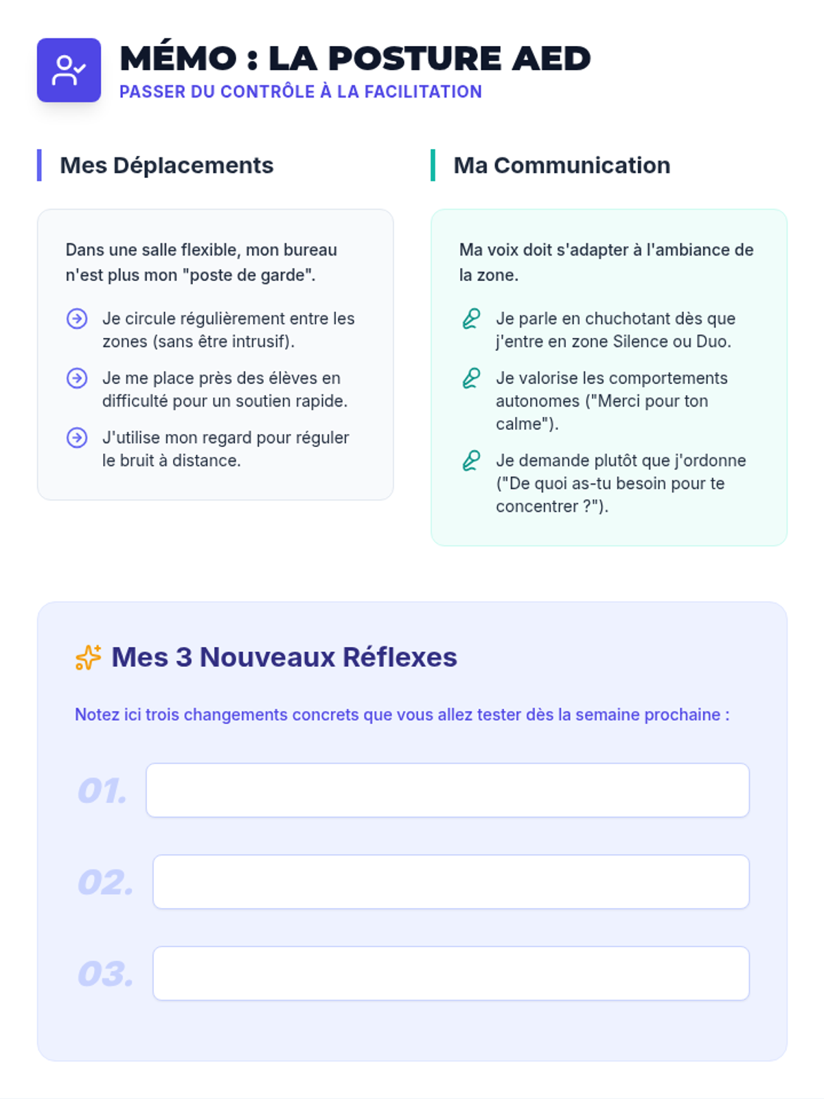 Une formation immersive de 6 heures destinée aux AED débutants pour transformer une salle d'étude traditionnelle en un espace flexible favorisant l'autonomie et le bien-être des élèves. La formation alterne entre apports théoriques, ateliers d'analyse et sessions de conception créative.
