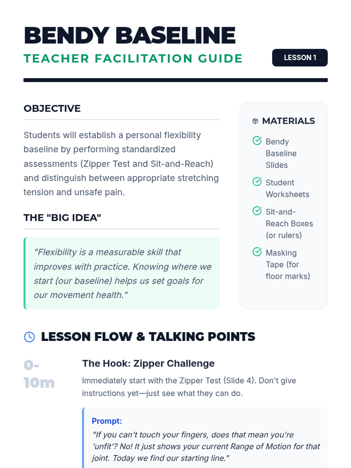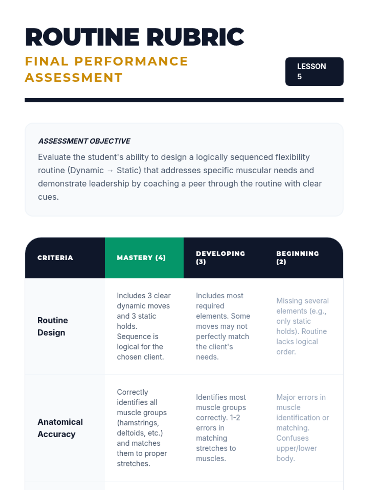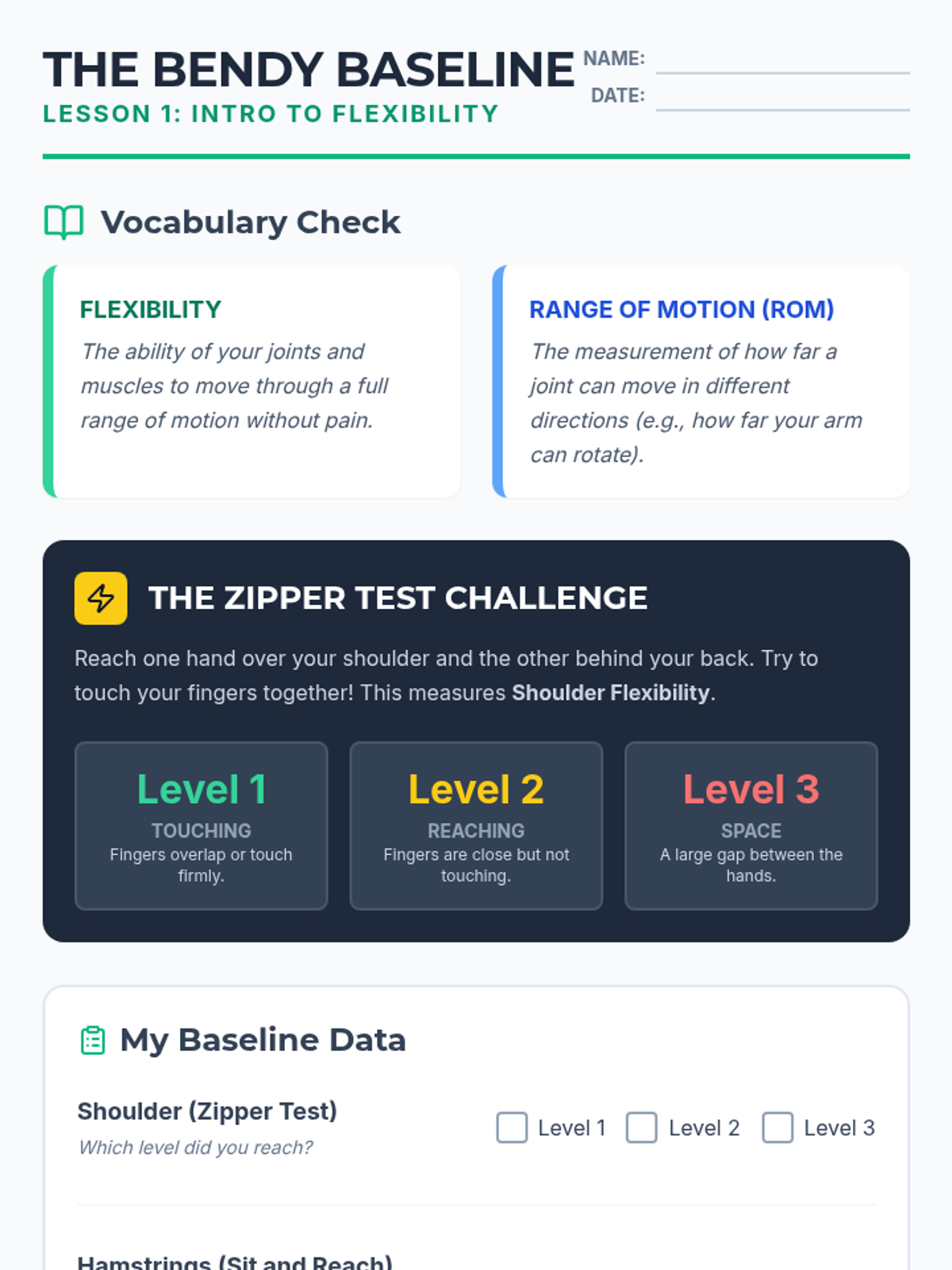 A comprehensive 5th Grade Physical Education unit that teaches students the science and practice of flexibility. Students progress from understanding basic range of motion to designing and leading their own dynamic and static stretching routines tailored to specific physical activities.