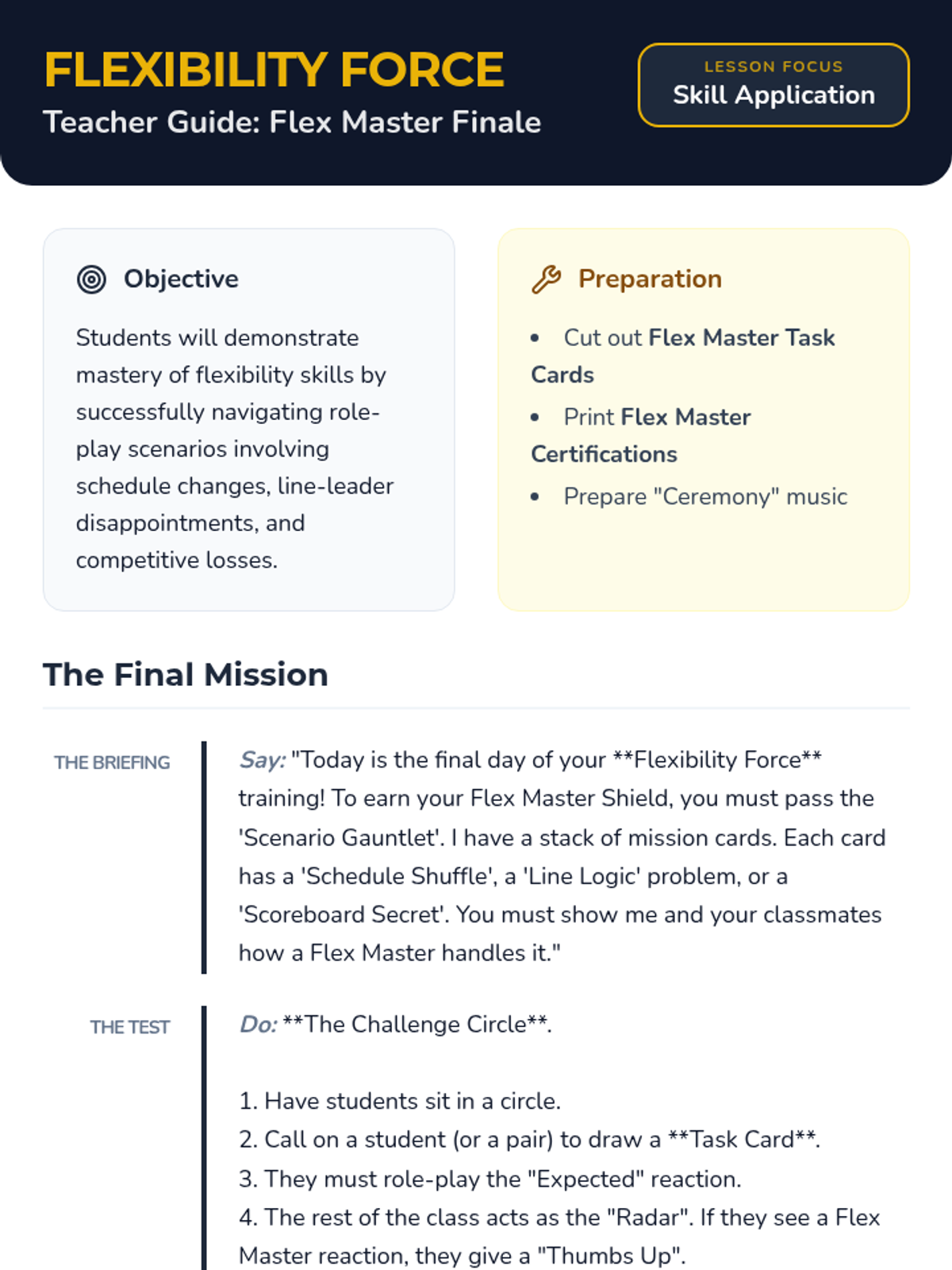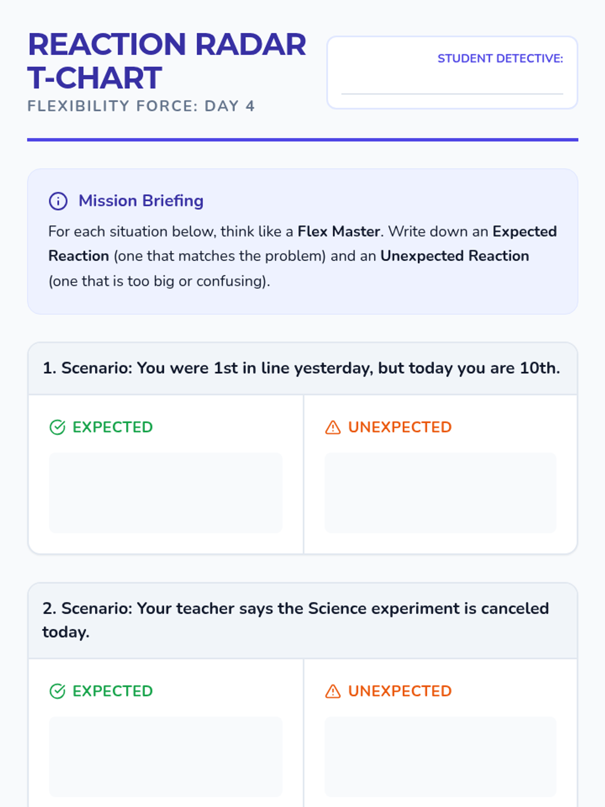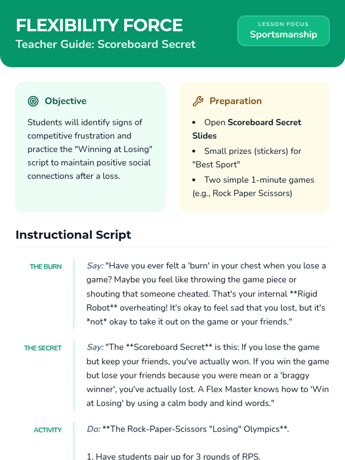 A five-day social skills unit designed for 3rd and 4th graders to develop emotional regulation and flexibility when facing common school triggers: schedule changes, not being first, and losing games. Students learn to transition from 'Rigid Robots' to 'Flex Masters' through role-play, visual checklists, and reflection.