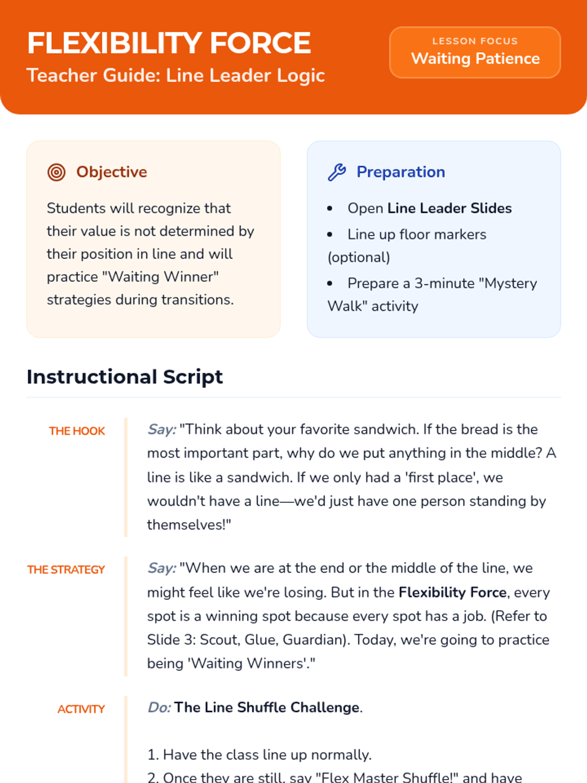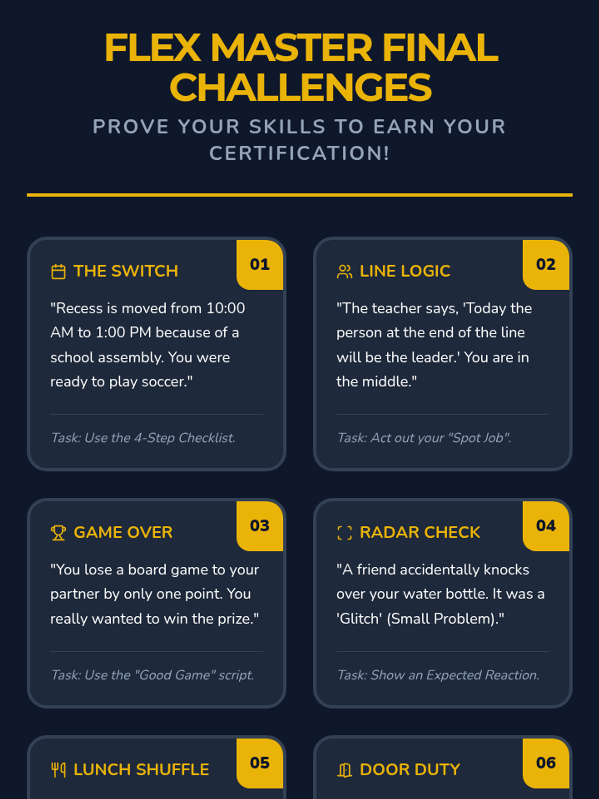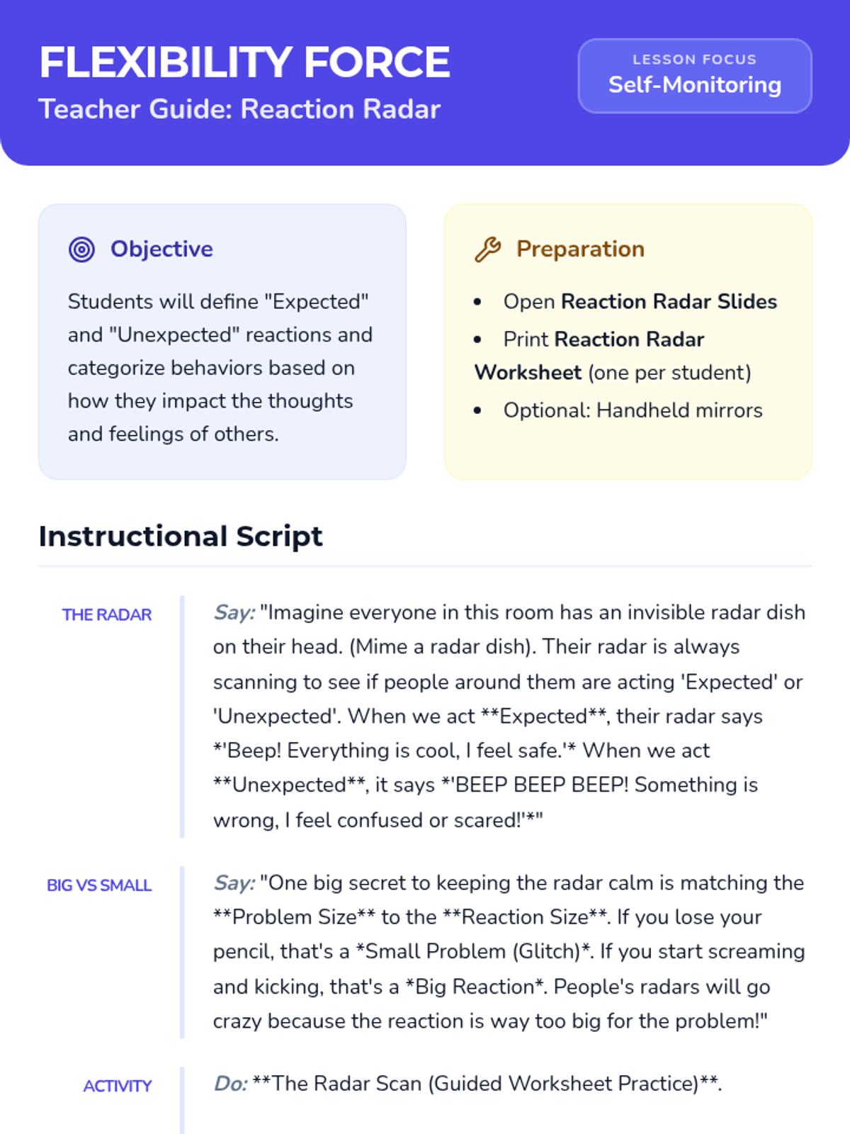 A five-day social skills unit designed for 3rd and 4th graders to develop emotional regulation and flexibility when facing common school triggers: schedule changes, not being first, and losing games. Students learn to transition from 'Rigid Robots' to 'Flex Masters' through role-play, visual checklists, and reflection.