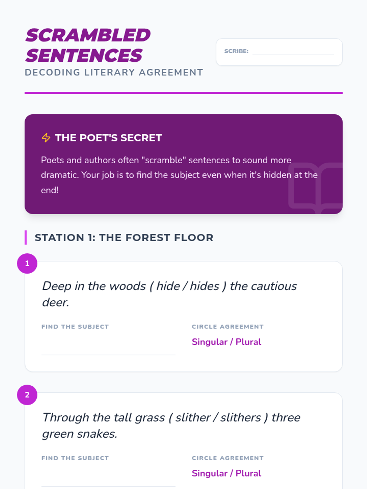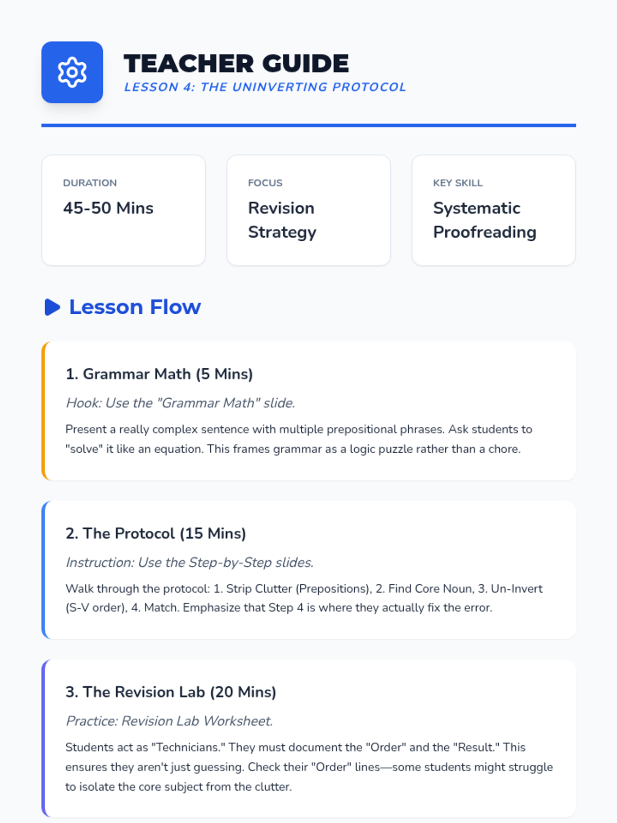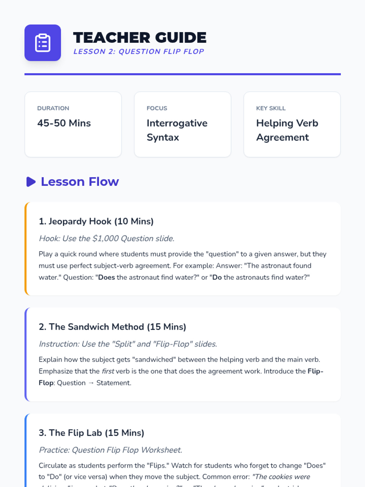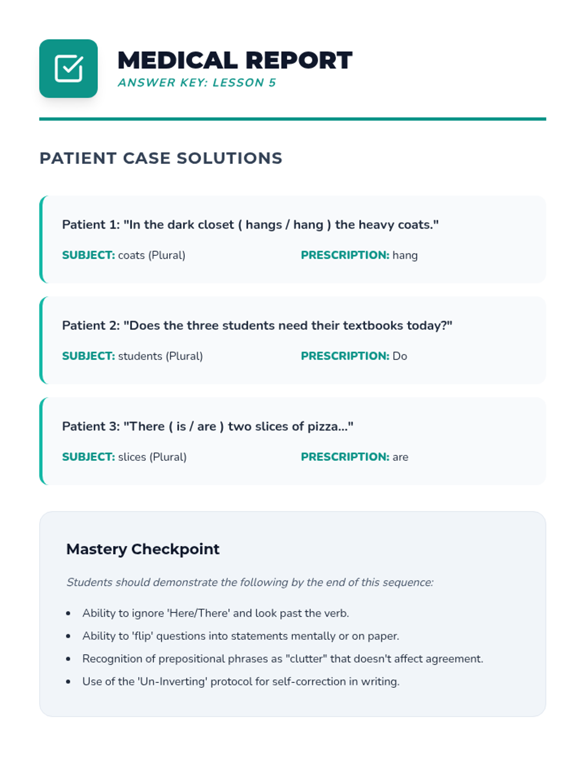 A comprehensive sequence for 5th-grade students focusing on subject-verb agreement in complex and inverted sentence structures. Students learn to navigate 'Here/There' starters, questions, and poetic word orders using the 'un-inverting' revision strategy.