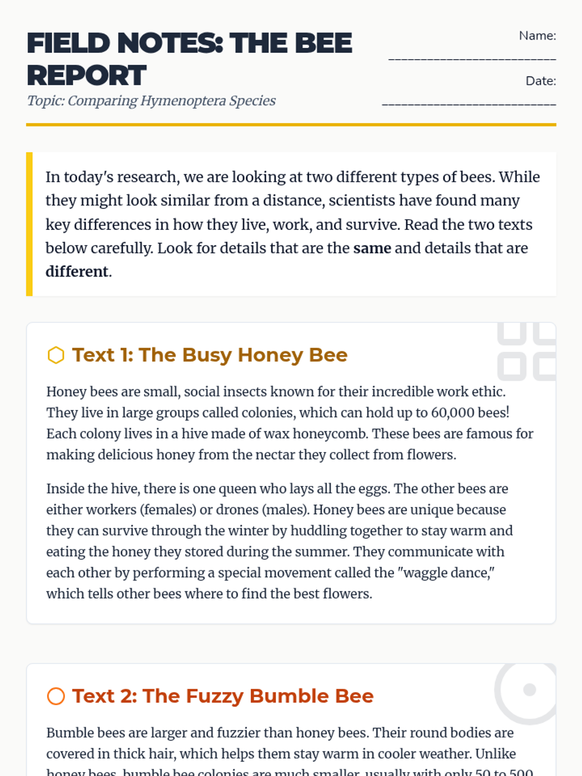 A two-day unit on comparing and contrasting informational texts focused on saltwater and freshwater ecosystems. Students move from basic physical differences to complex environmental adaptations and biological zones.