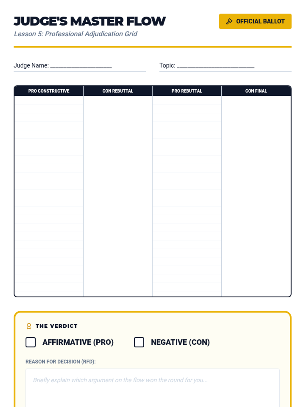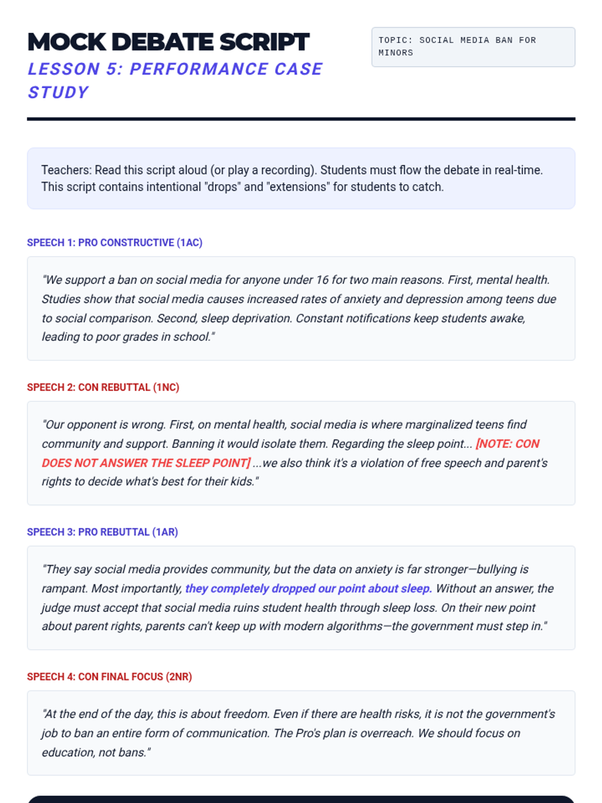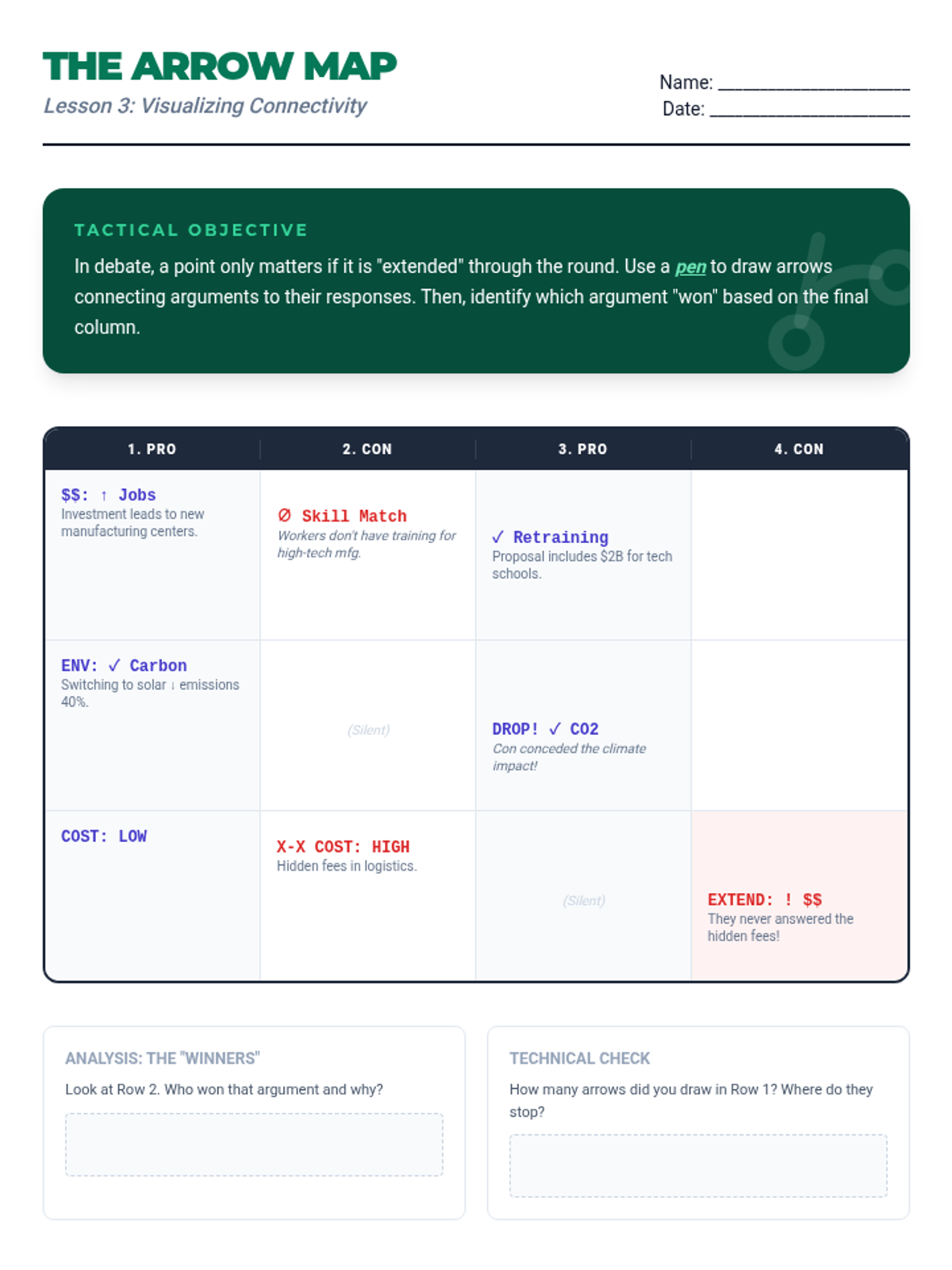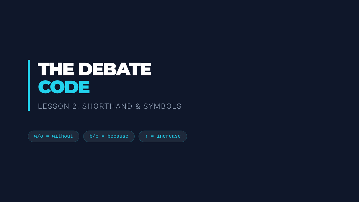A comprehensive sequence for 8th-grade debaters focusing on 'flowing'—the specialized note-taking method used to track arguments. Students learn to organize information spatially, use shorthand symbols, track clashes with arrows, and execute systematic line-by-line refutations.
