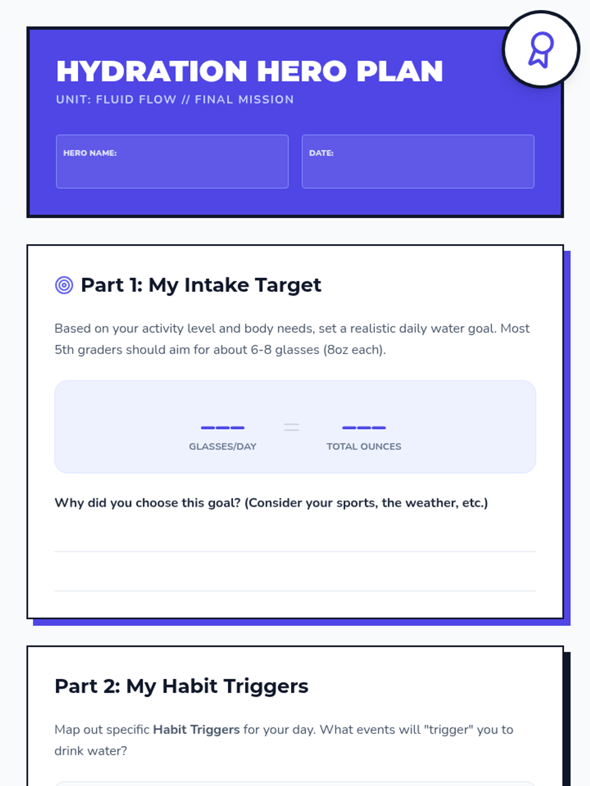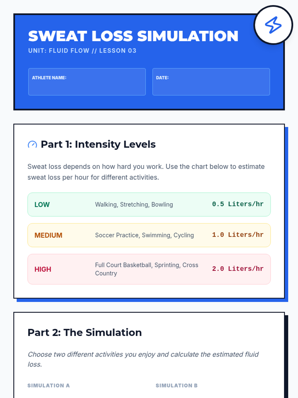 Students investigate the biological necessity of water and develop practical skills for monitoring their own hydration status. They explore water's role in body systems, identify dehydration signs, analyze hydration sources, and create personalized fluid intake plans for peak performance.