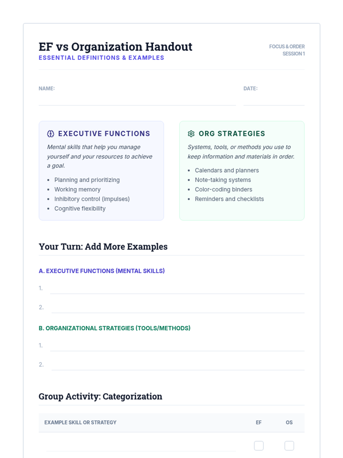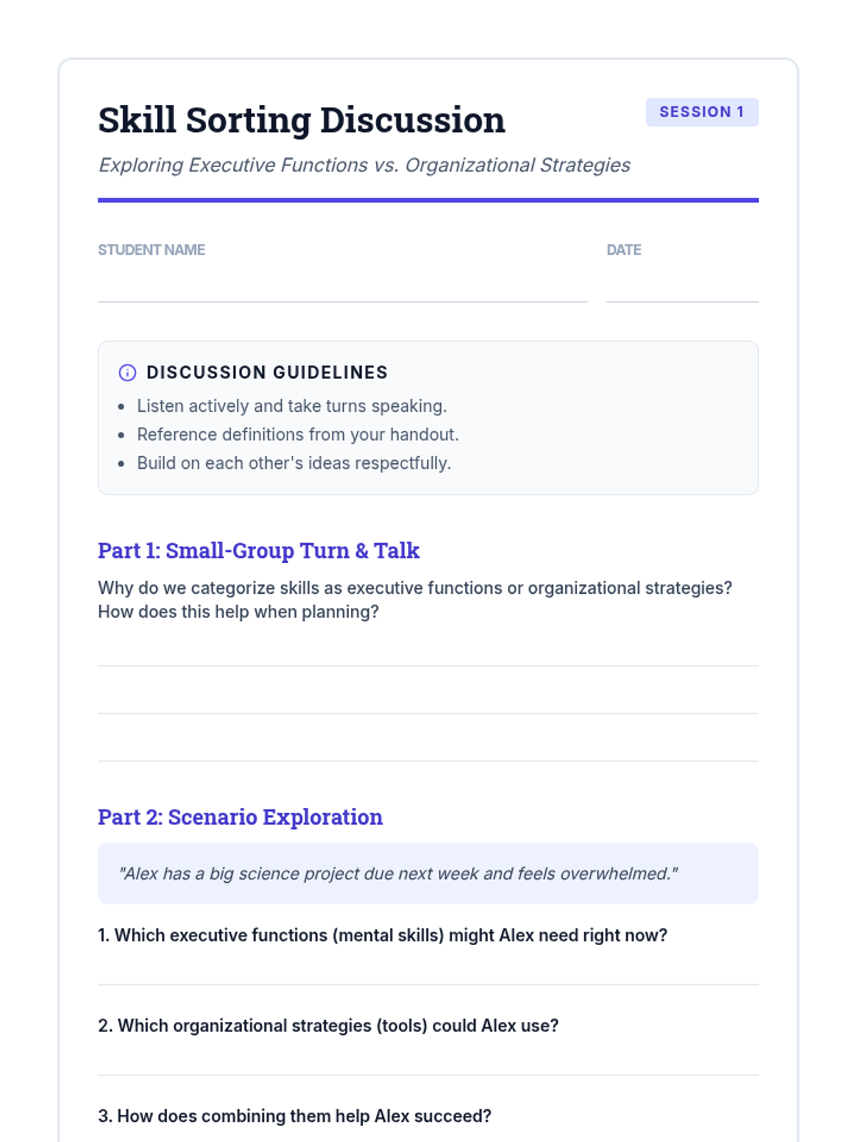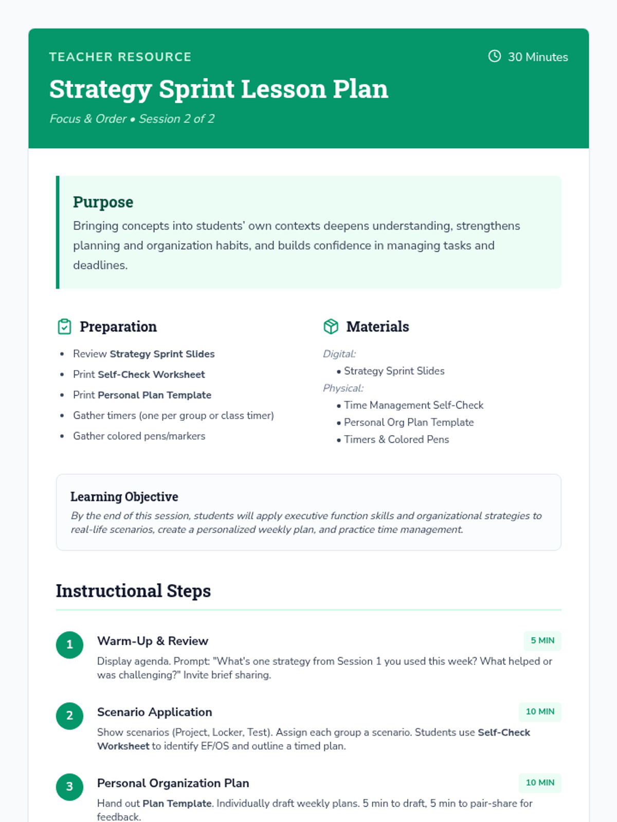 A 2-session sequence designed to help middle school students distinguish between executive function skills and organizational strategies while building personal planning habits.