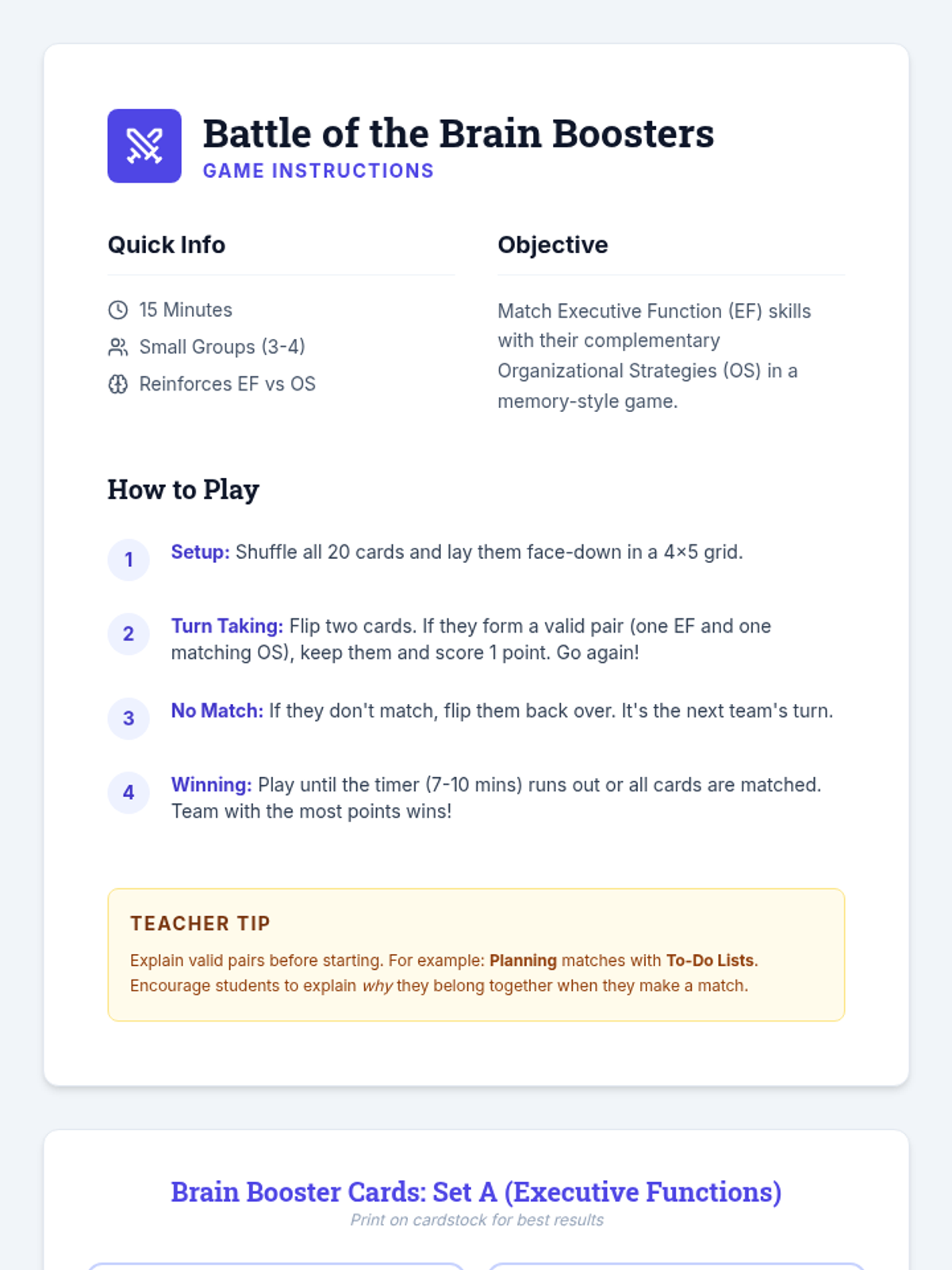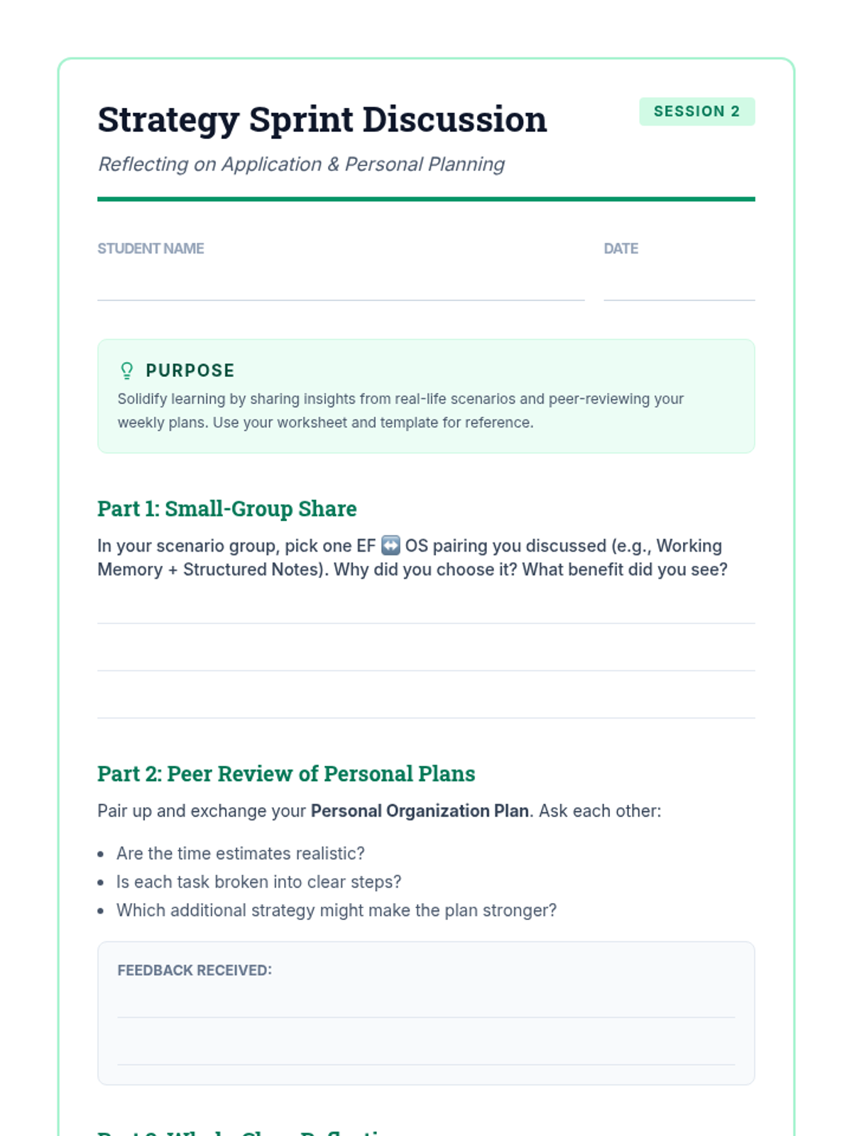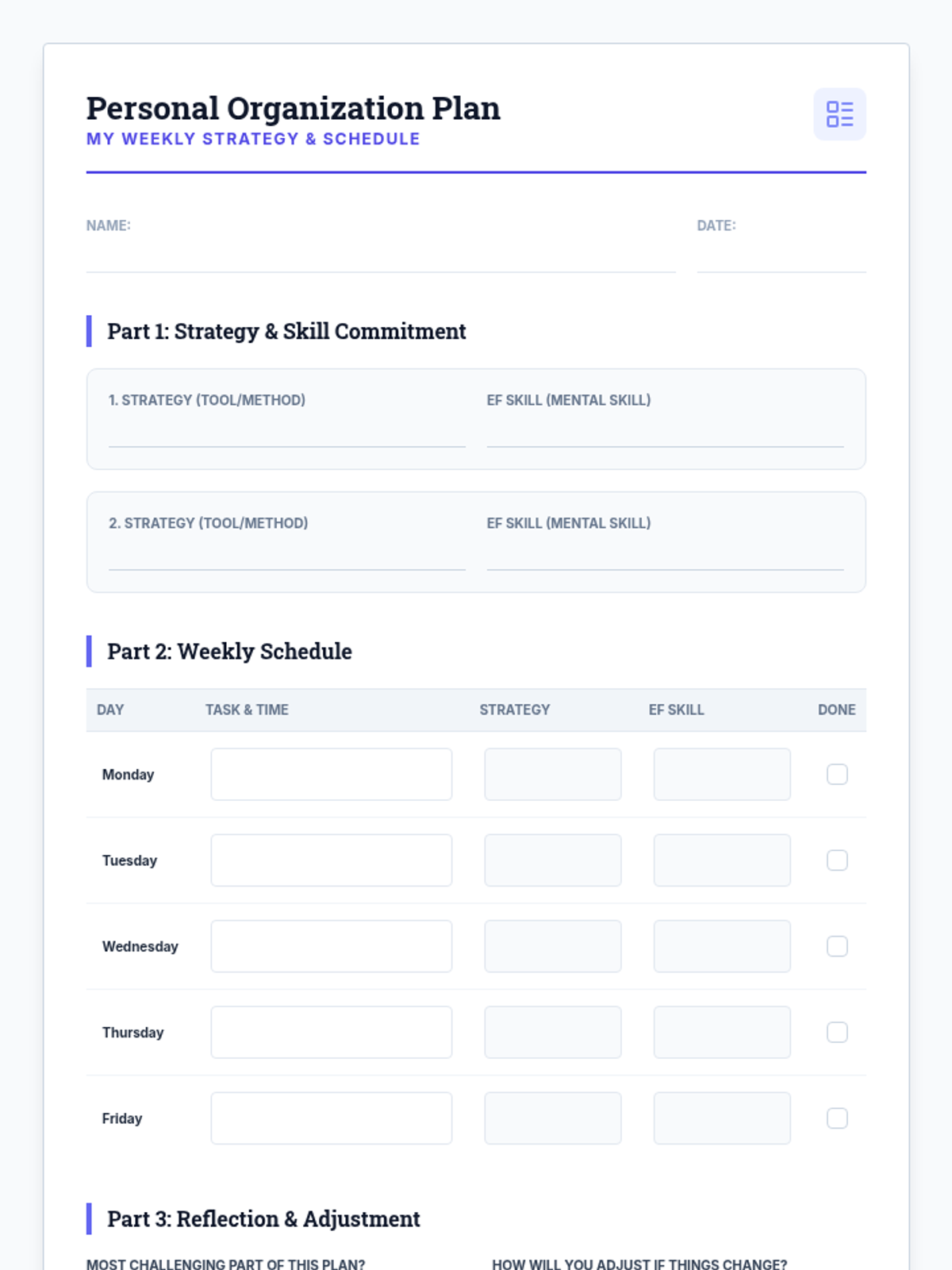 A 2-session sequence designed to help middle school students distinguish between executive function skills and organizational strategies while building personal planning habits.