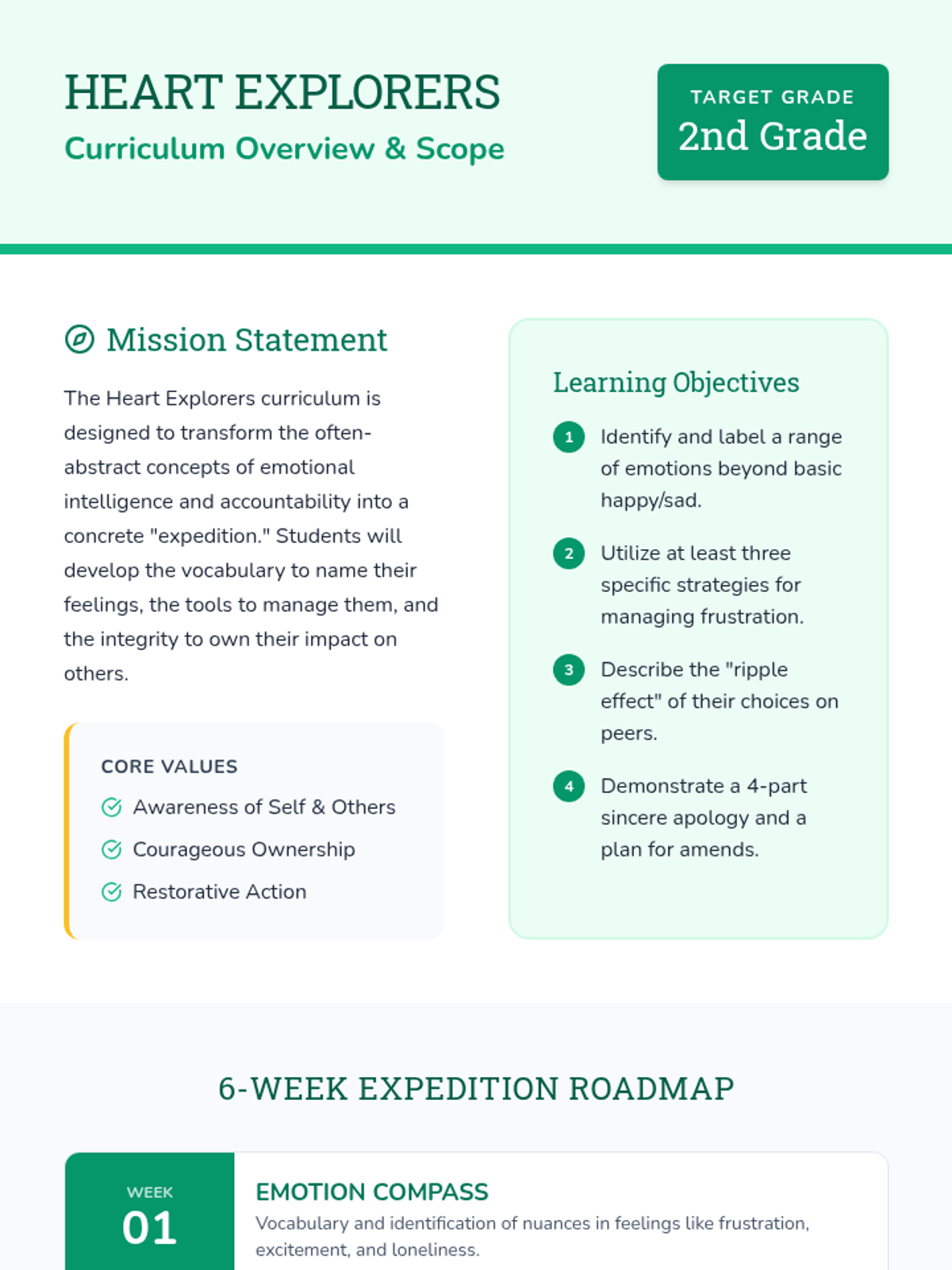 A 6-week curriculum for 2nd grade students focused on identifying emotions, managing big feelings, understanding impact, taking responsibility, and making amends through an 'exploration' theme.
