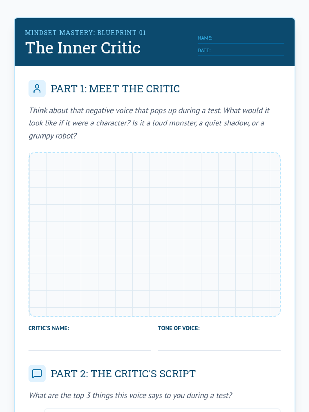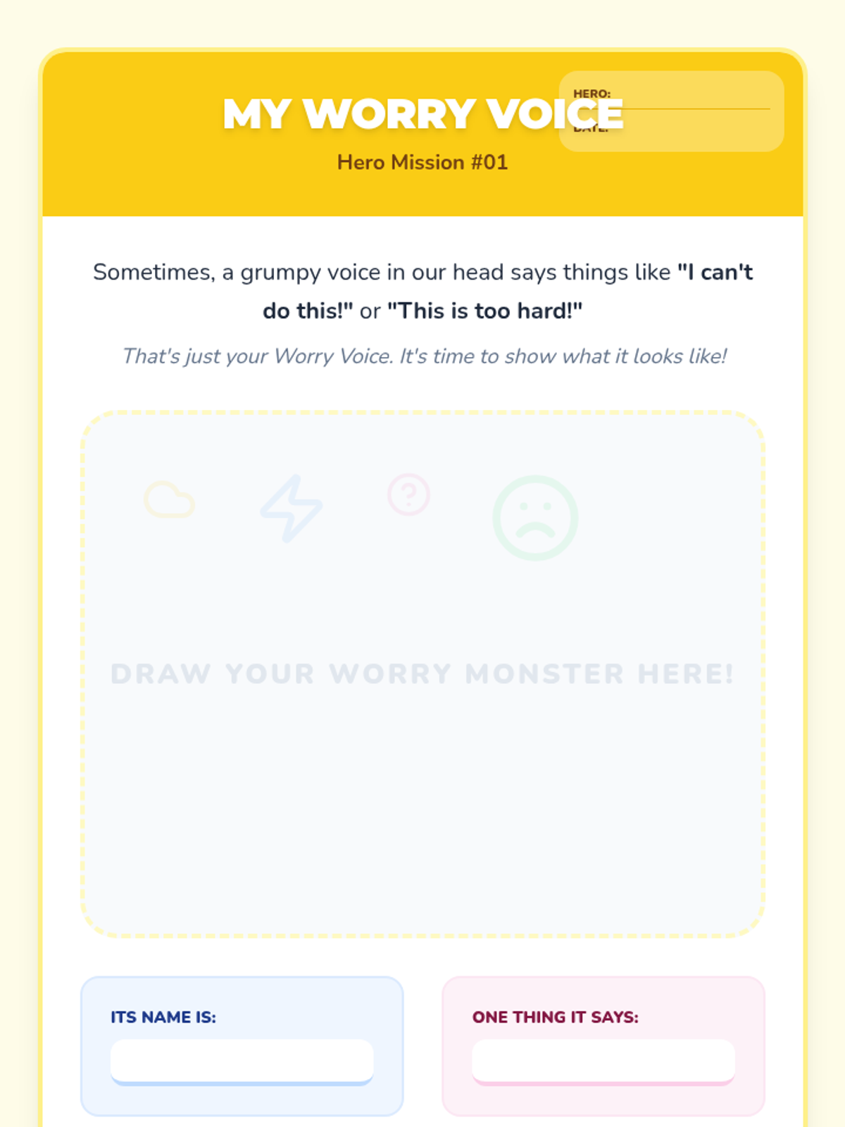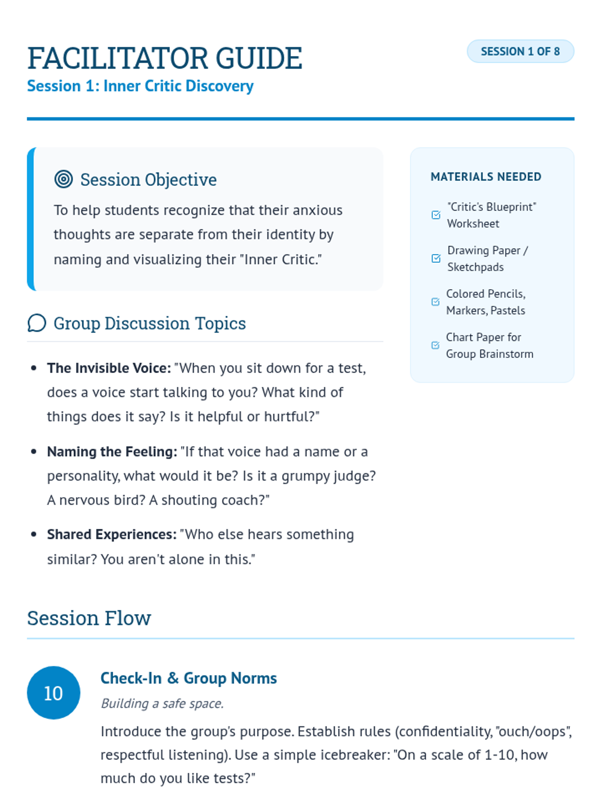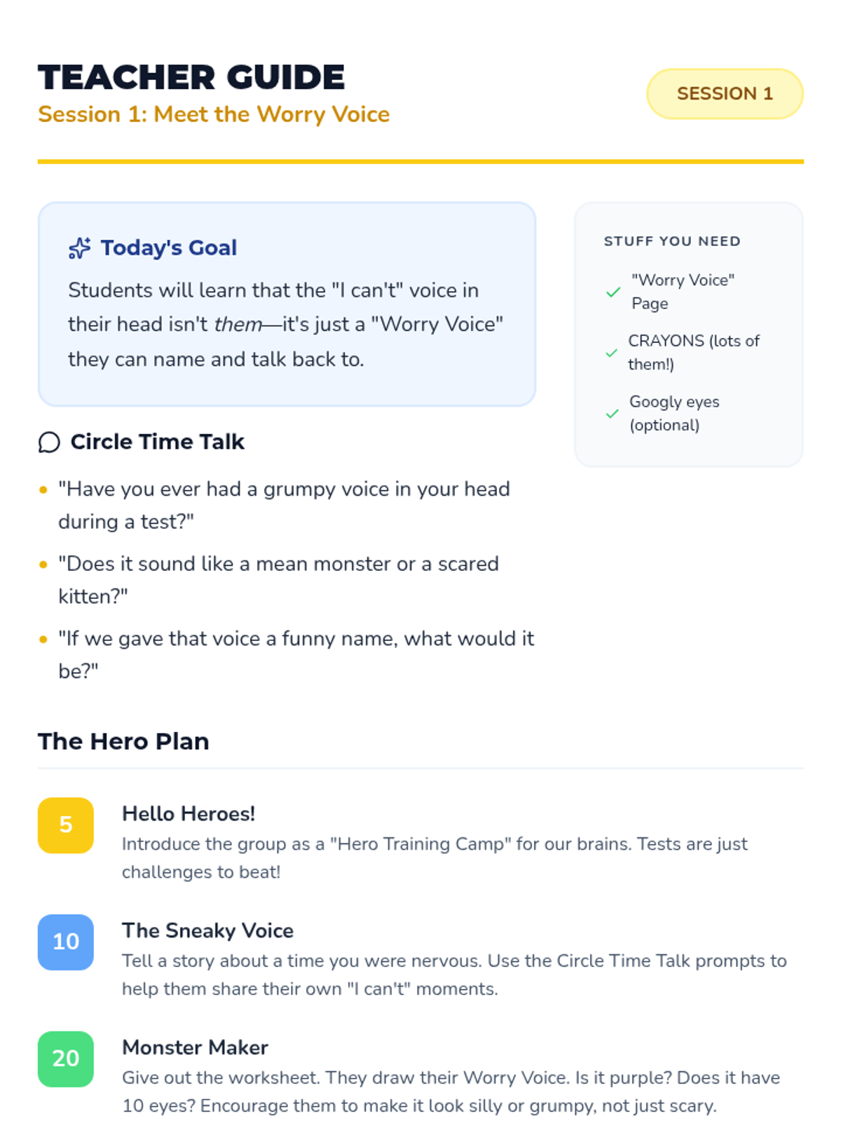 An 8-session counseling group for 2nd and 3rd graders to tackle test anxiety. Guided by Captain Calm, the Mindset Hero, students learn to spot their "Worry Voice," listen to their body, and use "Power Words" and "Chill-Out Tools" to feel brave and ready for tests.
