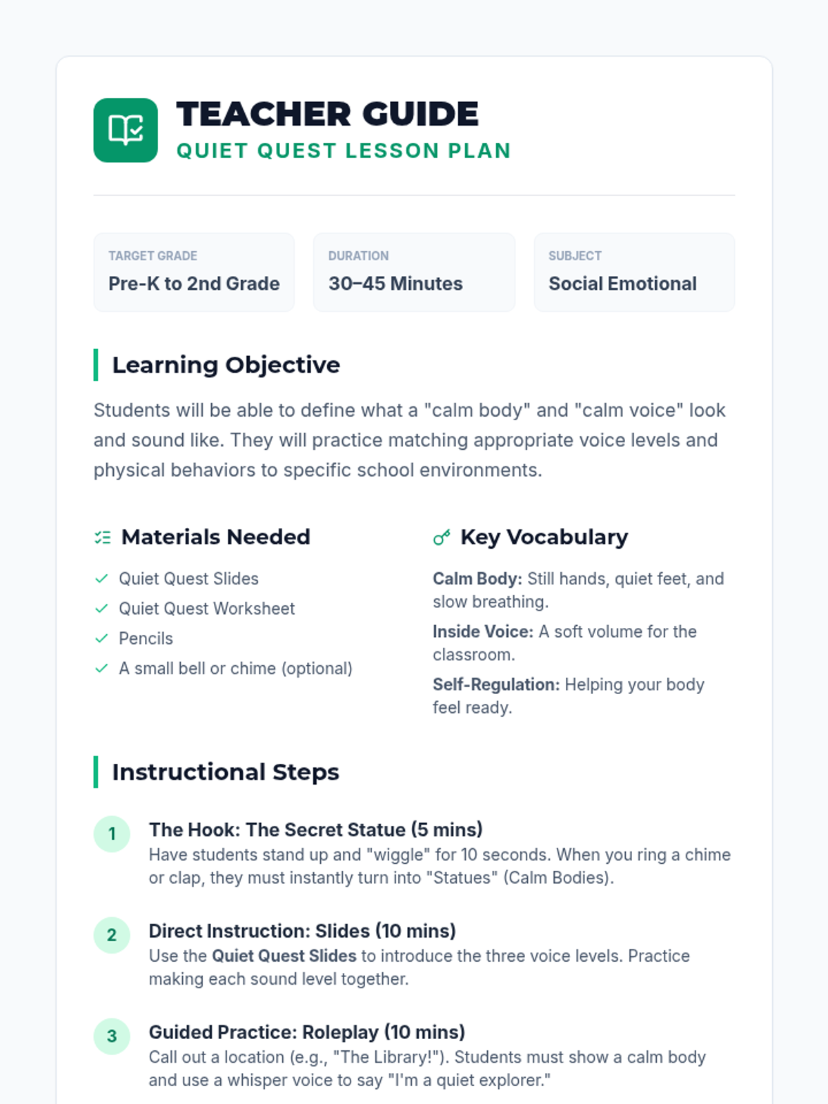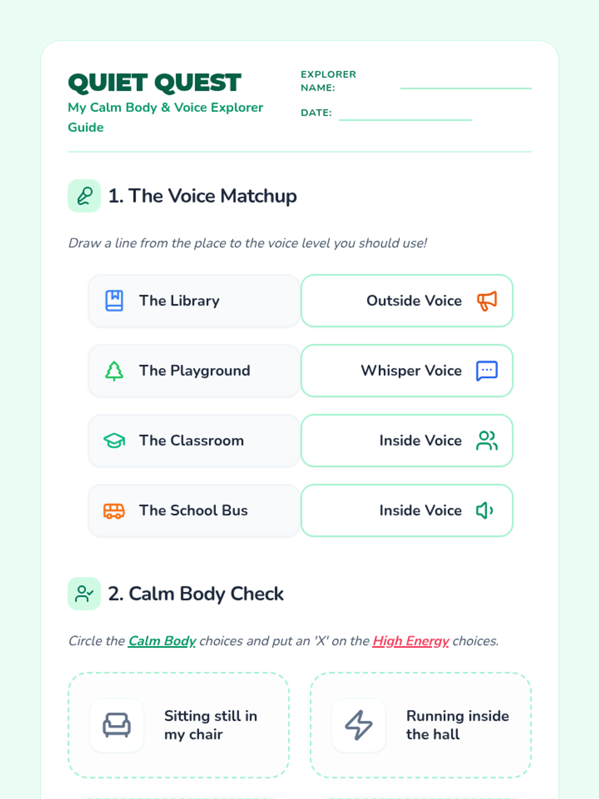 A two-day series designed to help young students develop self-regulation skills by mastering 'calm body' and 'calm voice' techniques in various school settings.