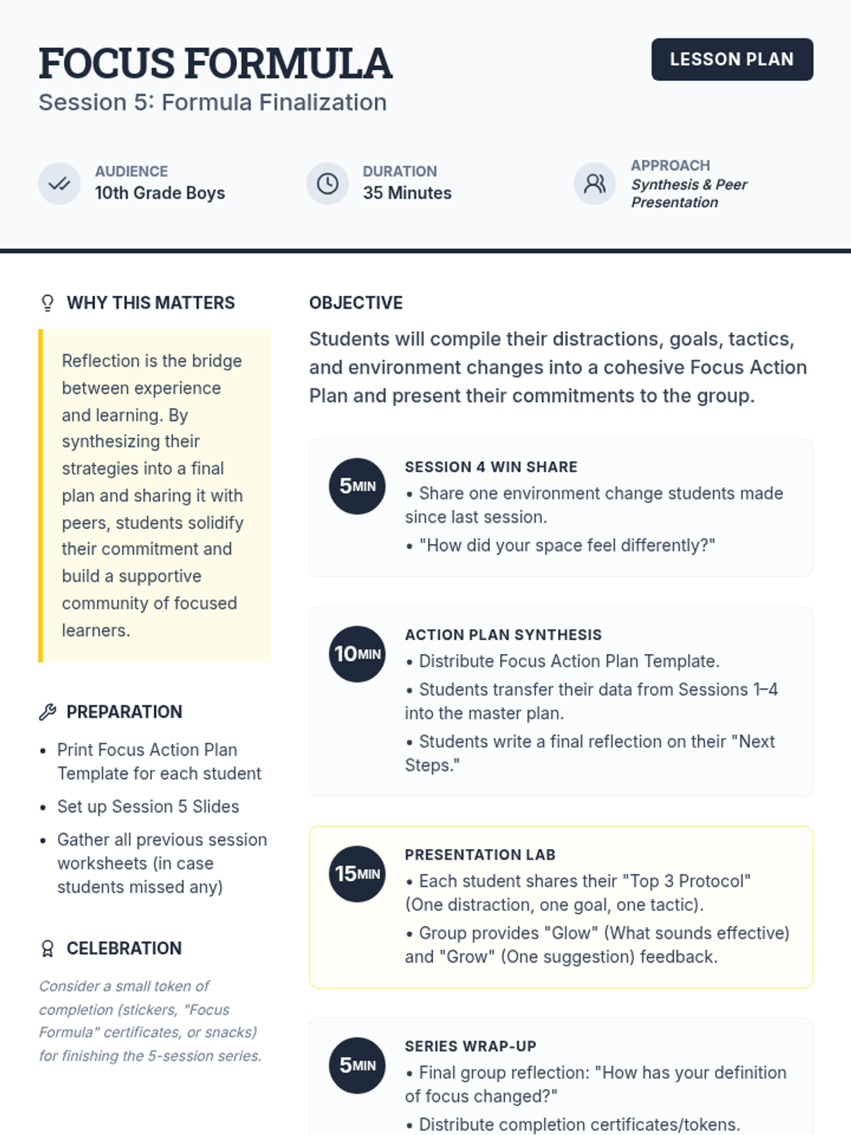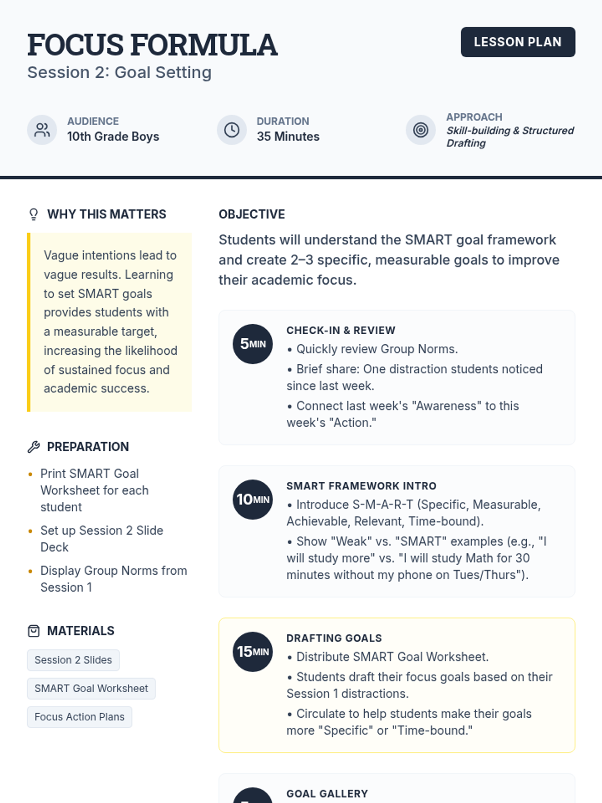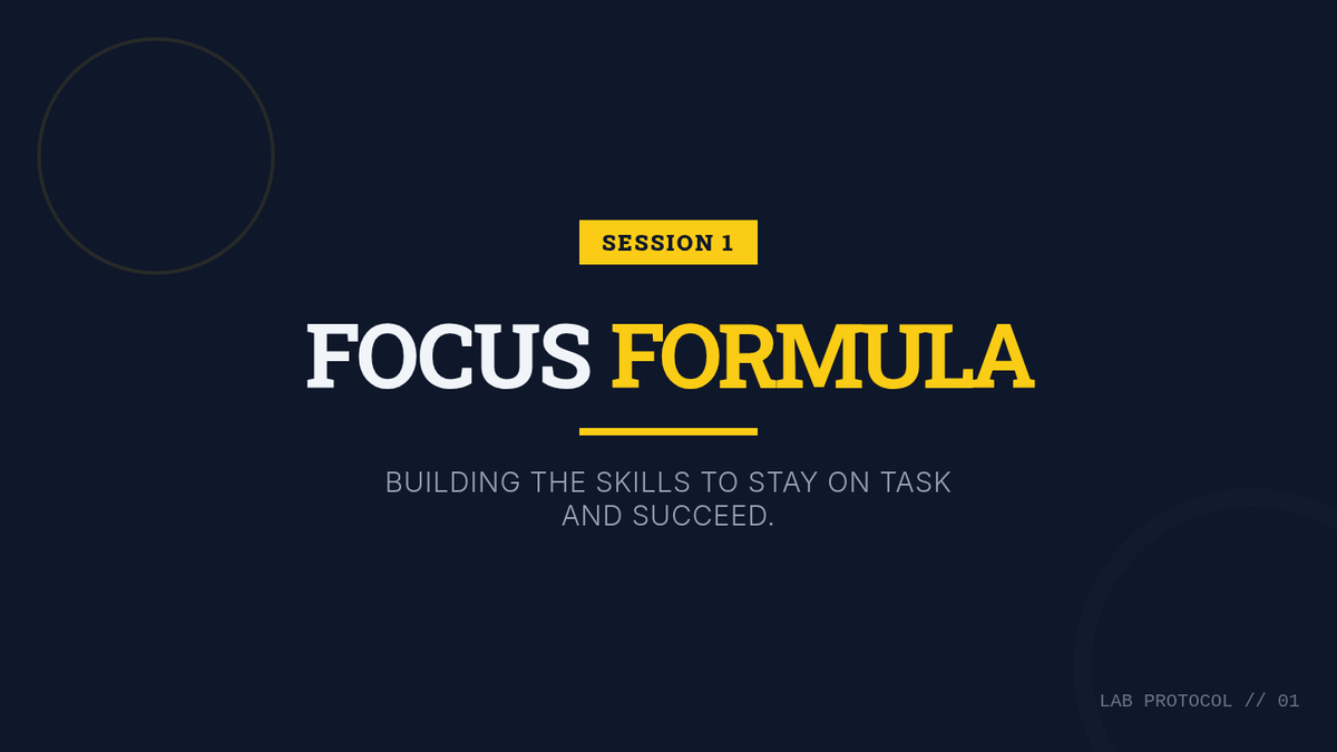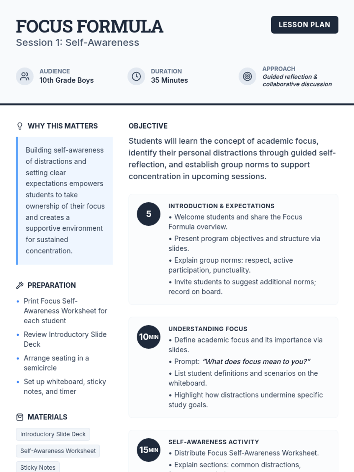 A 5-session group program for 10th grade boys focused on improving academic focus through self-awareness, goal-setting, concentration techniques, and environmental optimization. Students build a personalized Focus Action Plan throughout the series.