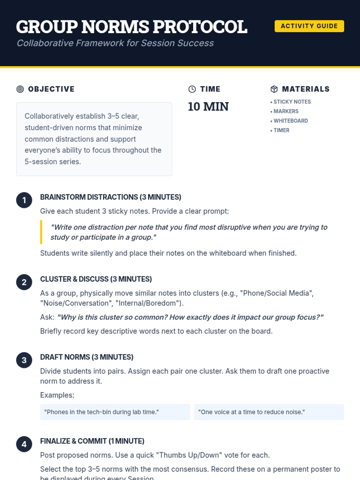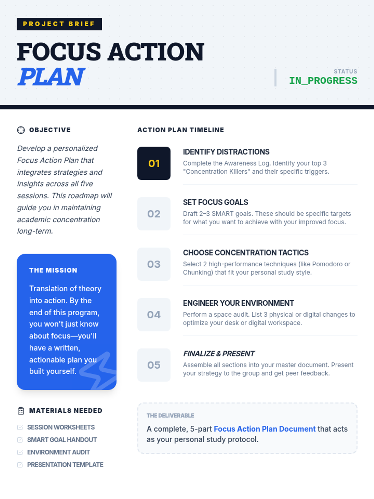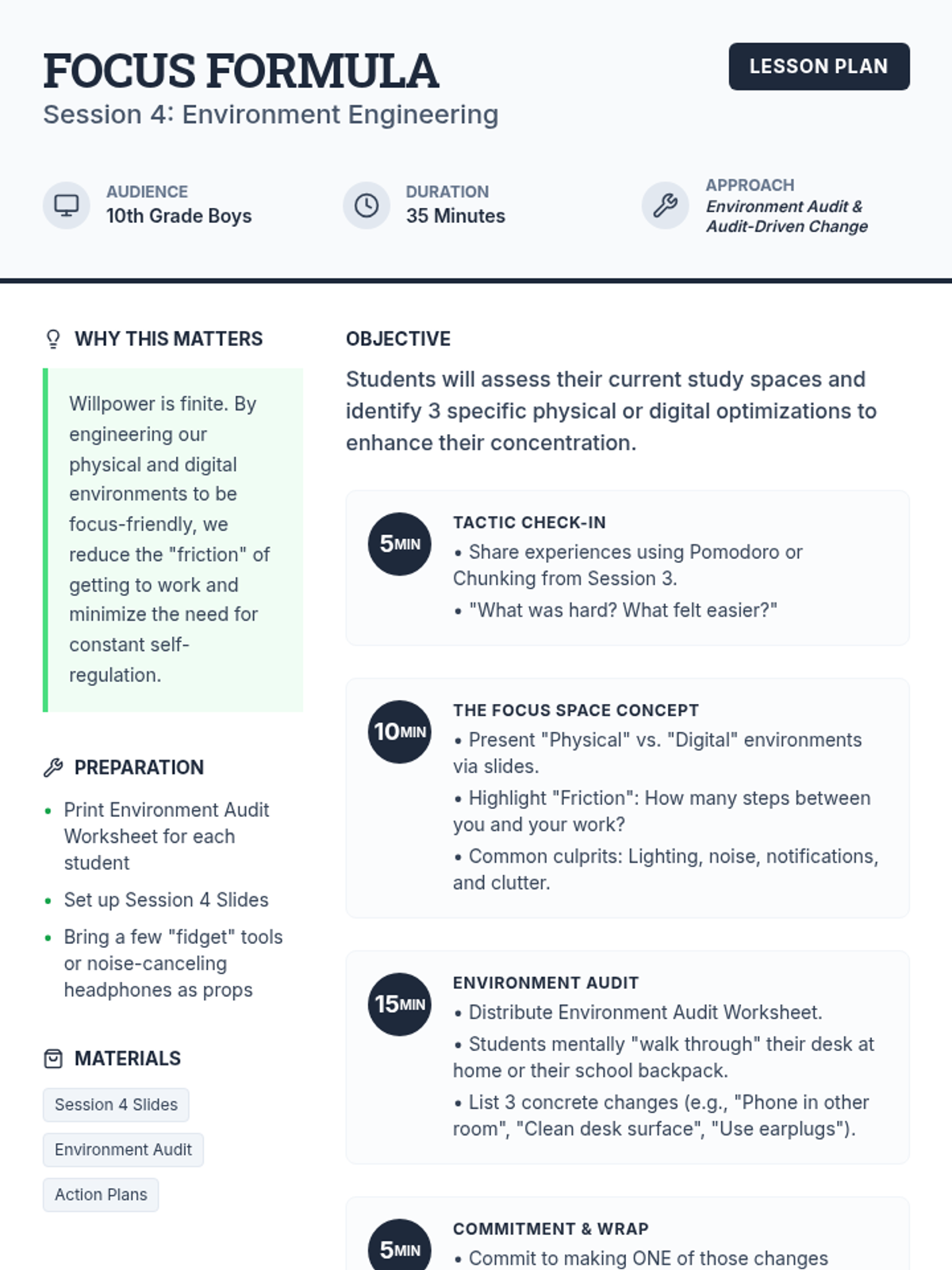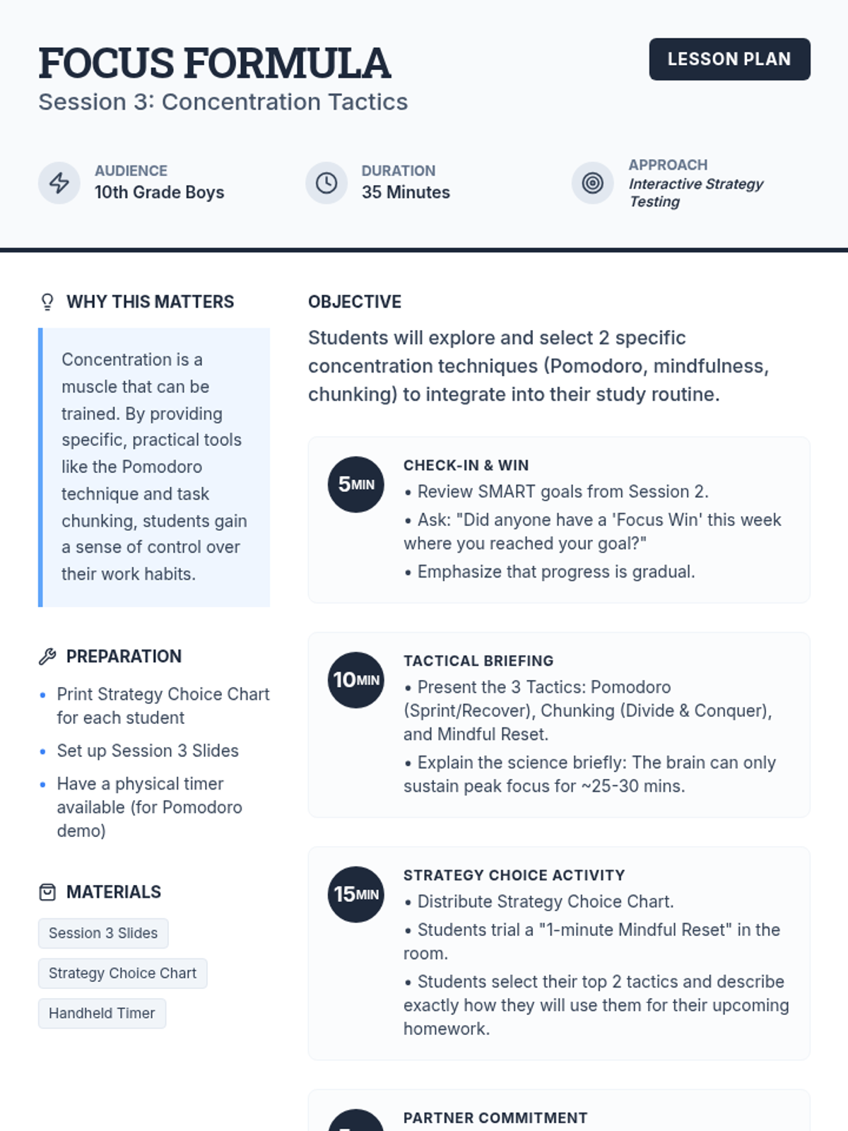 A 5-session group program for 10th grade boys focused on improving academic focus through self-awareness, goal-setting, concentration techniques, and environmental optimization. Students build a personalized Focus Action Plan throughout the series.