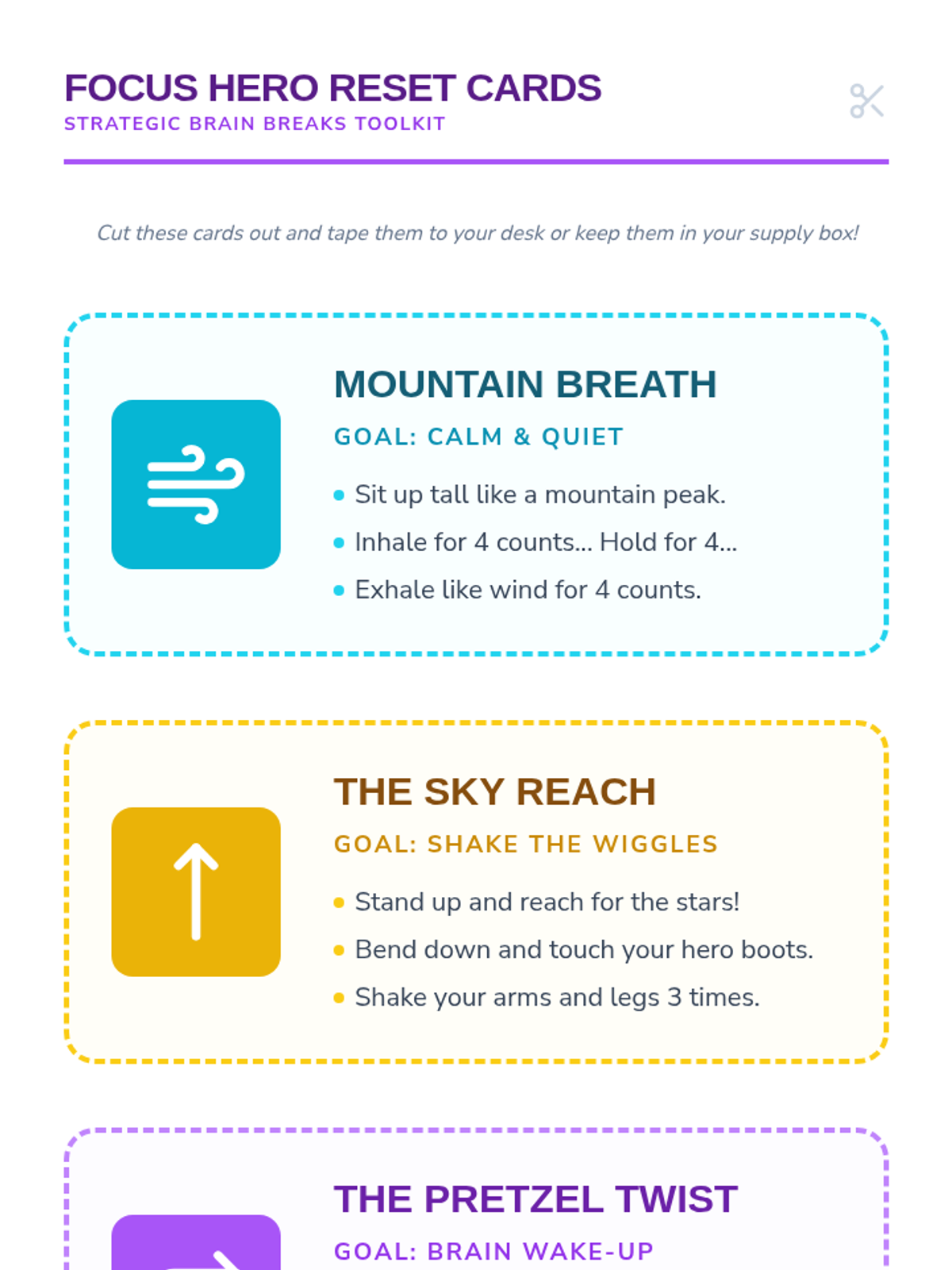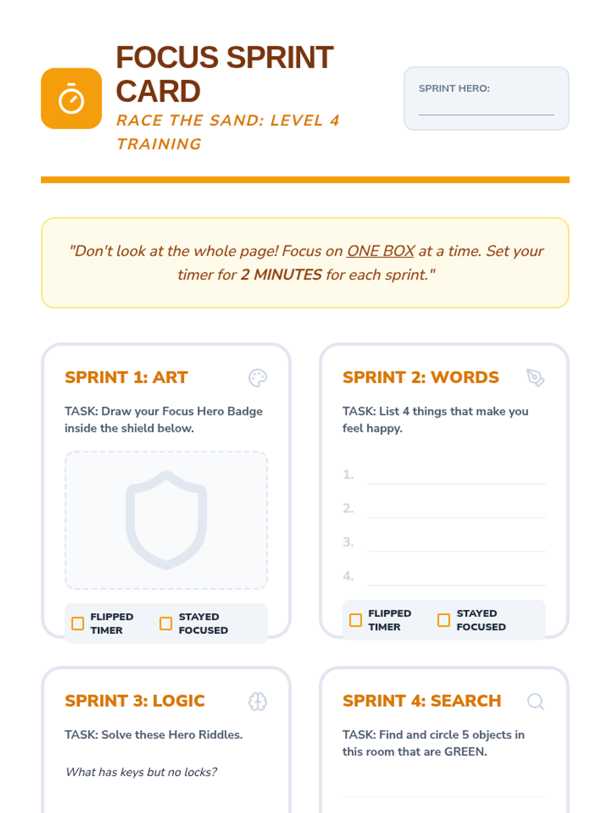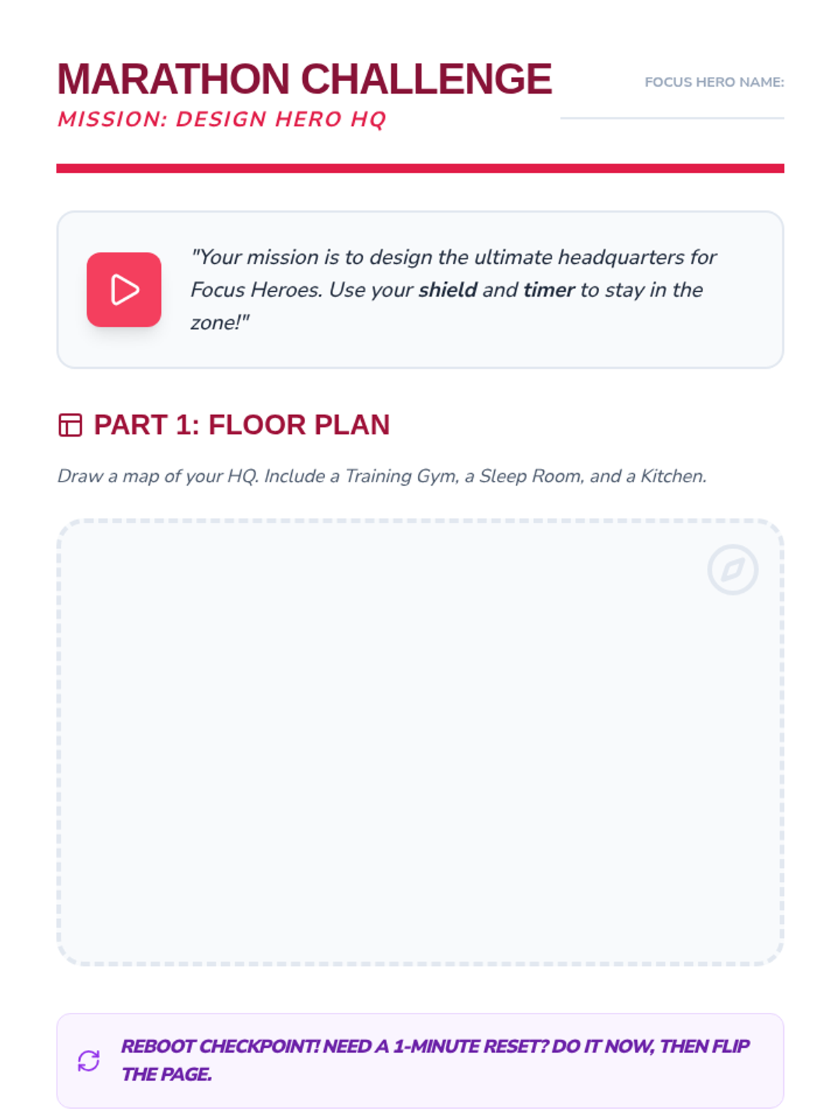 A gamified sequence designed for 3rd-grade students to build sustained attention and working memory stamina. Students learn to identify distractions, manage their environment, use timers, and utilize strategic brain breaks to complete complex tasks.