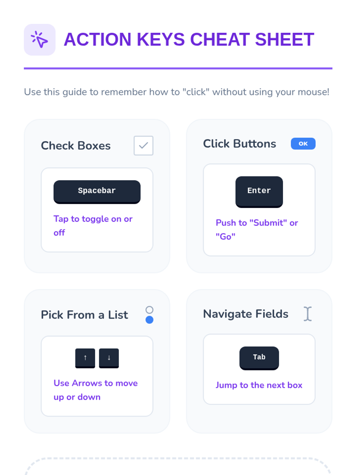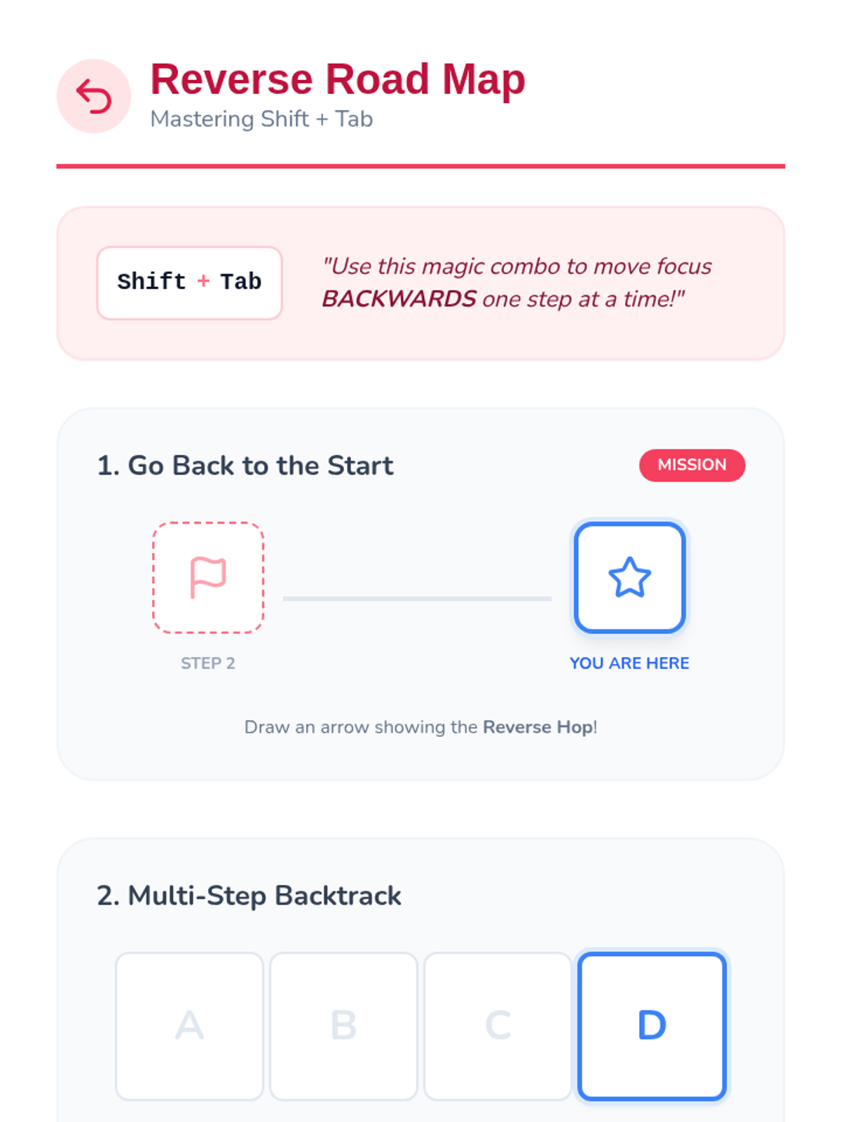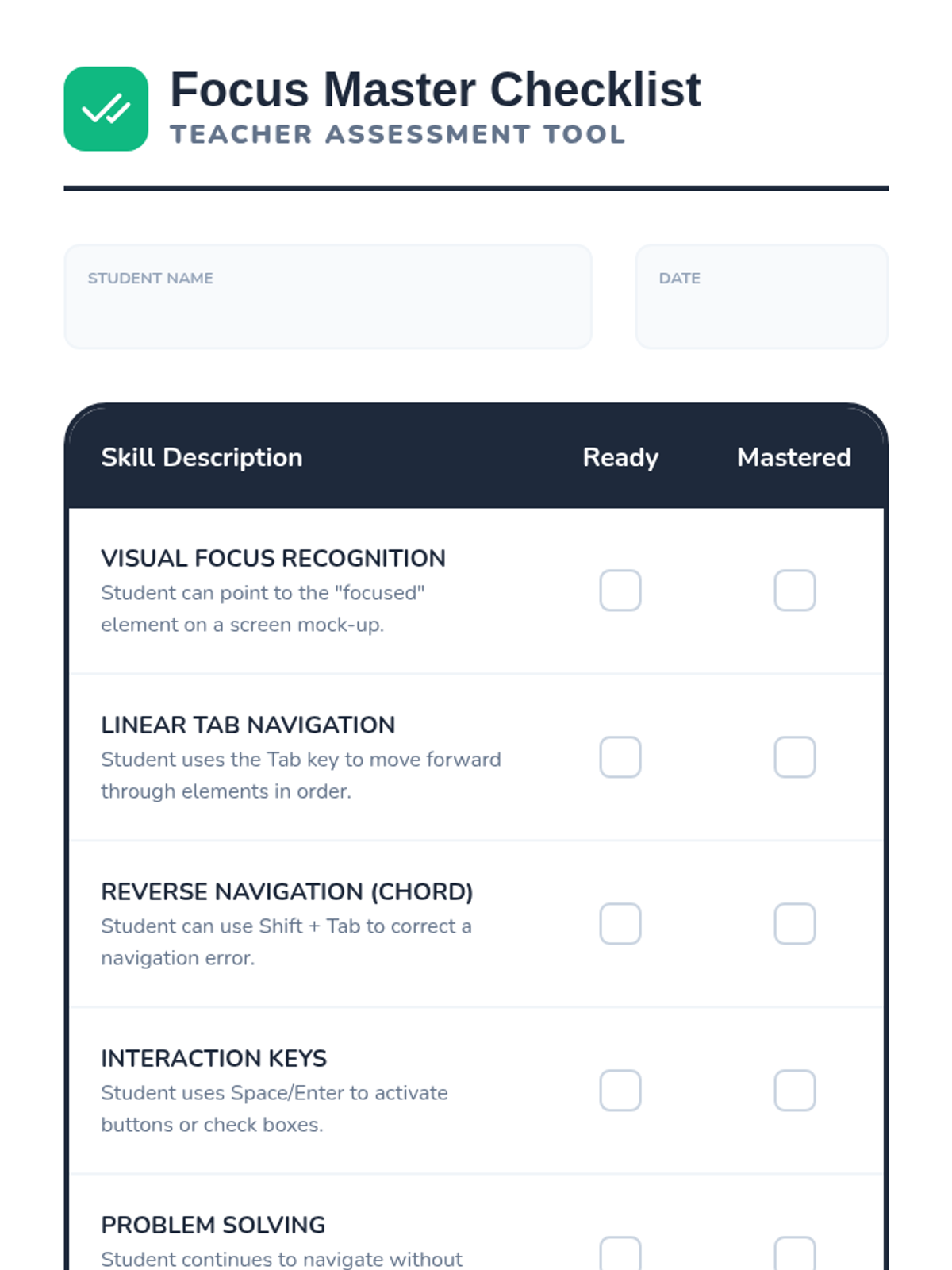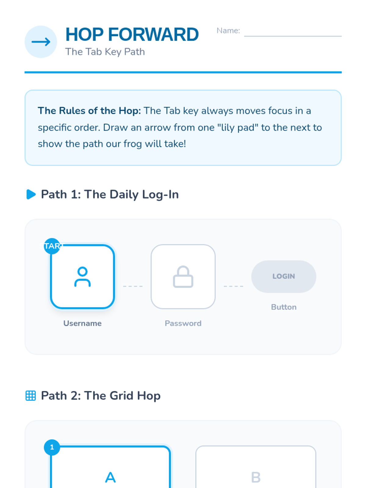 A comprehensive sequence for 2nd-grade students to master keyboard navigation using the Tab key, Shift + Tab, and interaction keys like Space and Enter. Students follow a 'Lily Pad' theme, learning to move the digital 'focus' to navigate forms and interfaces without a mouse.