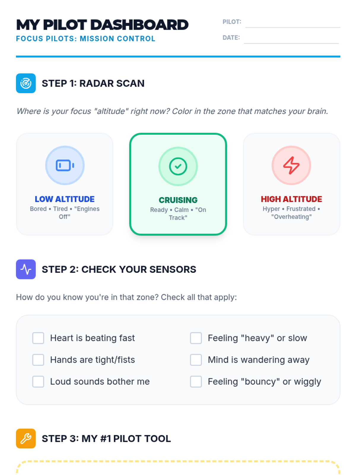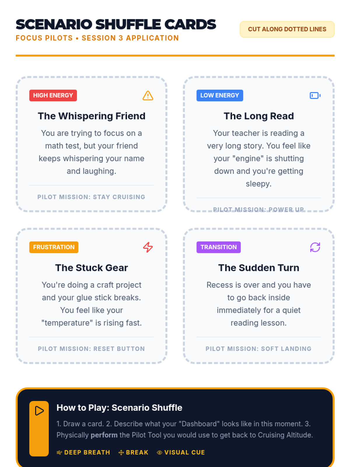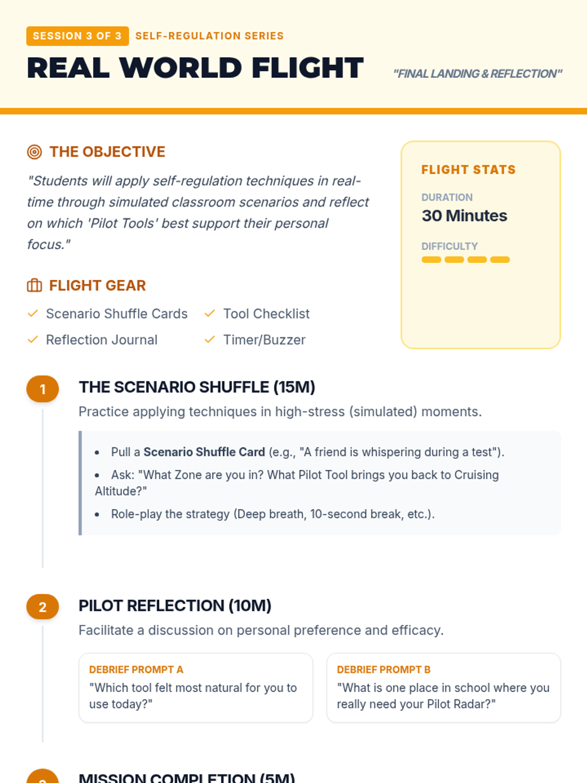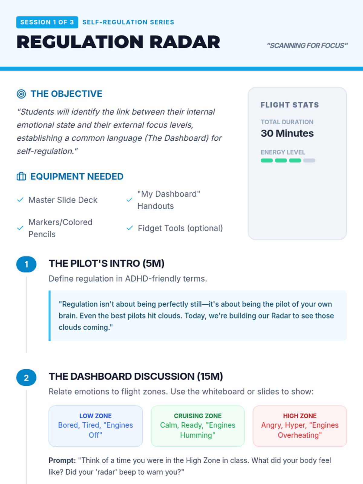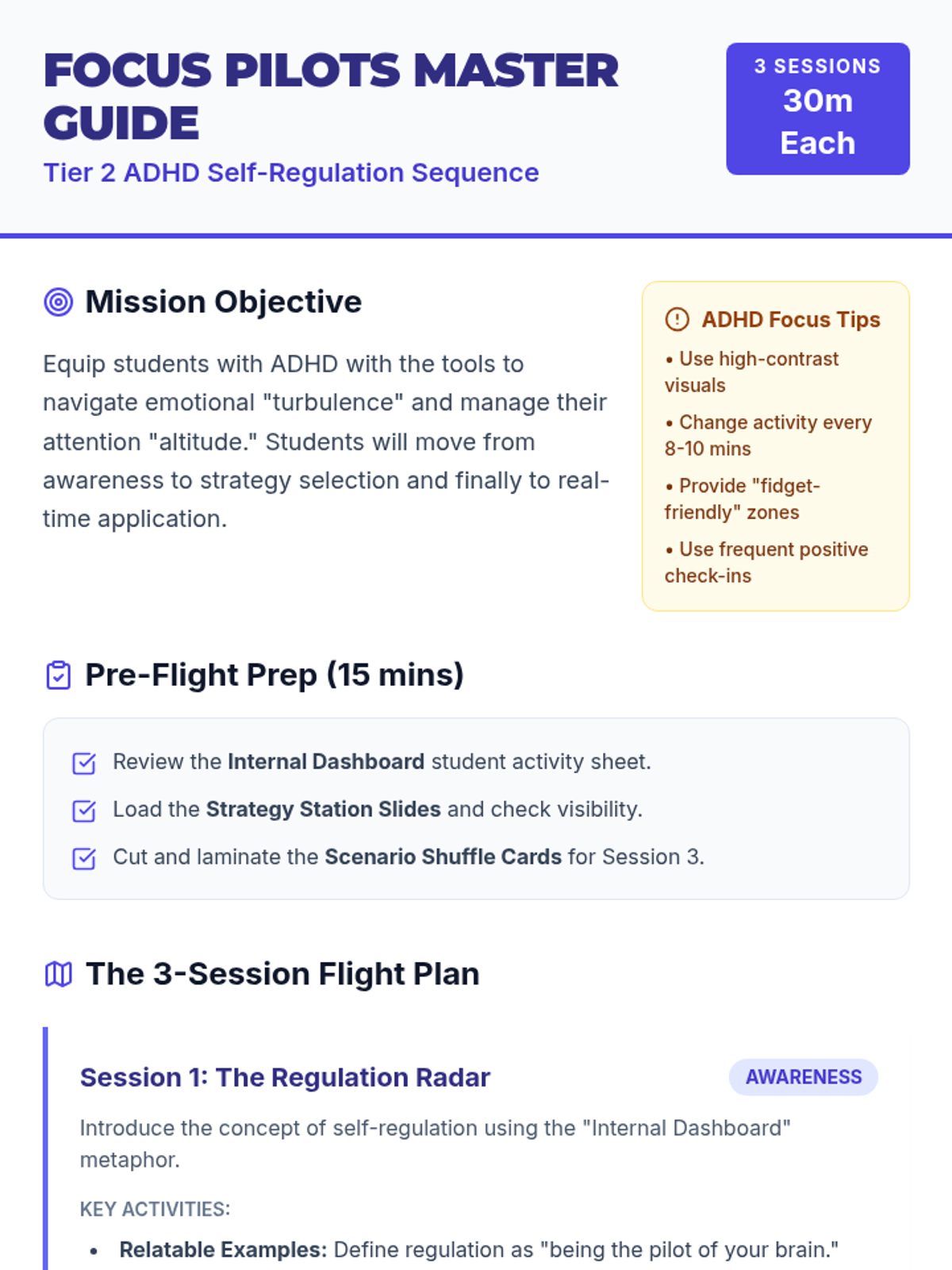 A 3-session sequence for students with ADHD focused on developing self-regulation skills. Students learn to recognize emotions, build a toolbox of focus strategies, and practice real-time regulation techniques.