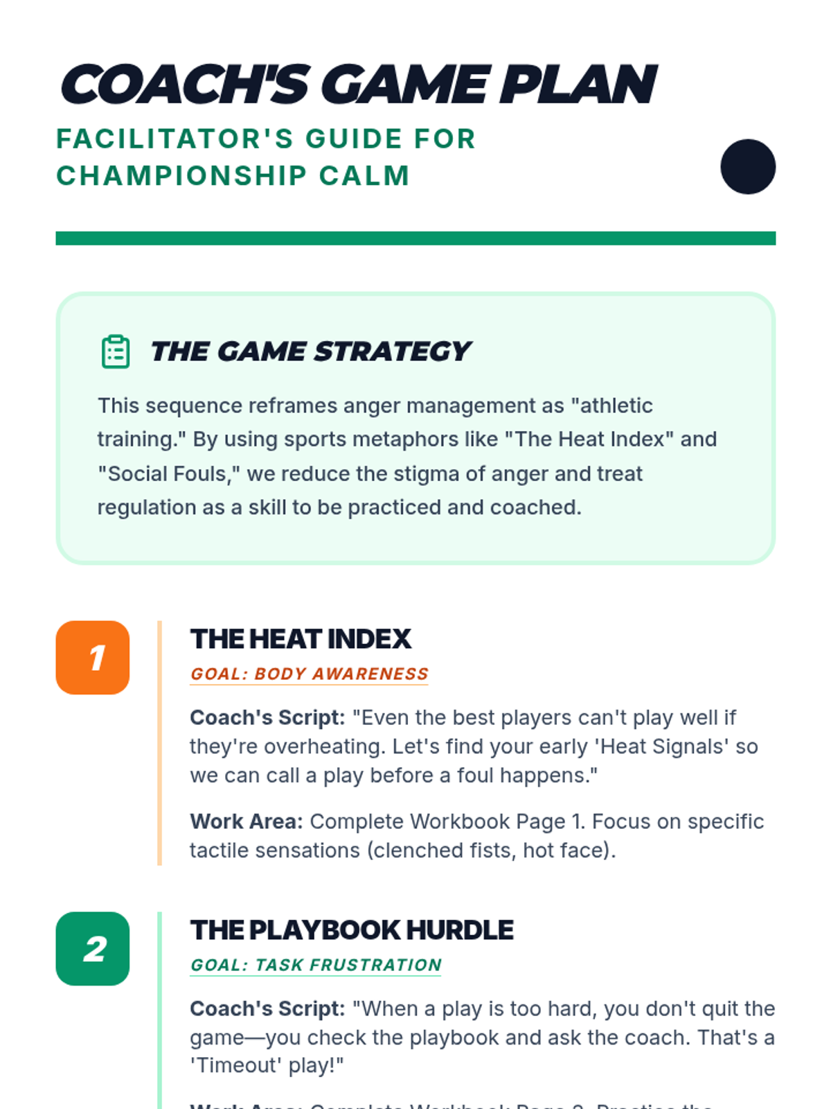A four-part social-emotional learning sequence for second graders to master anger management. This sports-themed series uses an athlete's playbook to help students identify body heat signals, overcome curriculum hurdles, and handle peer "fouls" with confidence and calm.