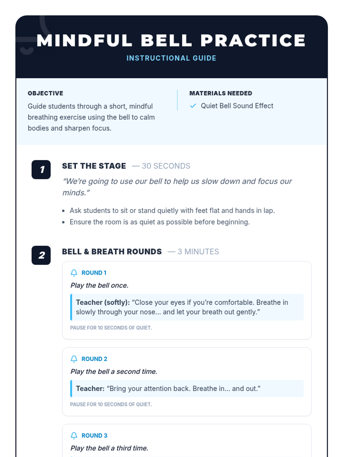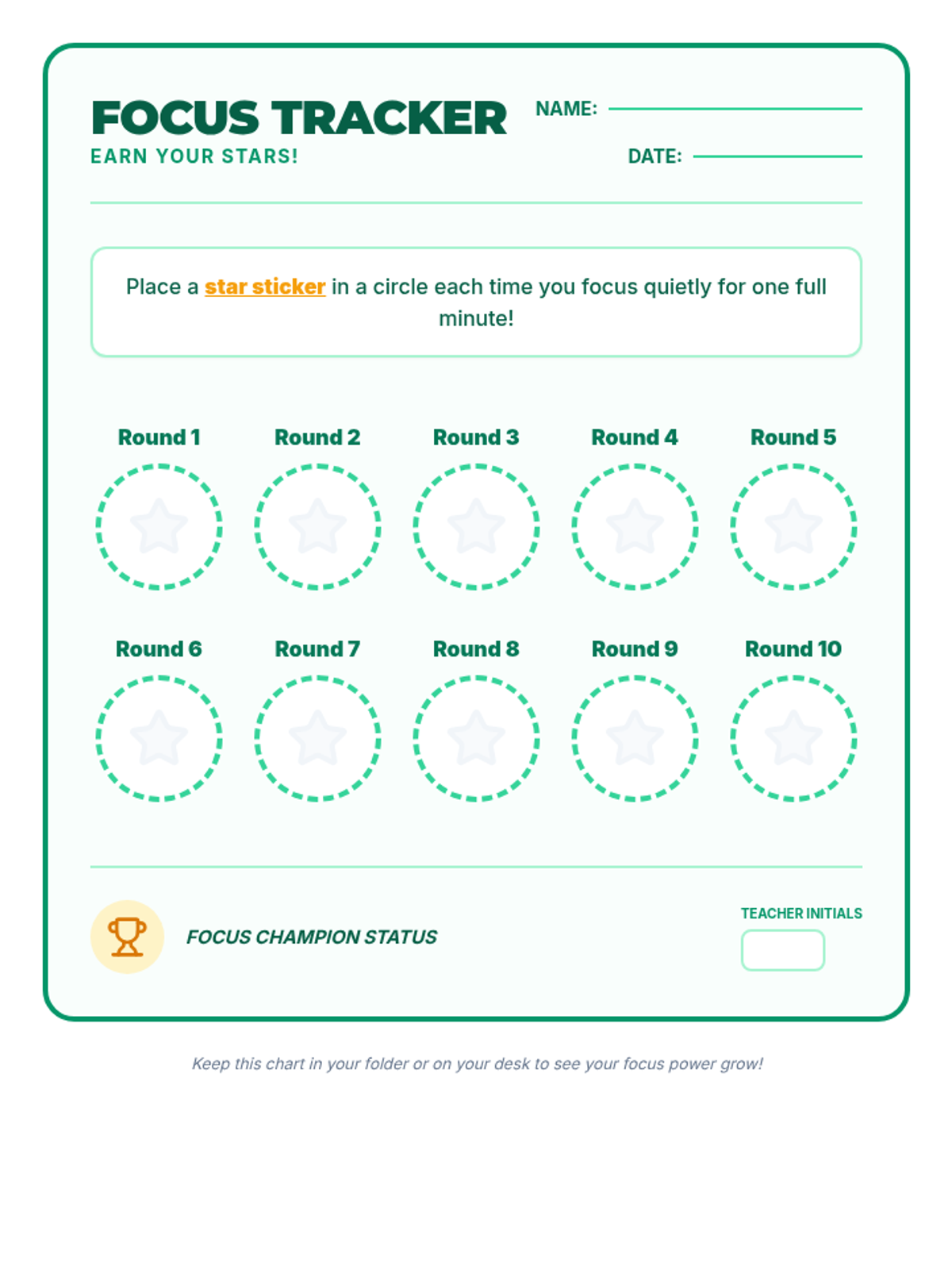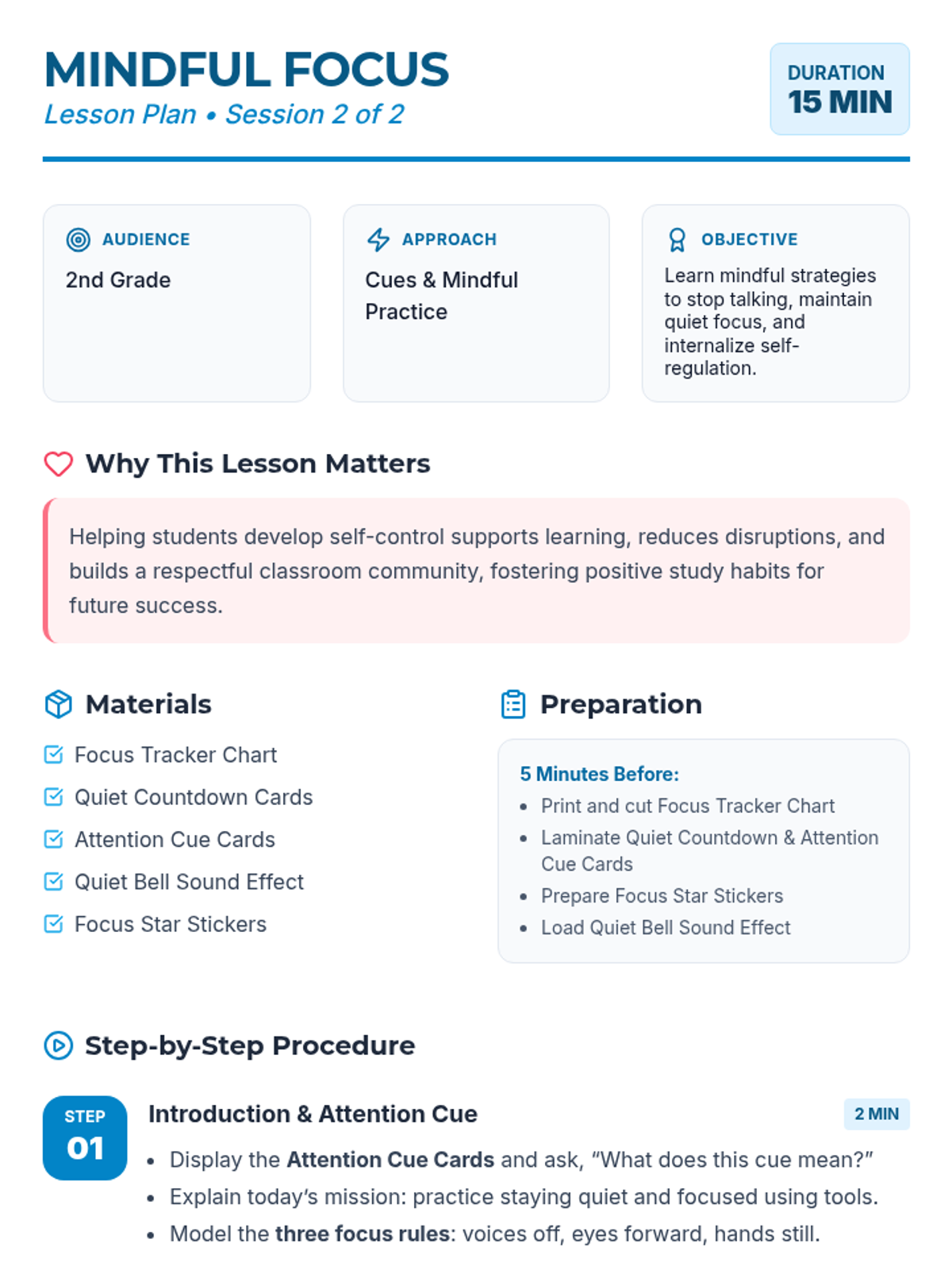 A 2-part Tier 1 lesson sequence for 2nd graders to develop self-regulation and focus through ninja-themed movement and mindful breathing. Students learn to use attention cues, countdowns, and tracker charts to manage classroom behavior.
