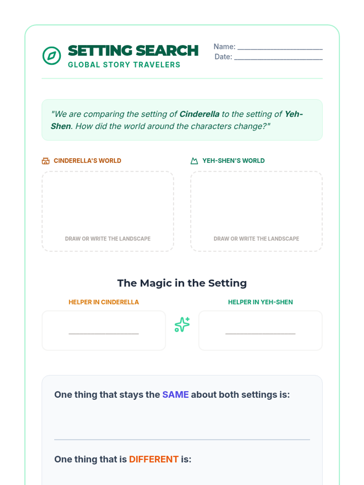 A 2nd-grade ELA unit where students explore how stories change across cultures. Using 'Cinderella' as a baseline, students compare settings, characters, and themes in versions from around the world, culminating in a comparative museum project.