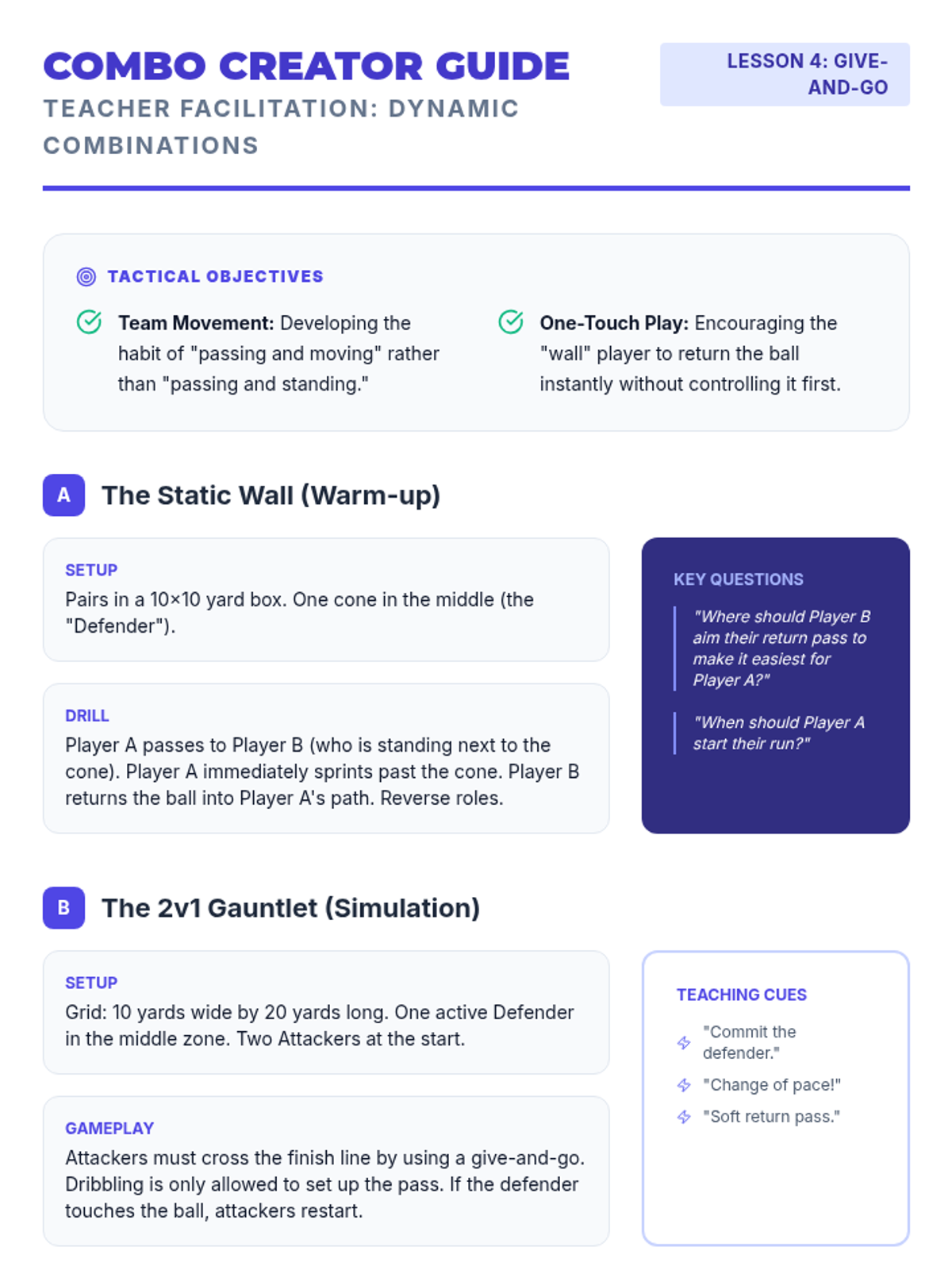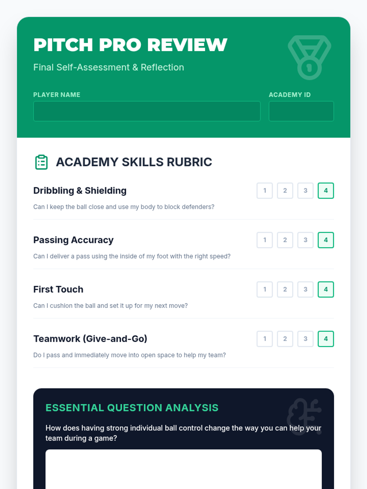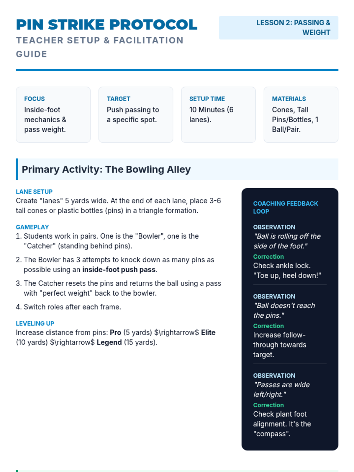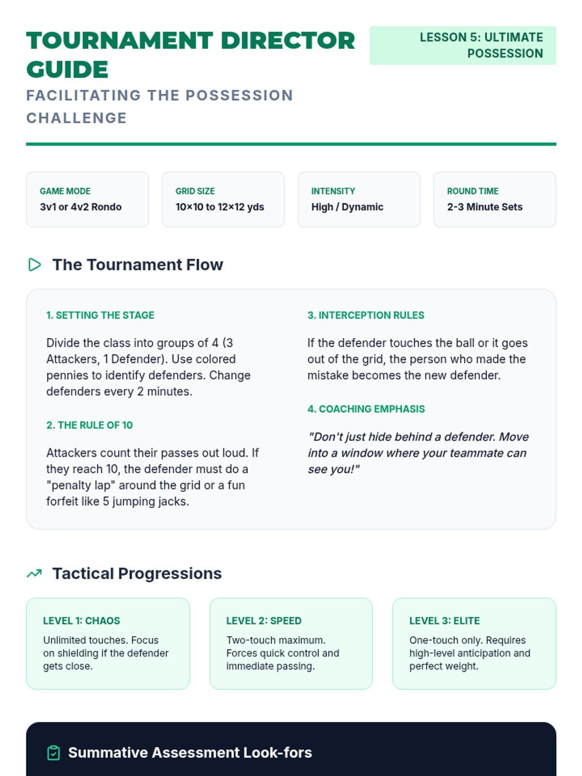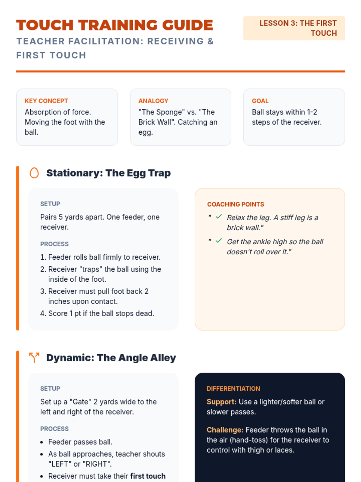 This sequence focuses on the technical foundations of football (soccer), including dribbling, passing, receiving, and tactical movement. Students progress from individual ball mastery to dynamic team-based possession drills.