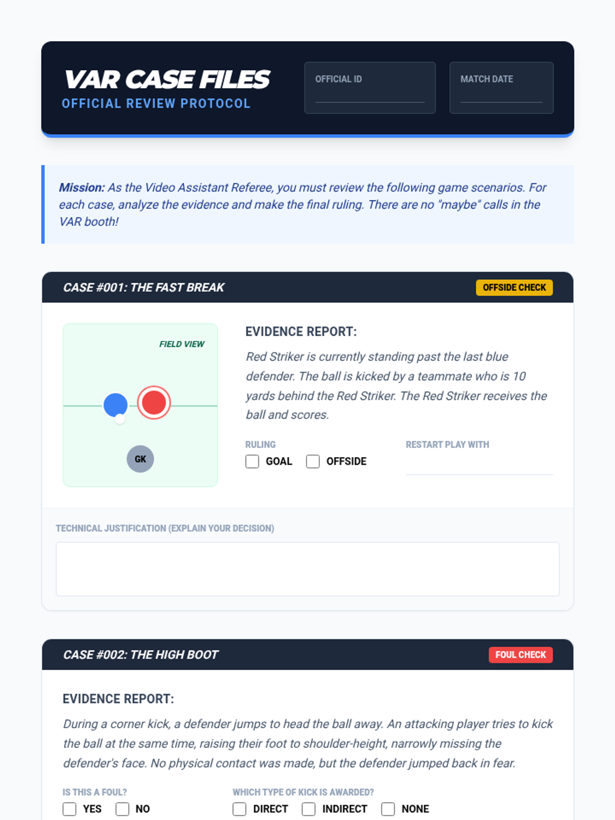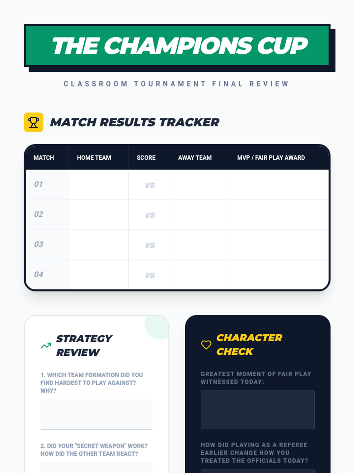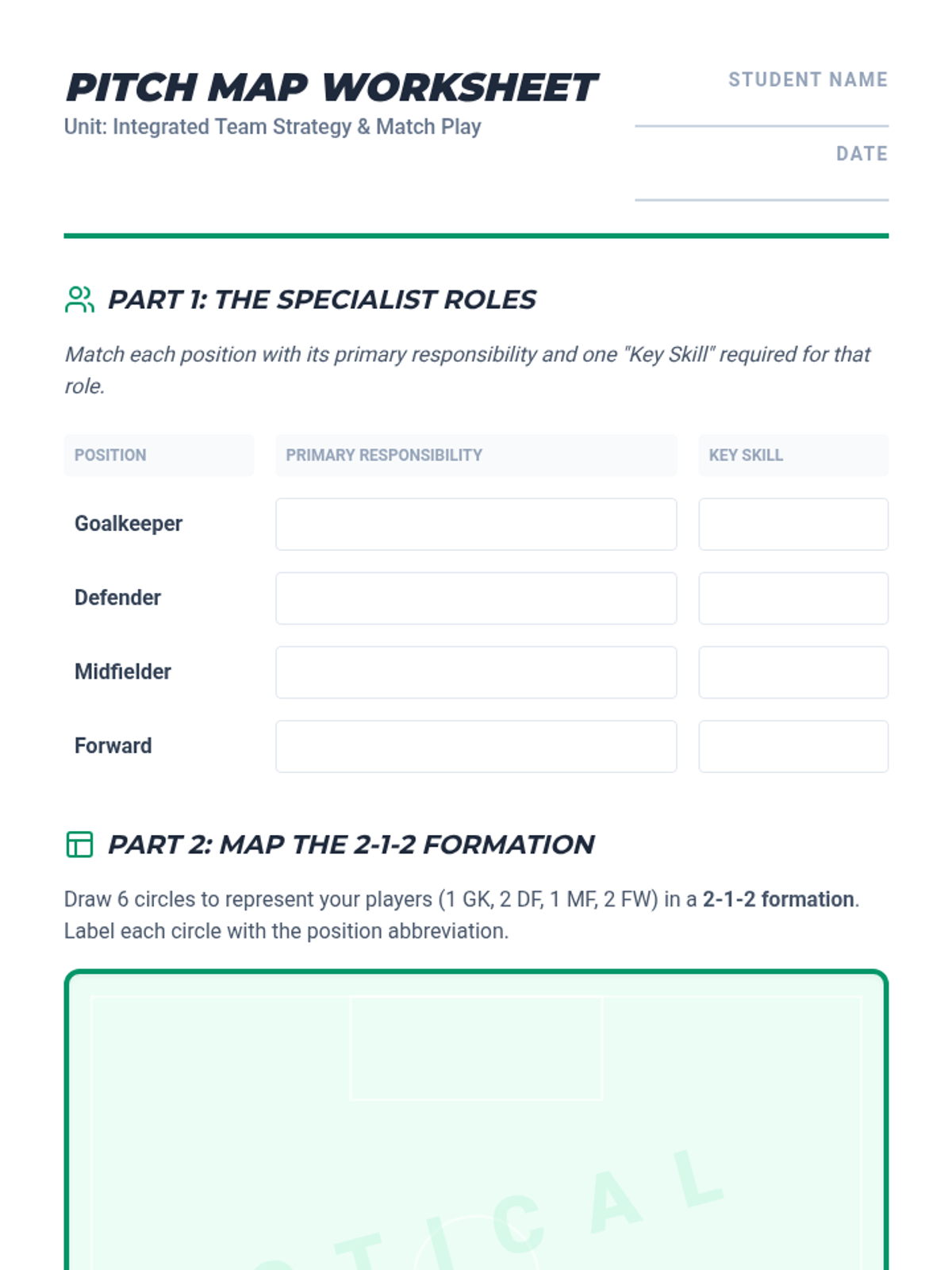 A 6th-grade physical education unit that transitions students from isolated skills to holistic match play. Students take on roles as players, strategists, and officials to explore formations, complex rules like offside, and the importance of fair play in a competitive environment.