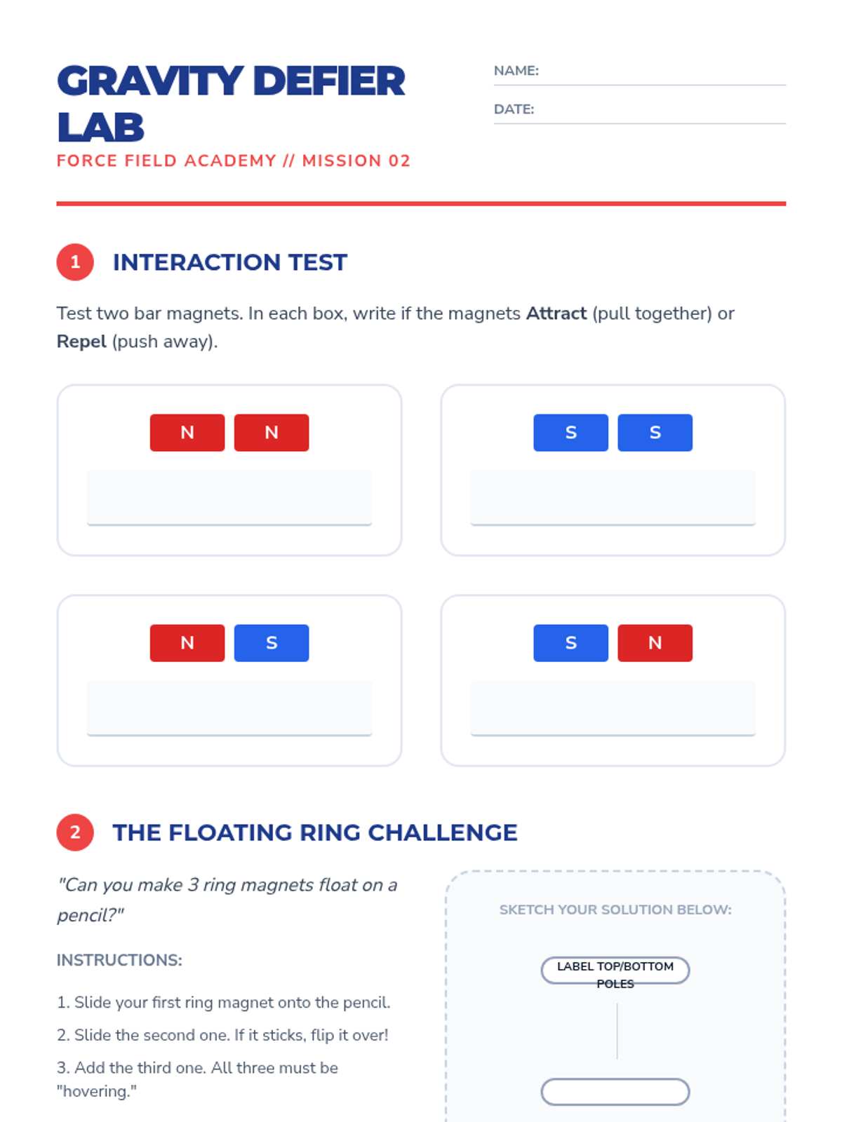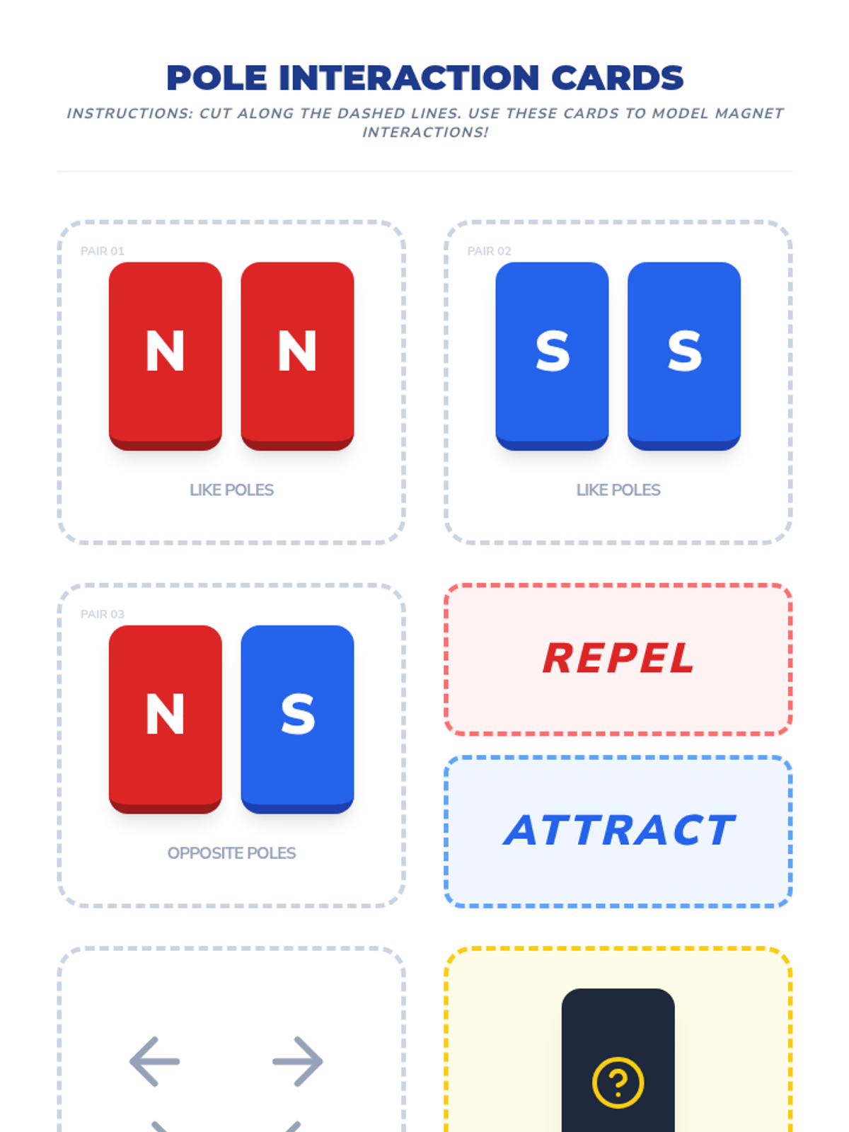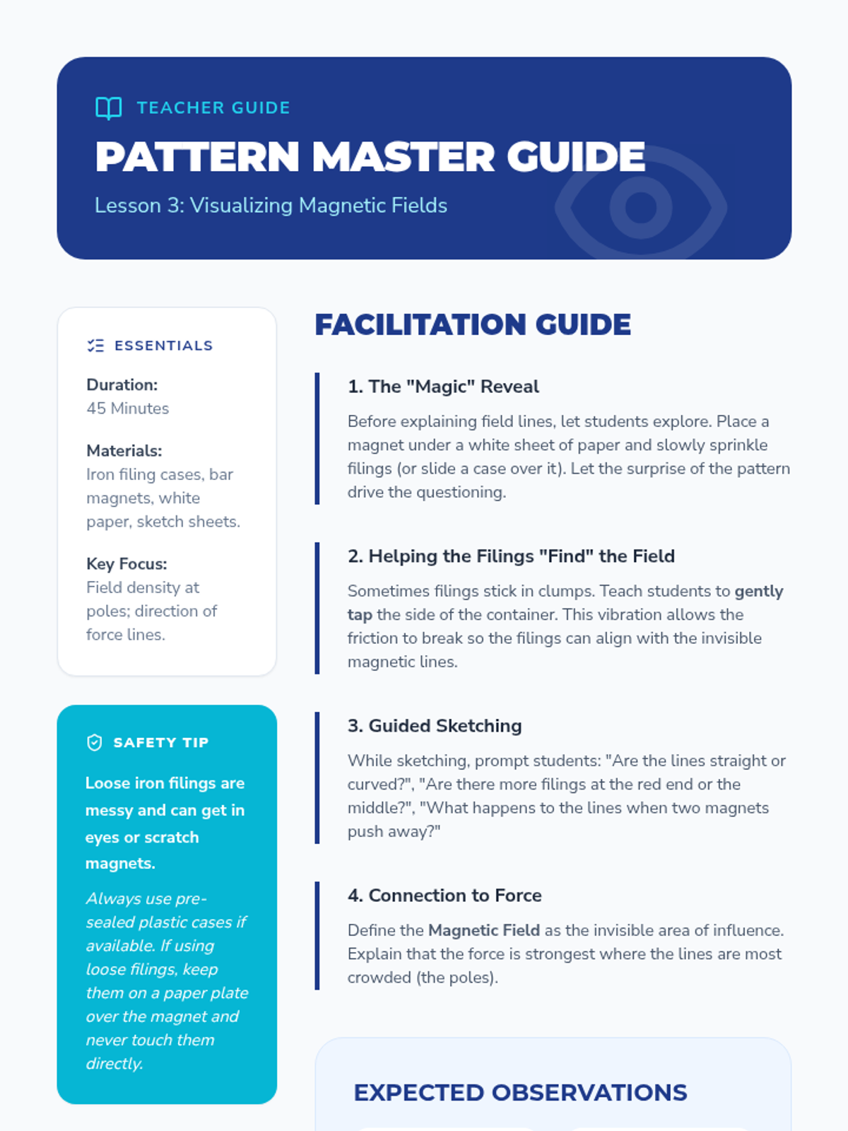 A hands-on physics sequence for 4th graders exploring magnetism through discovery, visualization, and experimentation. Students investigate magnetic materials, polarity, field patterns, and Earth's magnetic force.