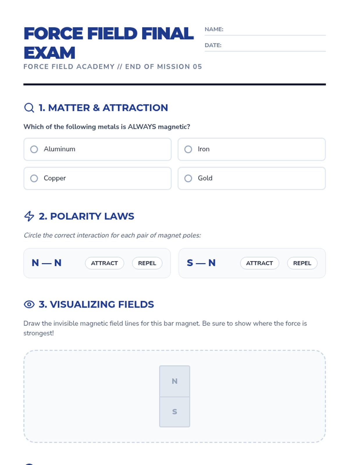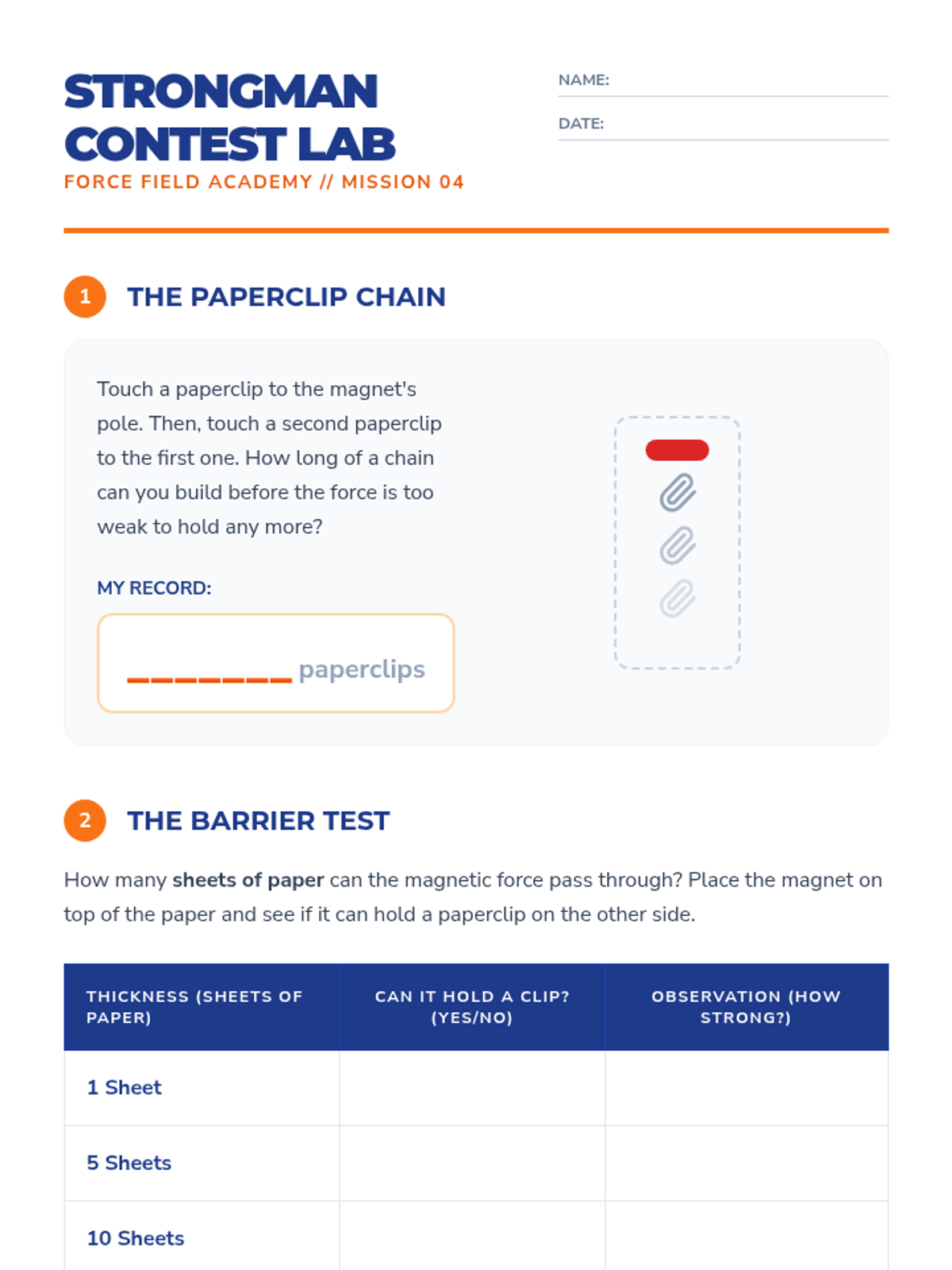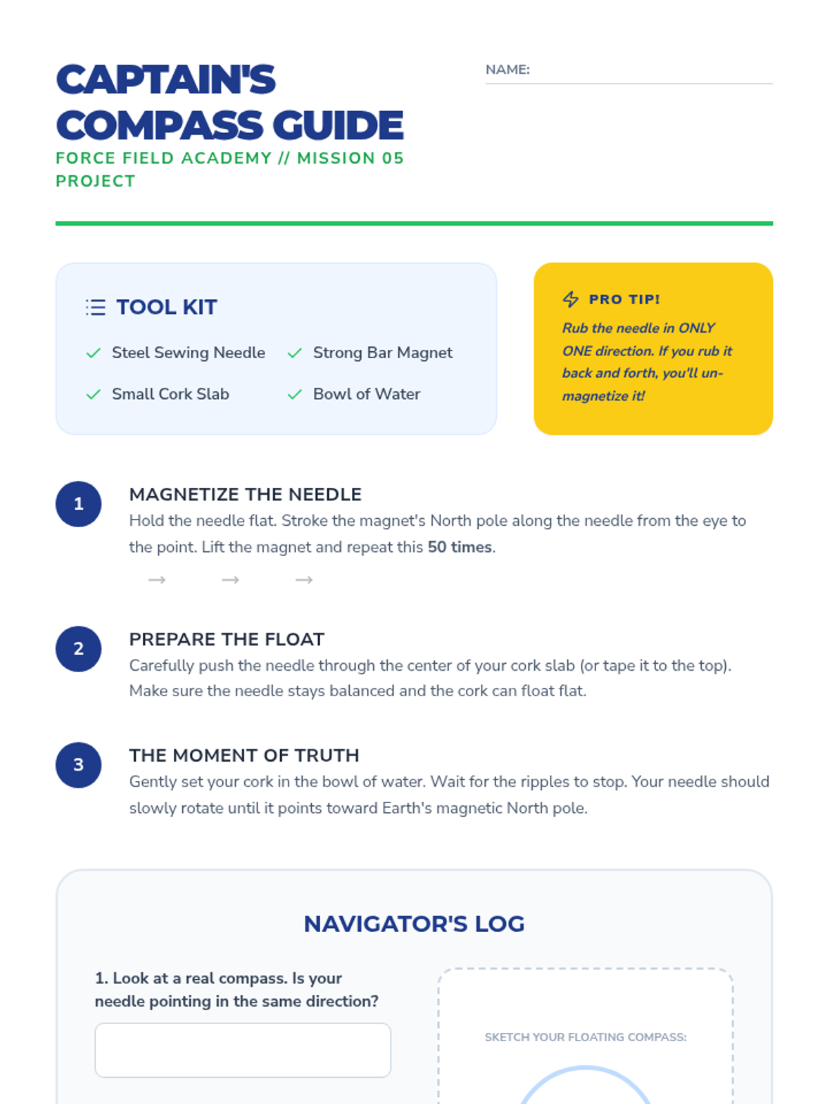 A hands-on physics sequence for 4th graders exploring magnetism through discovery, visualization, and experimentation. Students investigate magnetic materials, polarity, field patterns, and Earth's magnetic force.