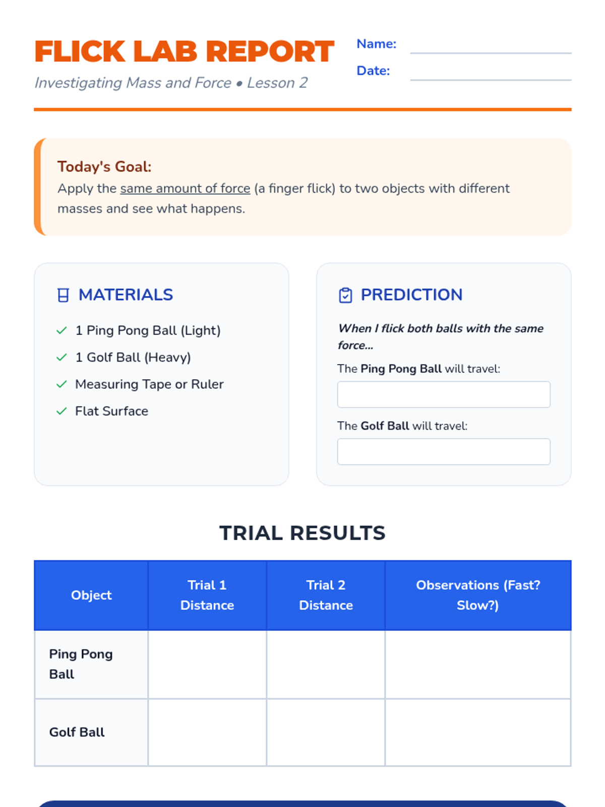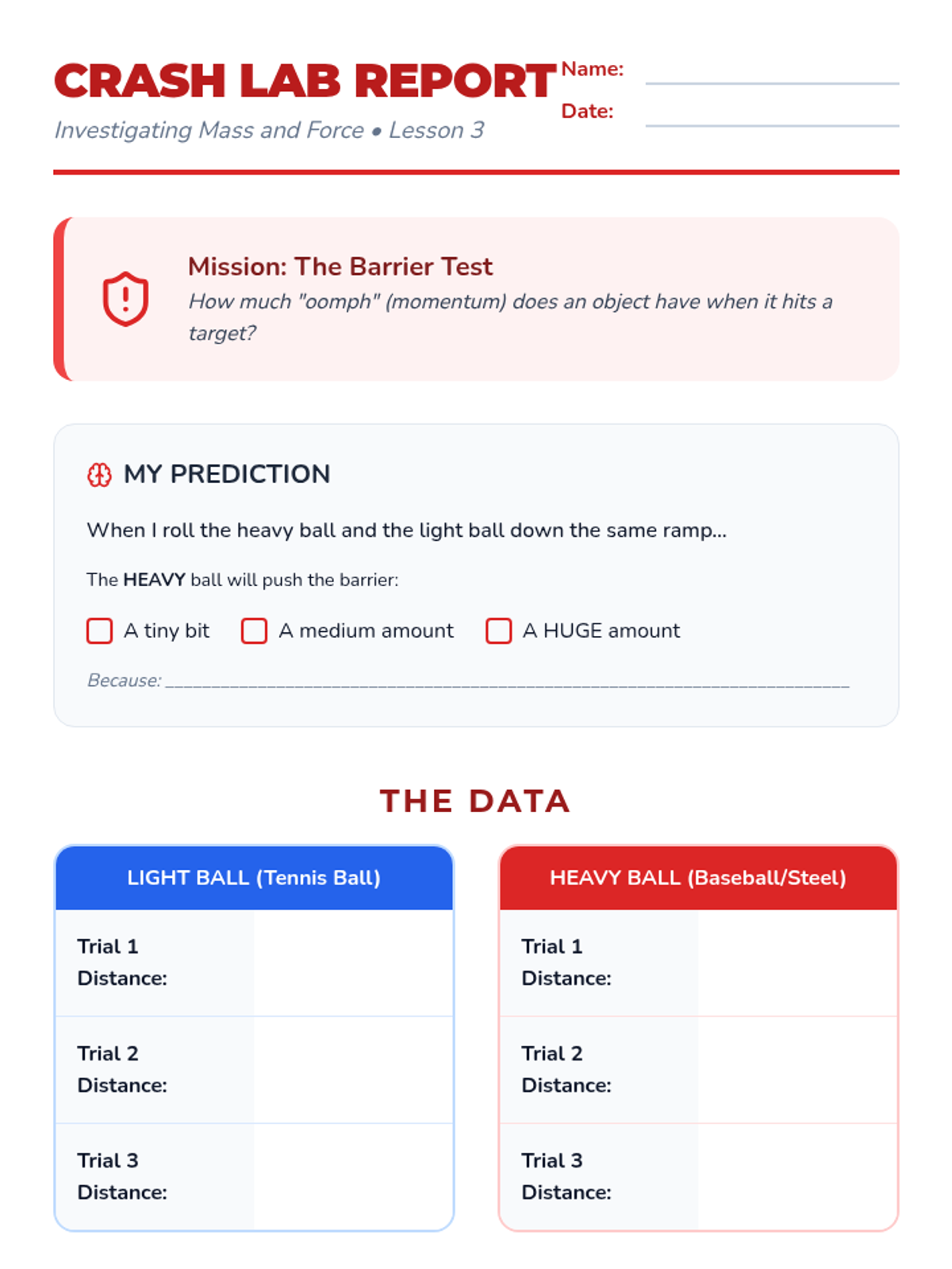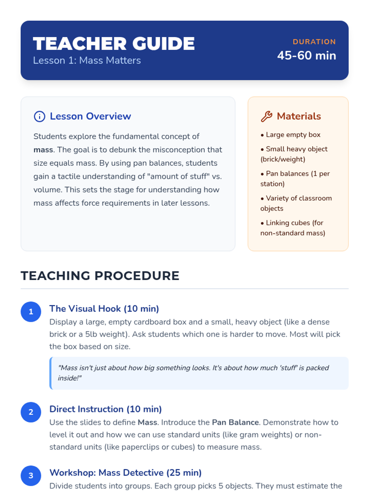 A 3rd-grade physics sequence exploring how an object's mass affects the force needed to move or stop it. Students use inquiry-based workshops to measure mass, test force applications, and observe momentum.