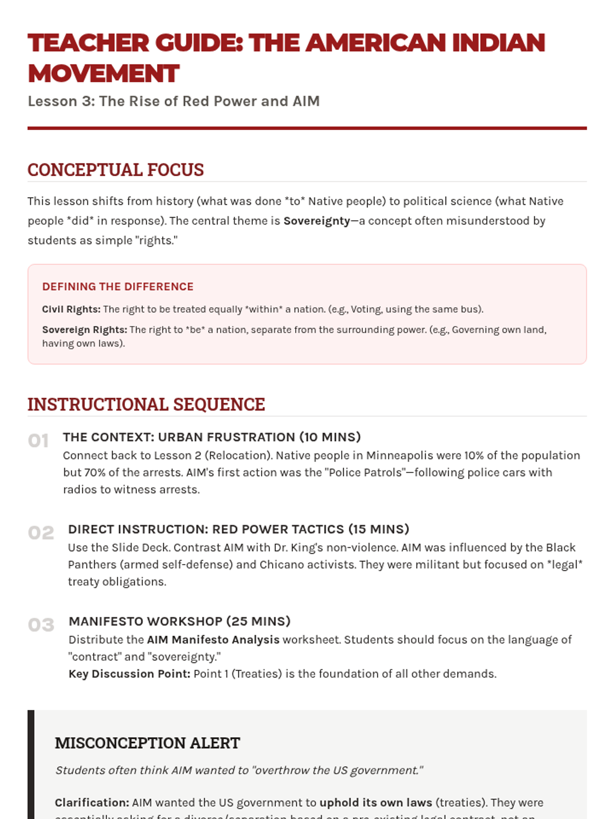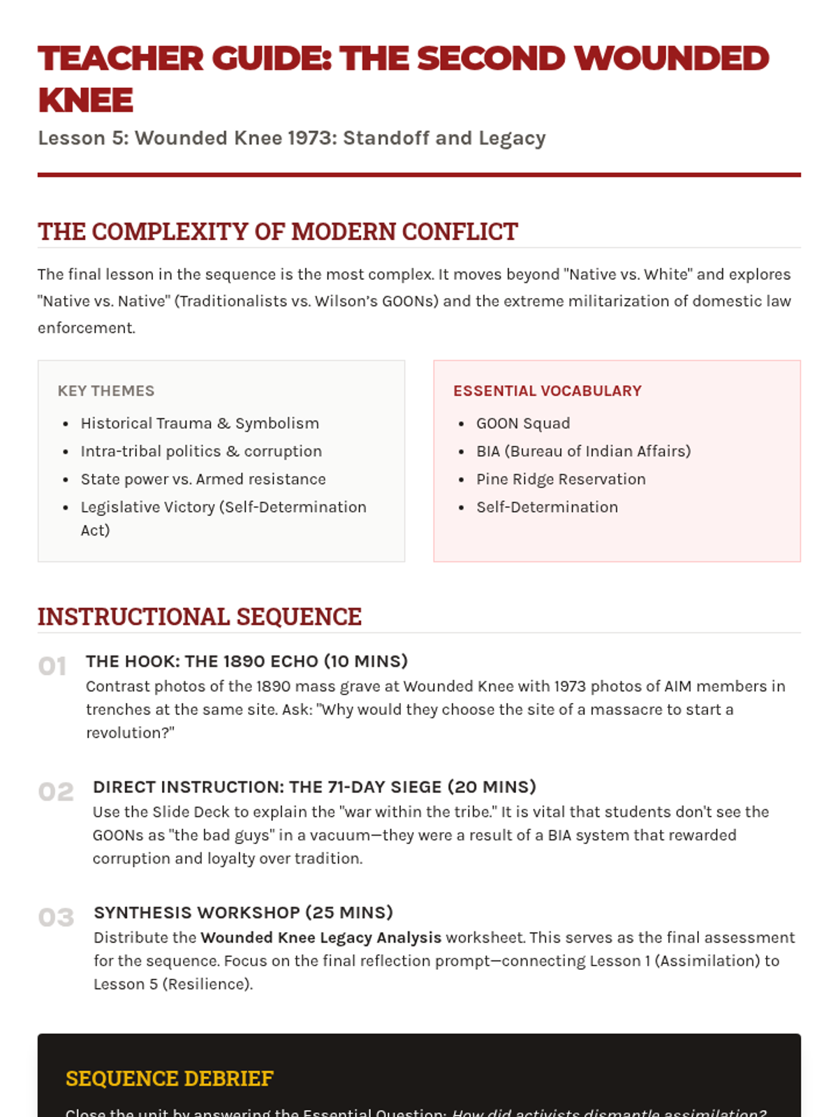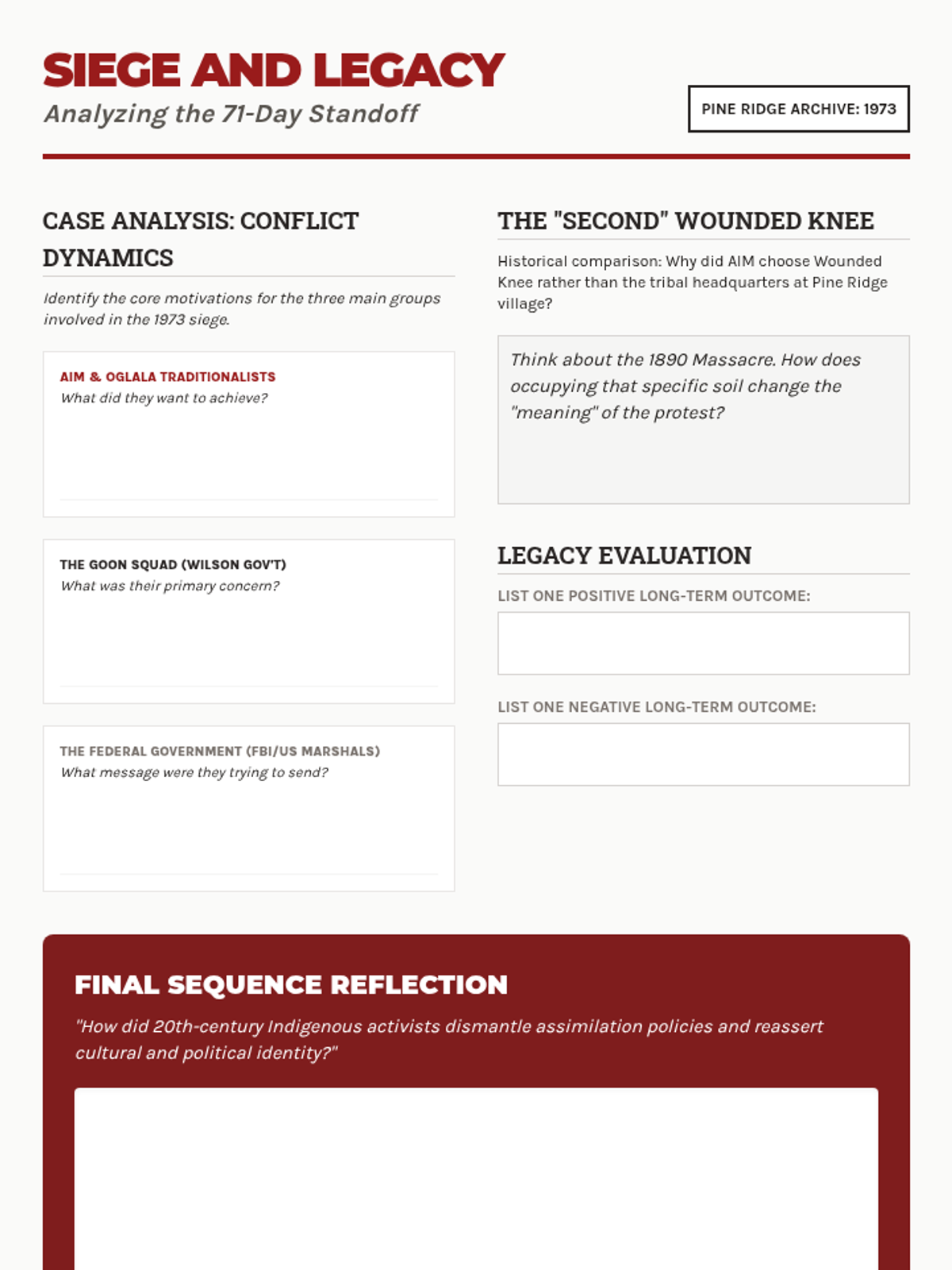 This sequence explores the history of forced assimilation through boarding schools and termination policies, followed by the emergence of the Red Power movement and AIM activism. Students analyze primary sources, oral histories, and major protests like Alcatraz and Wounded Knee 1973 to understand how Indigenous identity was reclaimed.