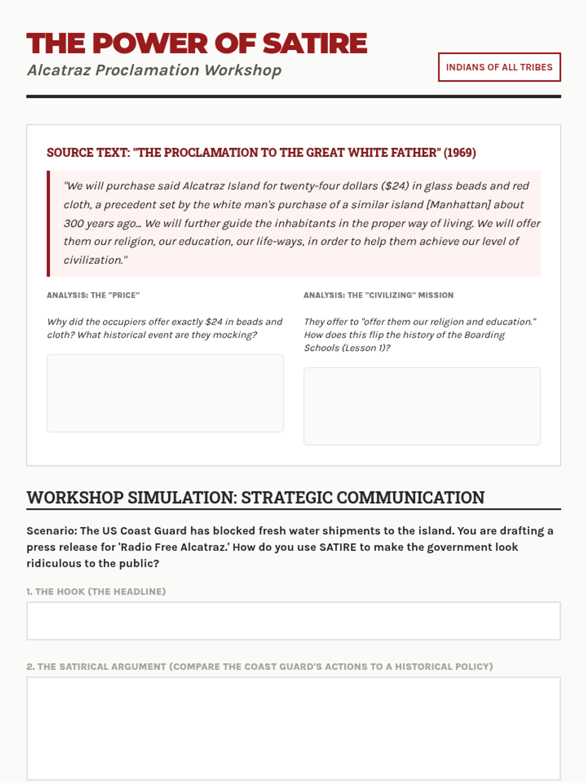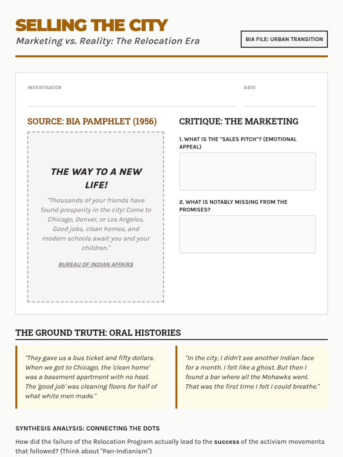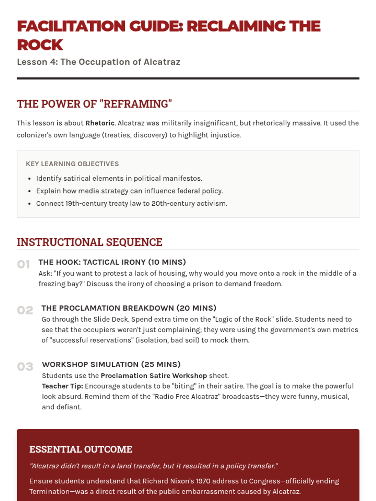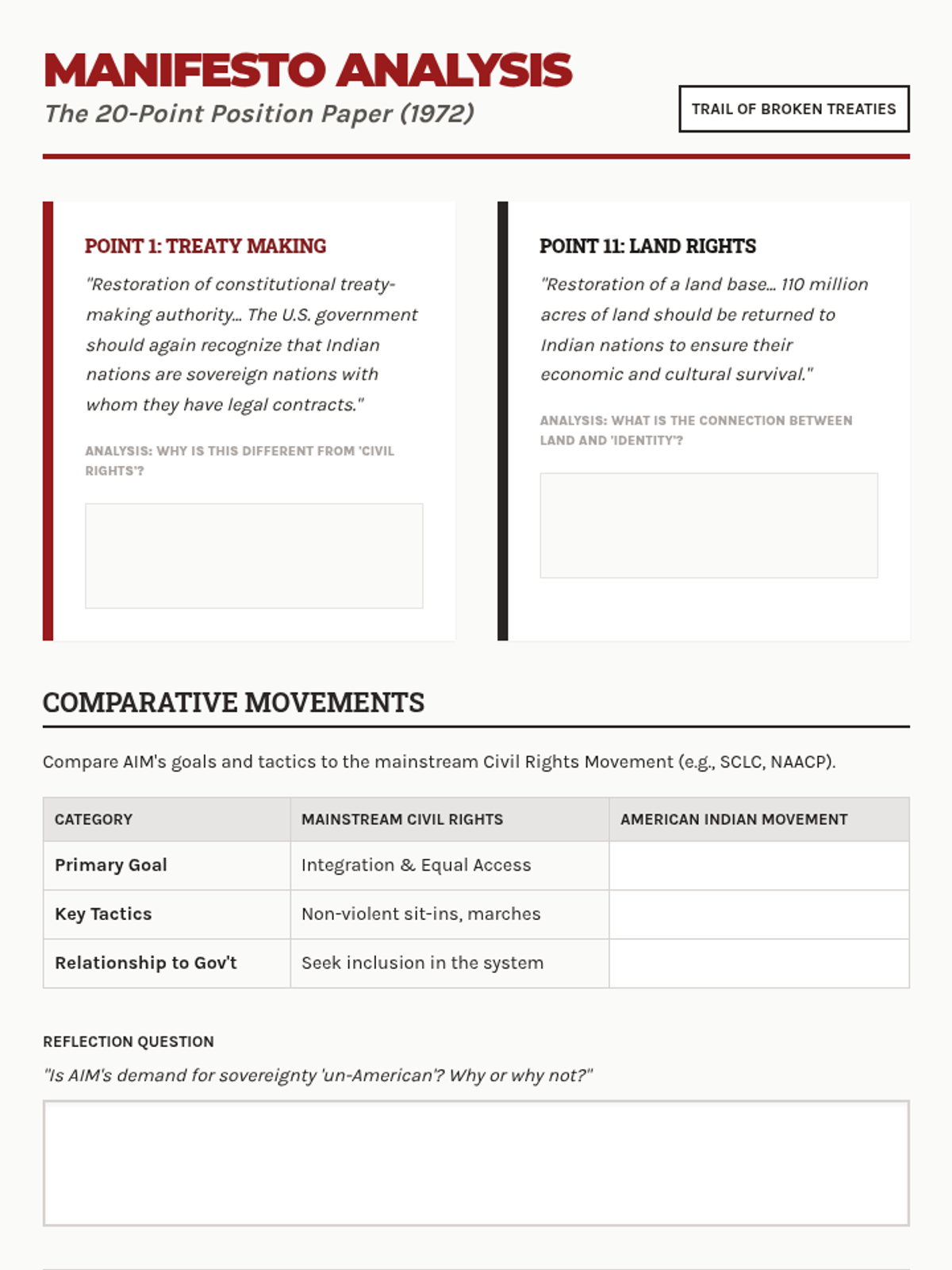 This sequence explores the history of forced assimilation through boarding schools and termination policies, followed by the emergence of the Red Power movement and AIM activism. Students analyze primary sources, oral histories, and major protests like Alcatraz and Wounded Knee 1973 to understand how Indigenous identity was reclaimed.