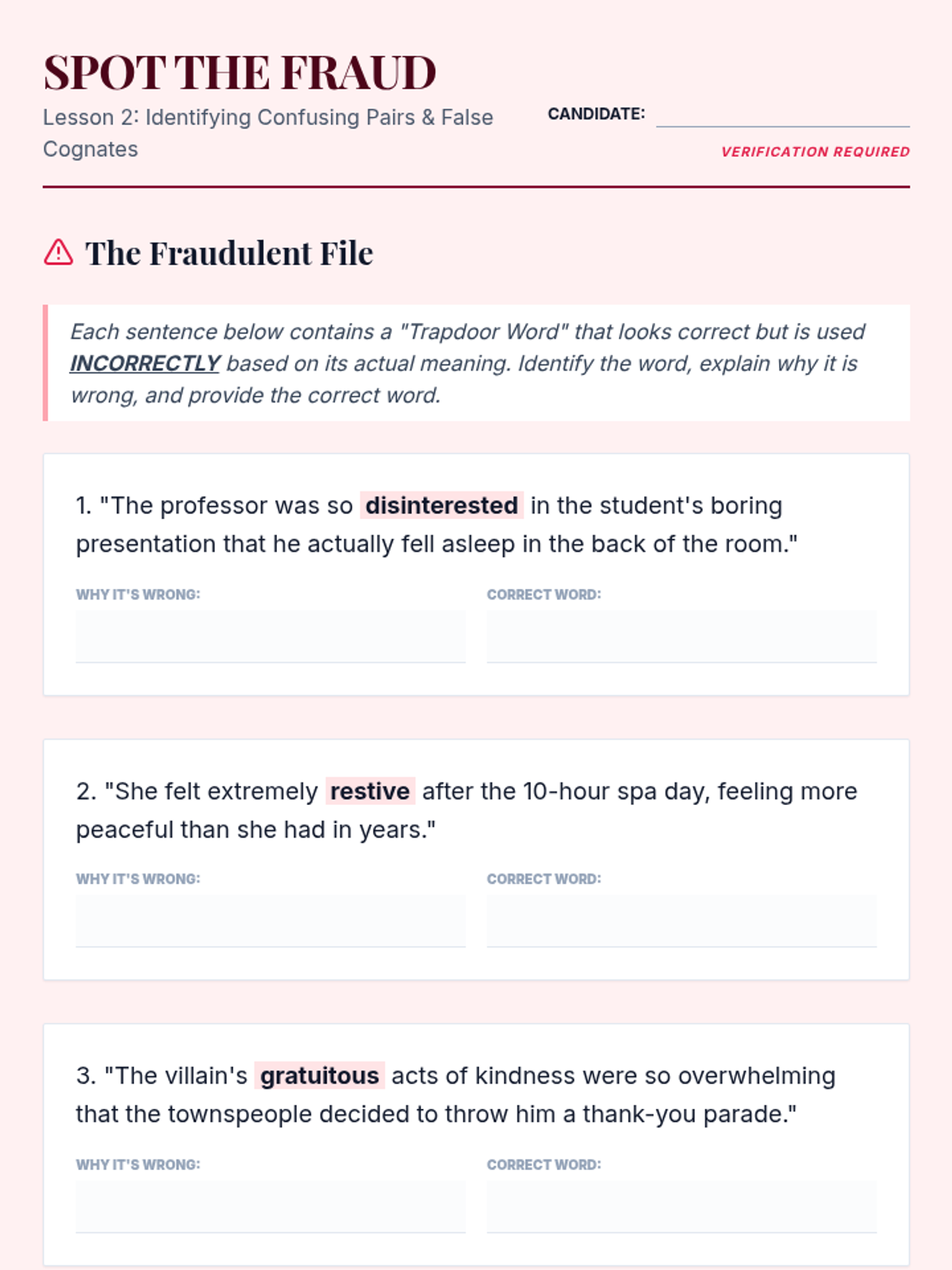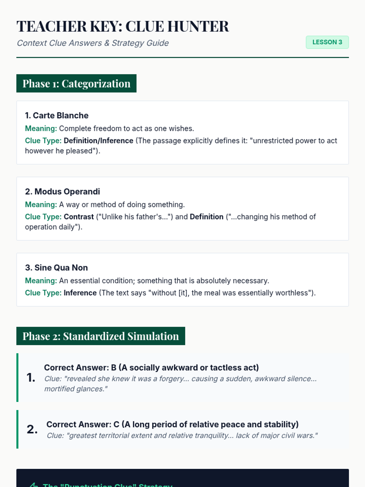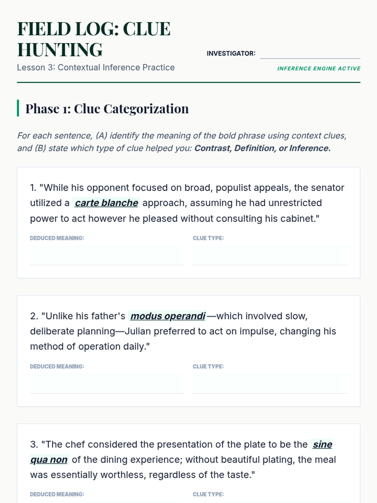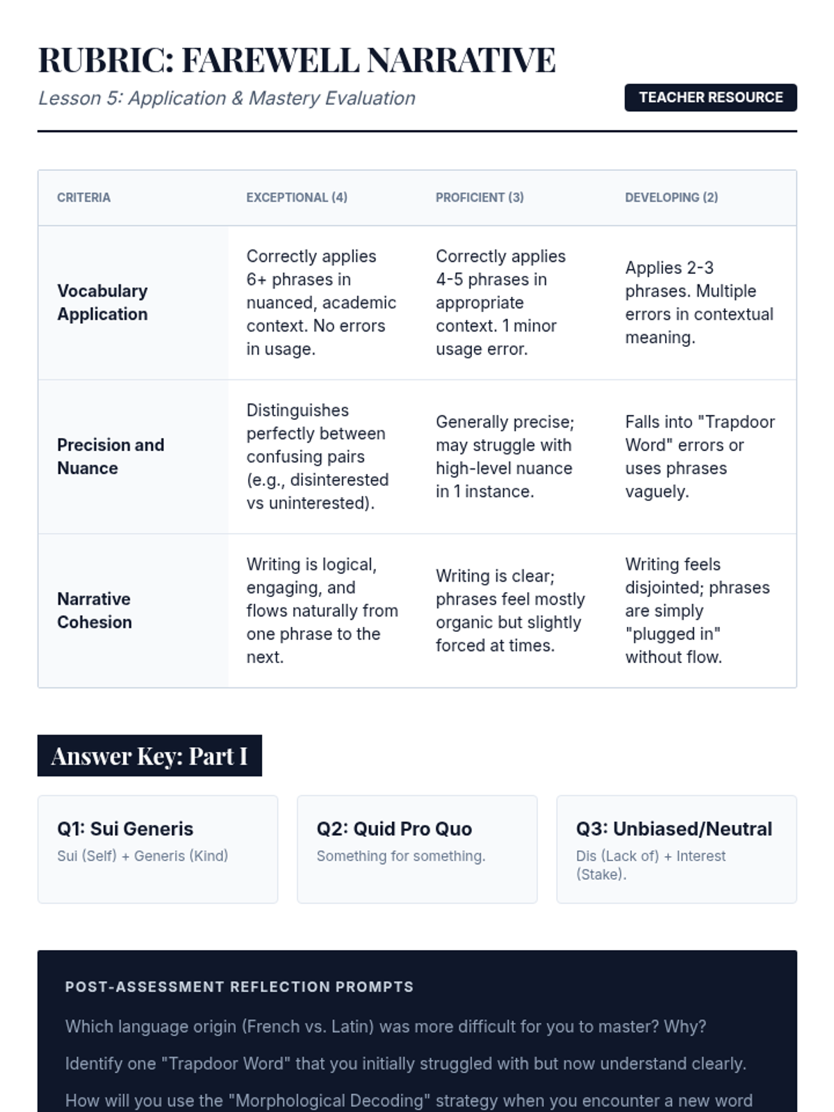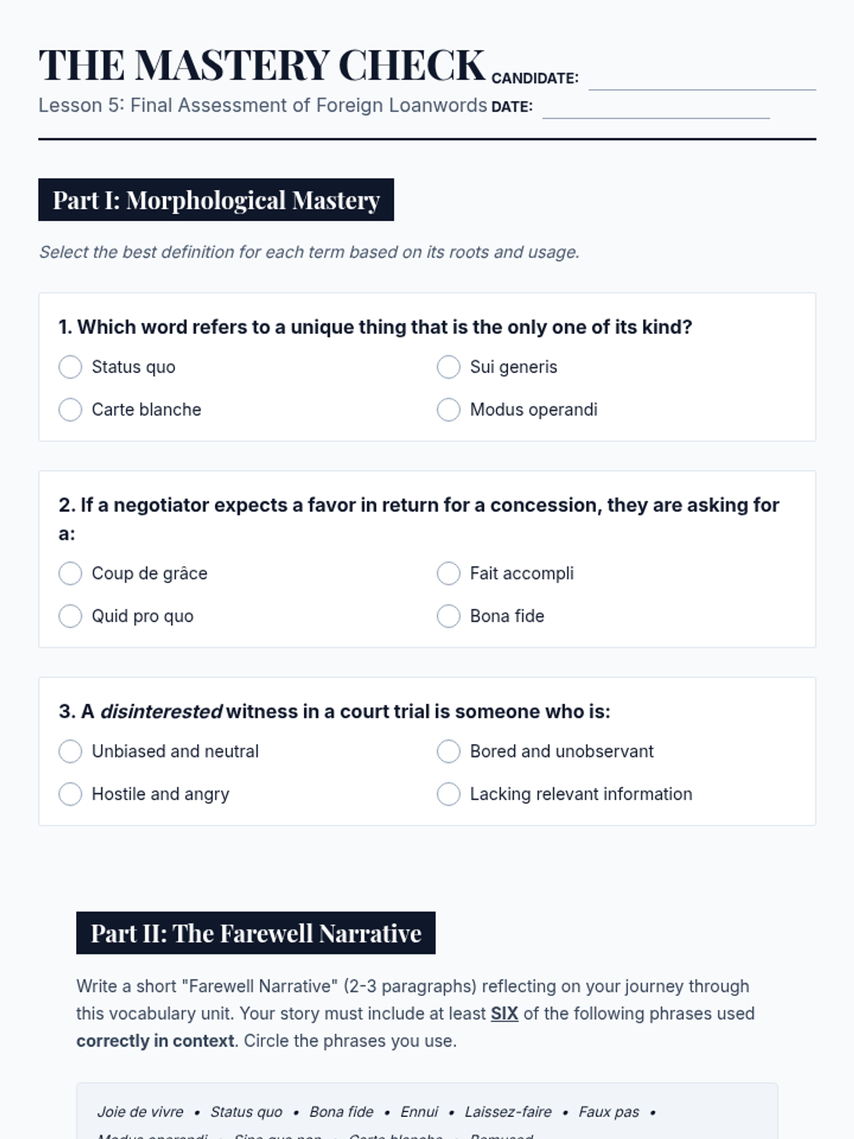 A high-energy, grade 11 vocabulary sequence focused on the mastery of foreign loanwords and expressions common in academic and standardized testing contexts. Students move from morphological analysis to active usage through gamified challenges and systematic practice.