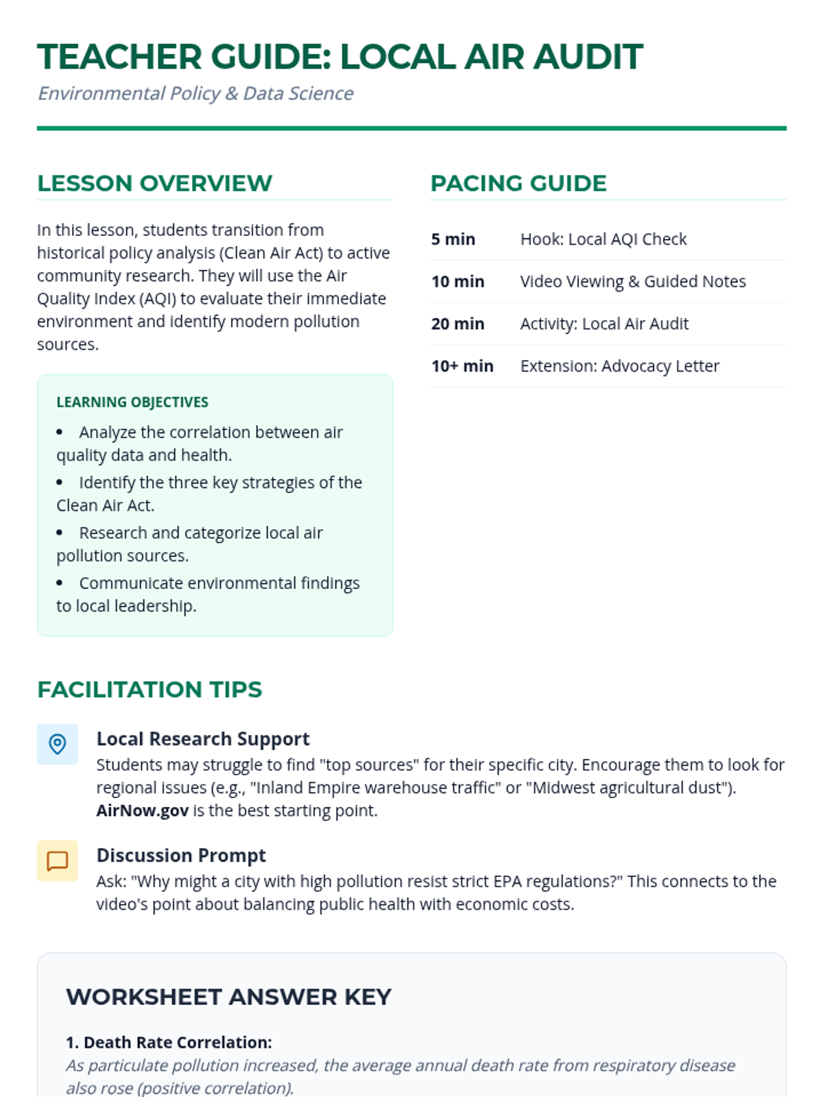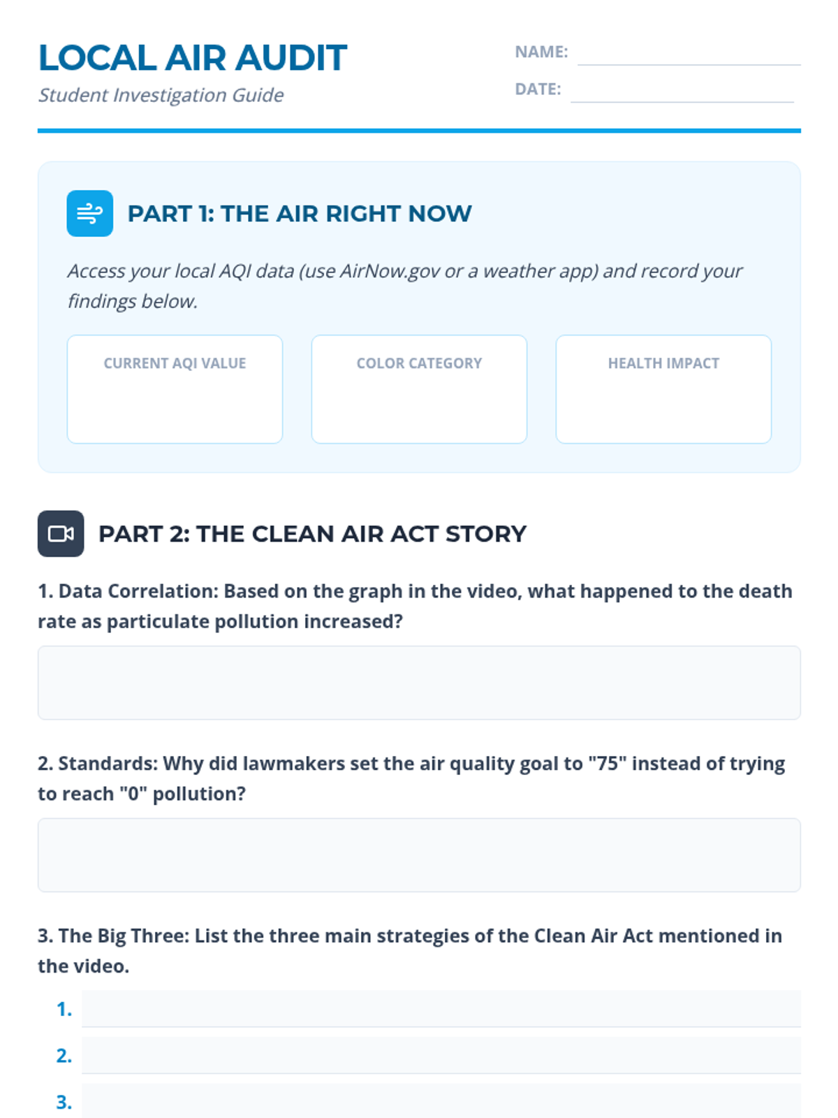This middle school science sequence focuses on the intersection of scientific data, environmental policy, and local air quality. Students will explore the historical context of the Clean Air Act, analyze modern Air Quality Index (AQI) data, and investigate pollution sources in their own communities to understand how science informs law and public health.