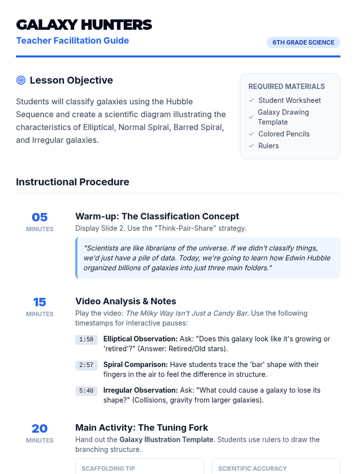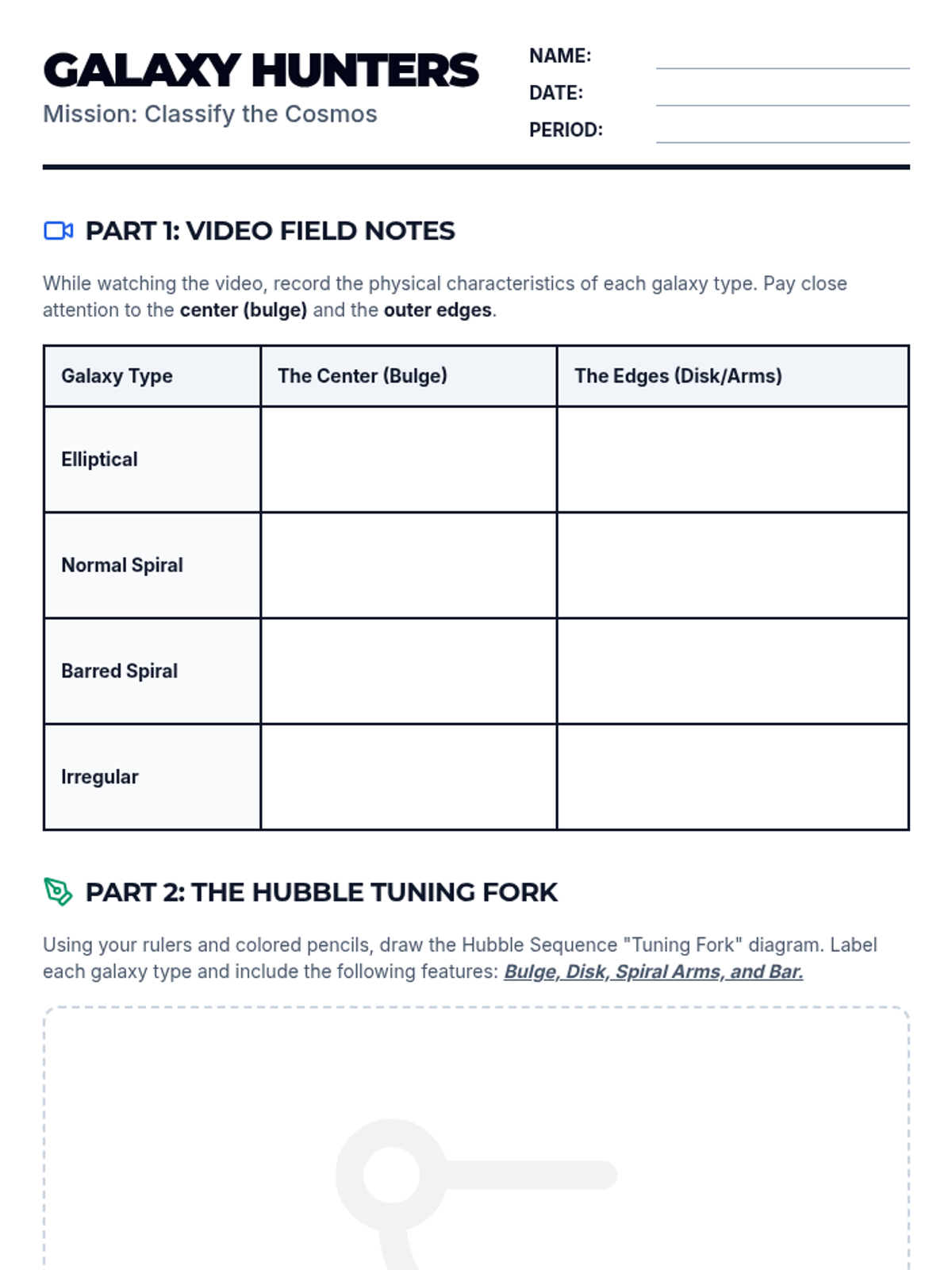 A lesson sequence focused on the classification and structure of galaxies, introducing students to Edwin Hubble's classification system and the unique characteristics of our own Milky Way.
