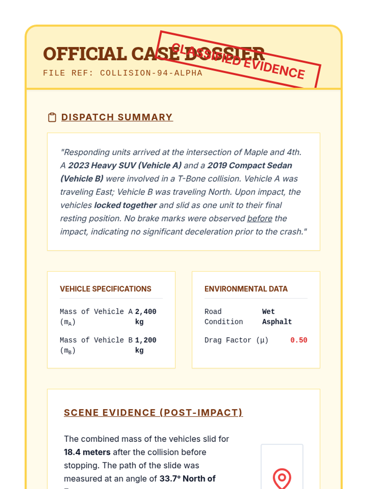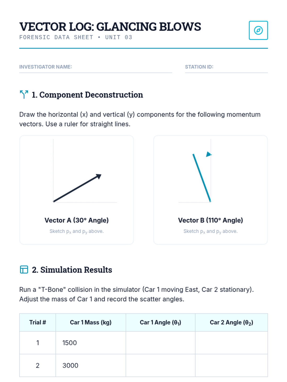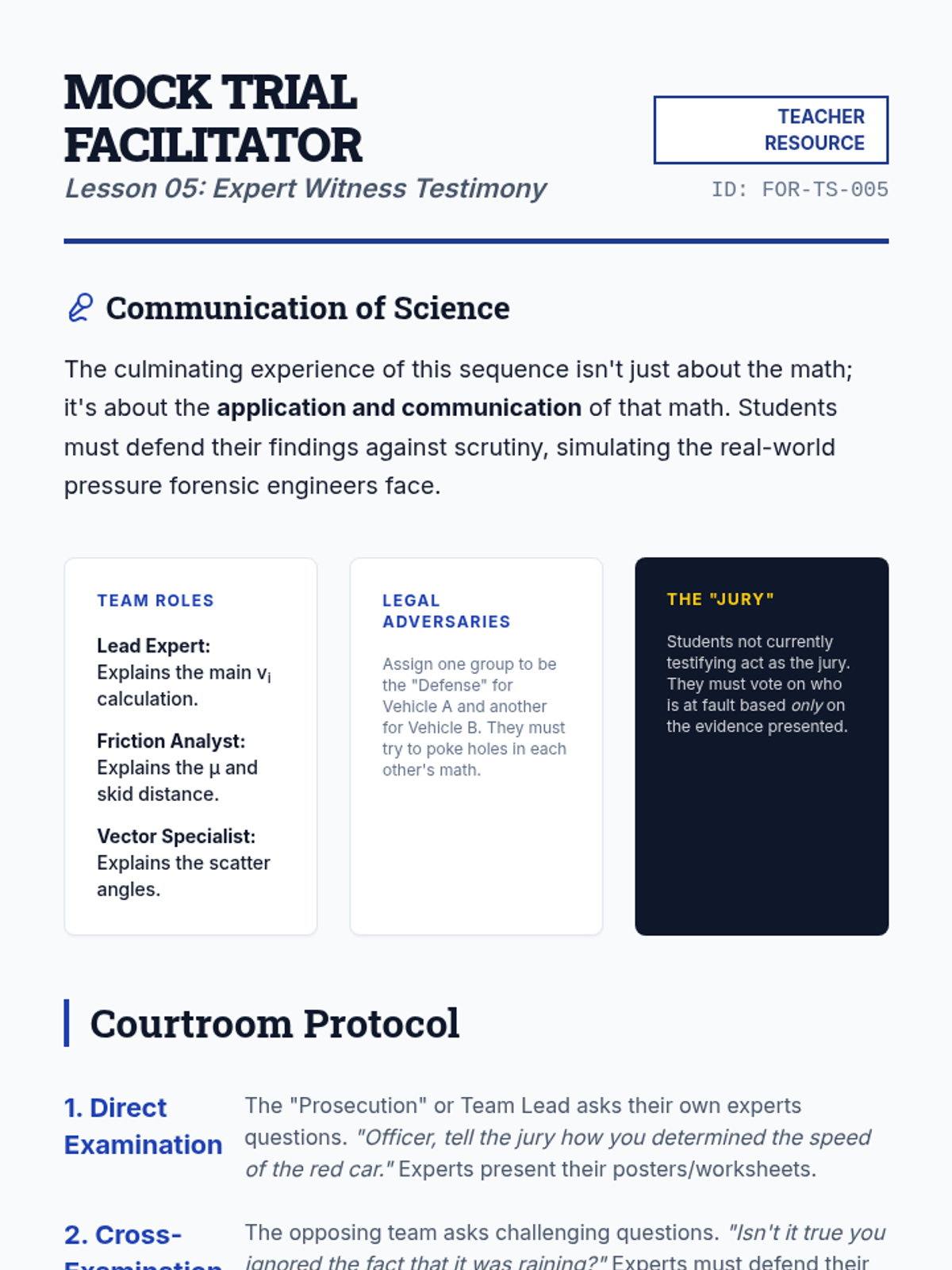 A 10th-grade physics sequence that applies momentum and impulse principles to forensic accident reconstruction. Students take on the role of forensic engineers to determine fault in vehicle collisions using conservation laws.