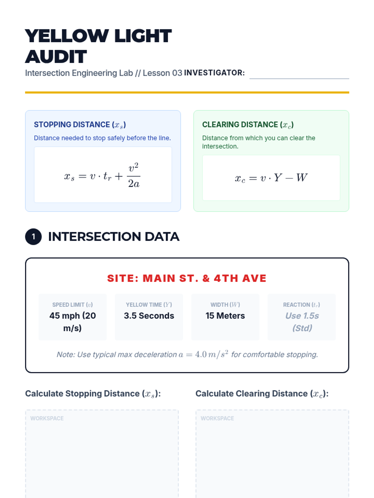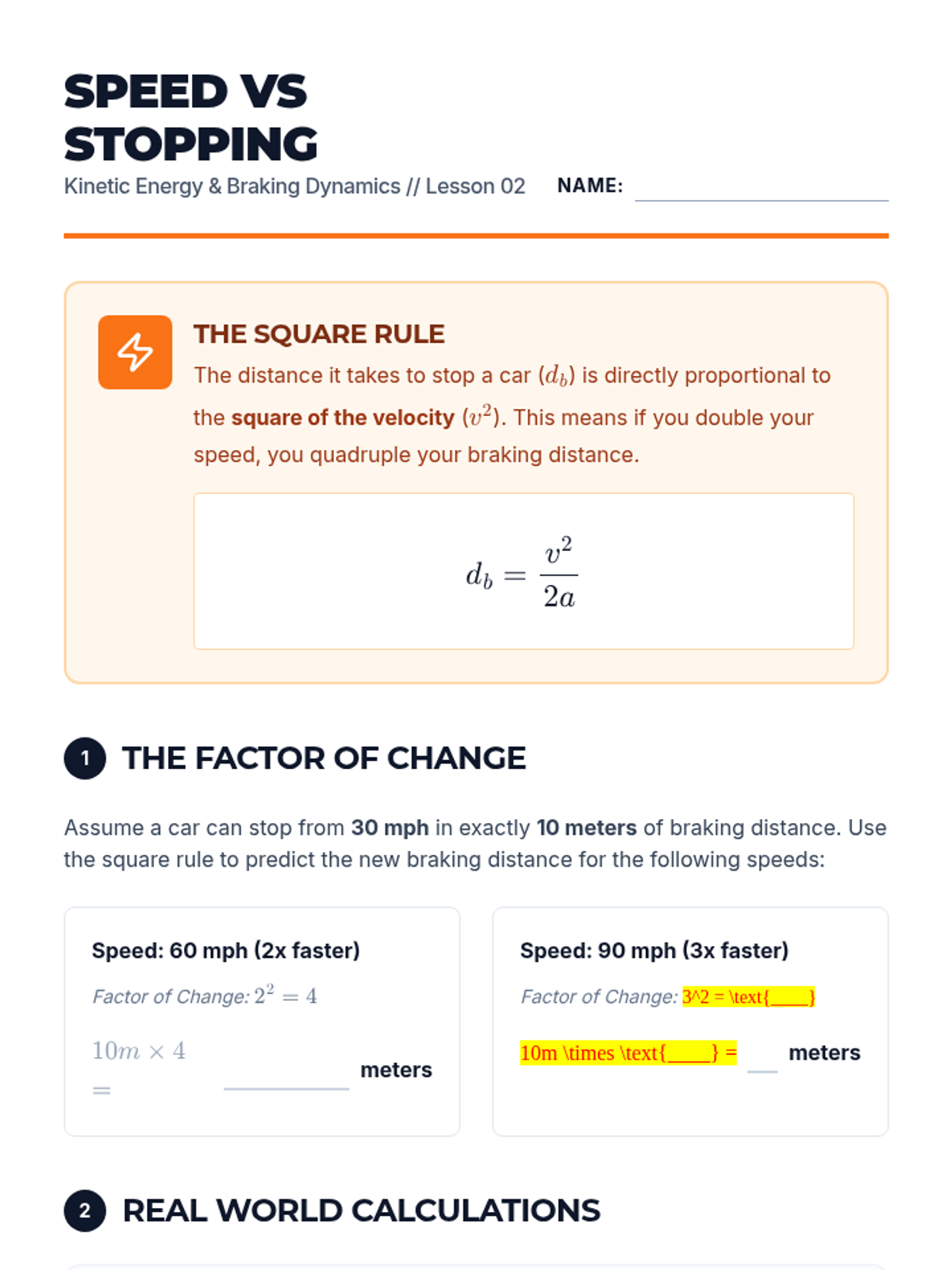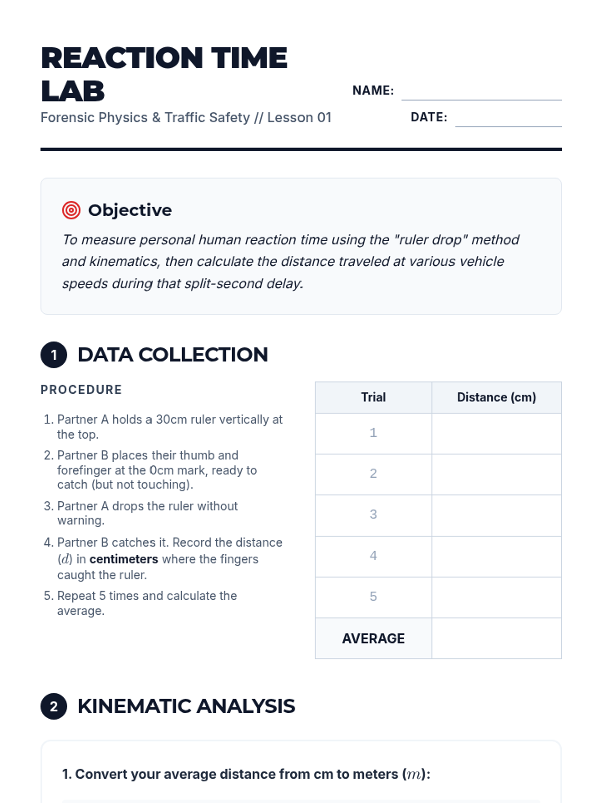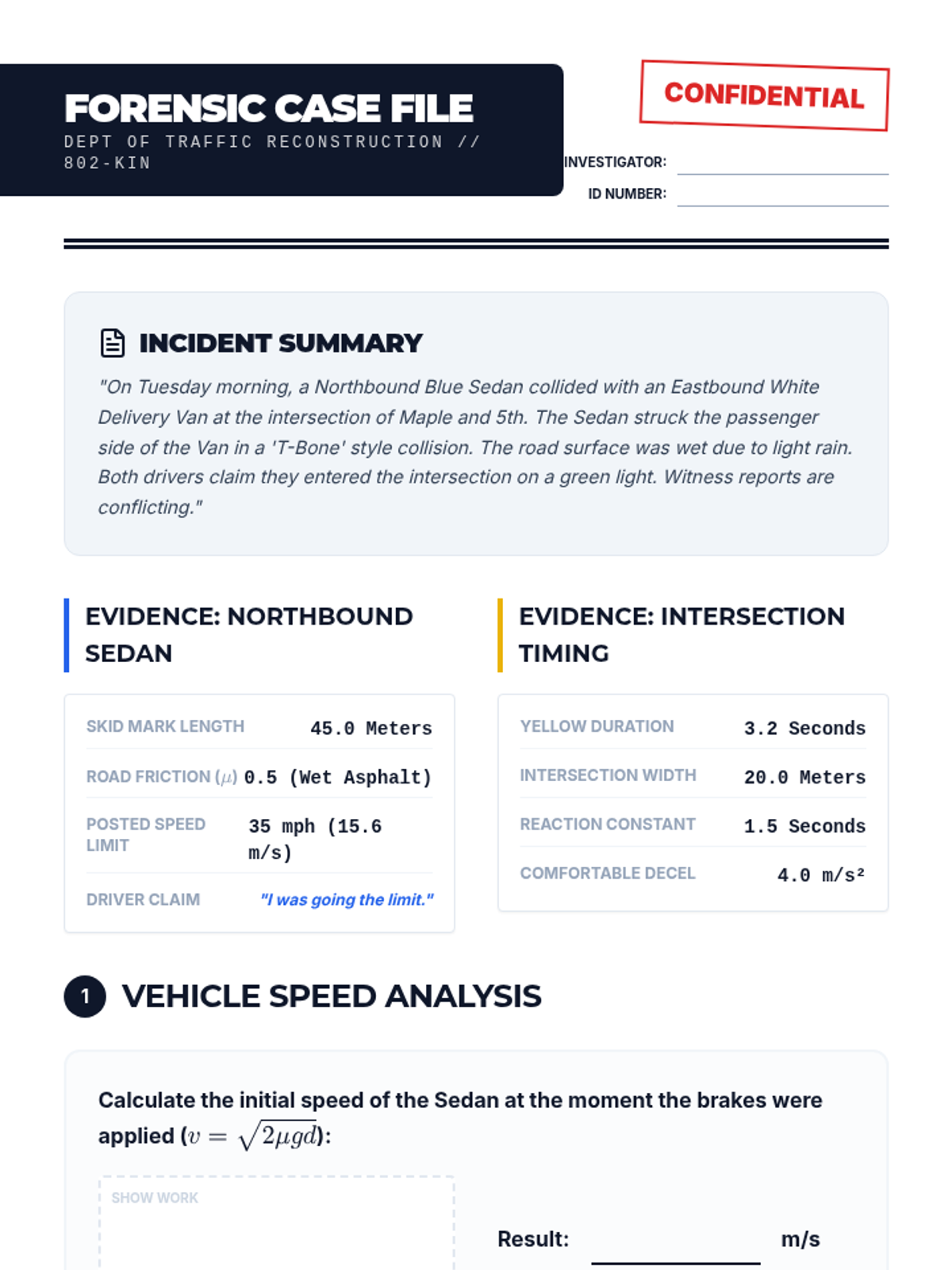 A physics sequence exploring kinematics through the lens of forensic investigation and traffic safety. Students analyze reaction times, braking distances, traffic light timing, and skid marks to reconstruct accidents.